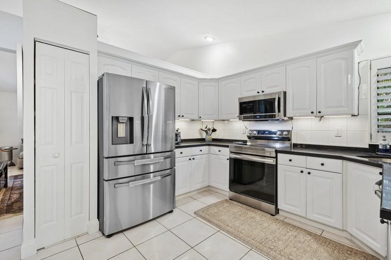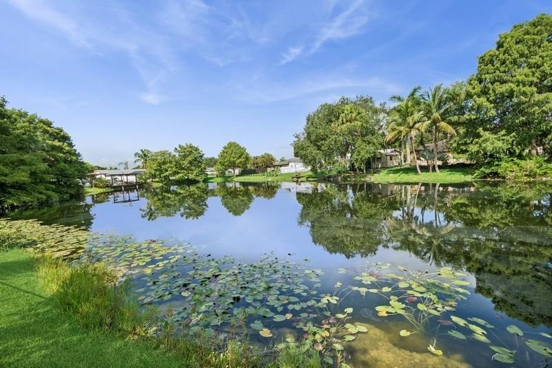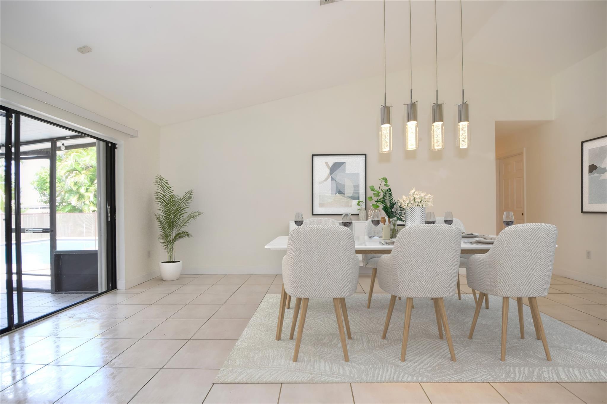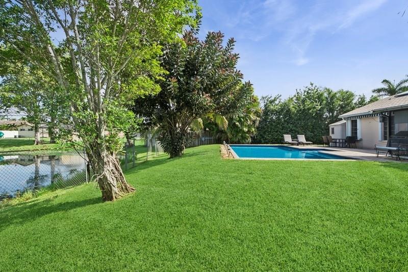 Stunning 3 bed 2 bath home in desirable Orange Tree Lakes in Davie. Plantation shutters adorn all the windows in this spacious well-designed home w/cathedral ceilings in living and dining. Kitchen features newer Samsung appliances and breakfast bar. Primary suite features bath with dual sinks, tub shower, and walk-in closet. The second and third bedroom are good sized with good closet space. Guest bath. Full sized Maytag Washer and Dryer included. Spacious screened room off dining room leads to large sparkling saltwater pool with pavers and gate to access lake. Lovely awning, outdoor lights and shed complete the spacious back yard. Includes 2-car garage with some shelving and solar water heater. No HOA, You may park your RV and/or boat. Excellent school system. Lake water feeds sprinkler.