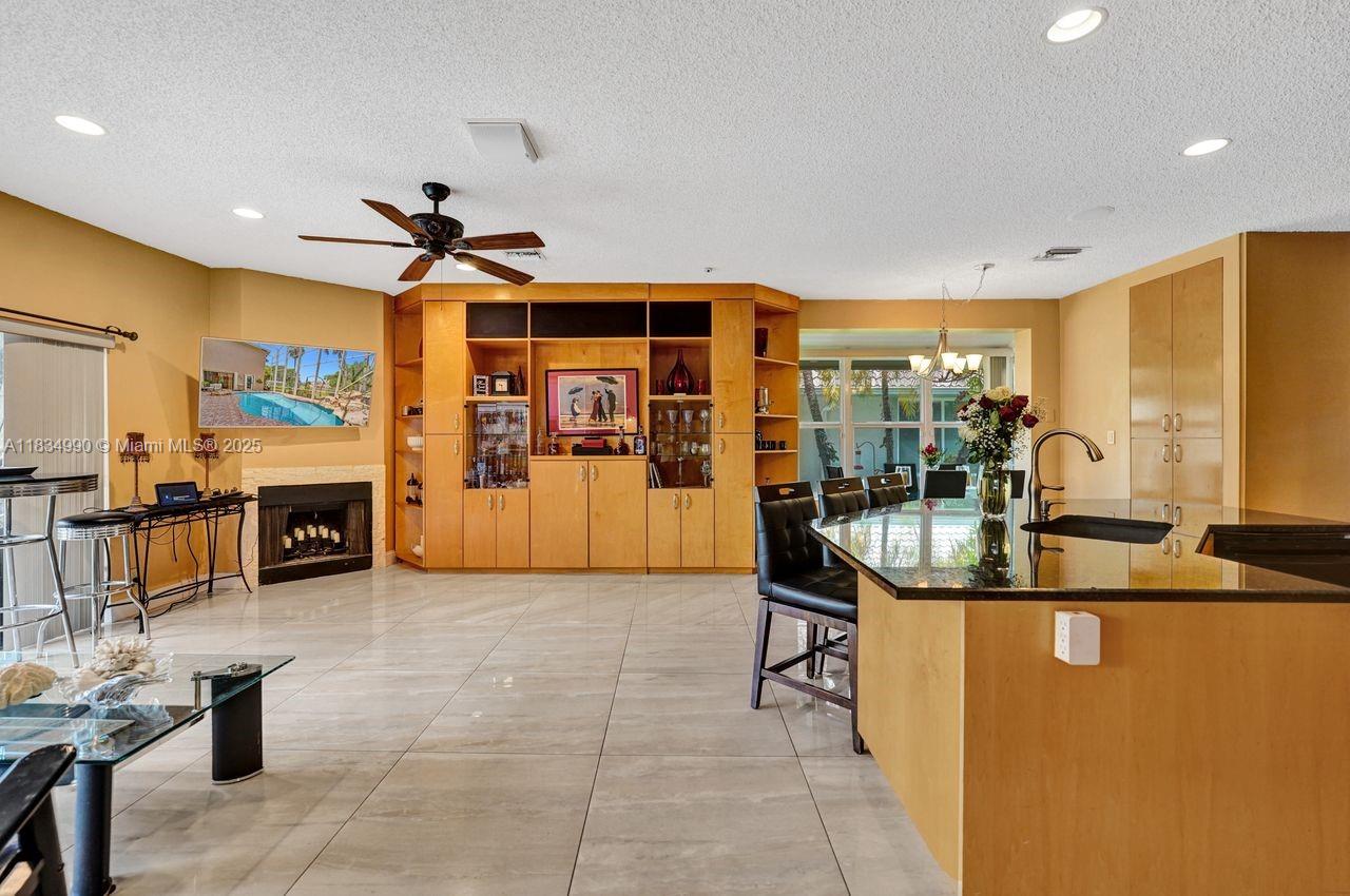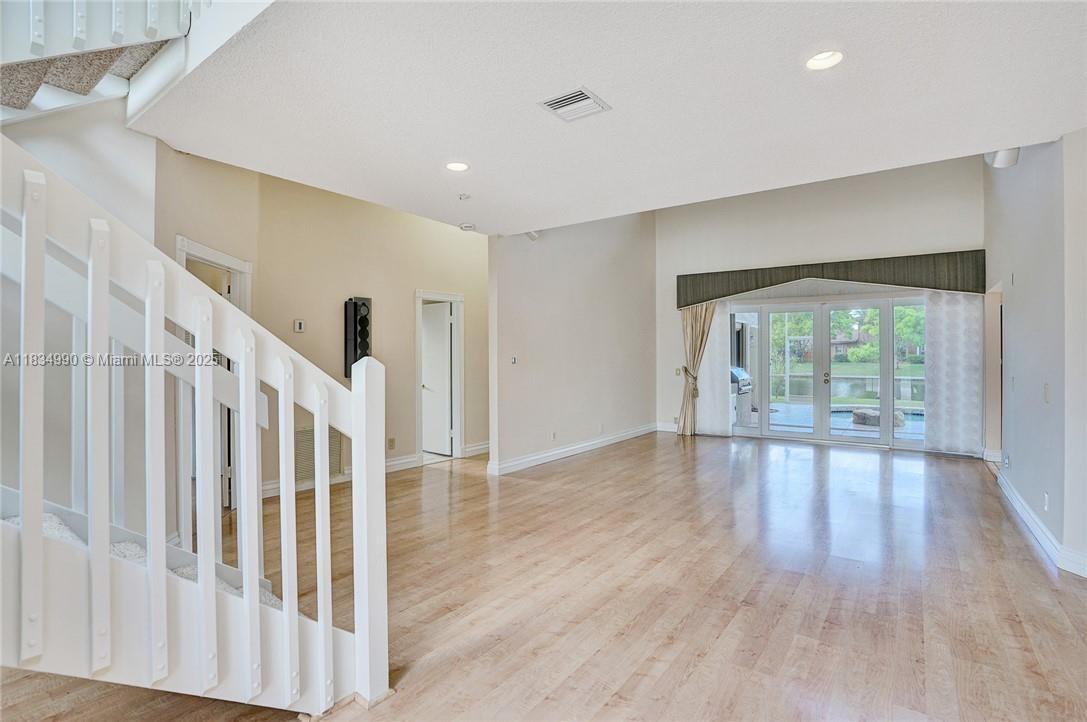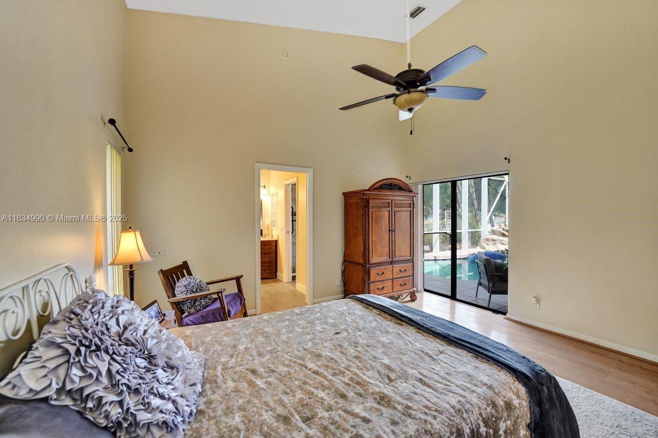 Tucked away on a quiet cul-de-sac in Jacaranda Cove, this stunning waterfront home offers a total of 3700 sq ft of elegant living on an expansive 11,200 sq ft lot. Featuring 5 bedrooms and 4.5 baths, including two spacious en suite master suites—one upstairs and one downstairs—this layout is ideal for multigenerational living. Enjoy soaring ceilings, abundant natural light, and open living areas. The main-level master opens to a screened patio with a 25-ft pool and waterfall. Highlights include some impact windows, accordion shutters, a newer A/C (2019), a loft, and an open and spacious kitchen with a granite island…Discover this rare gem before it's gone…