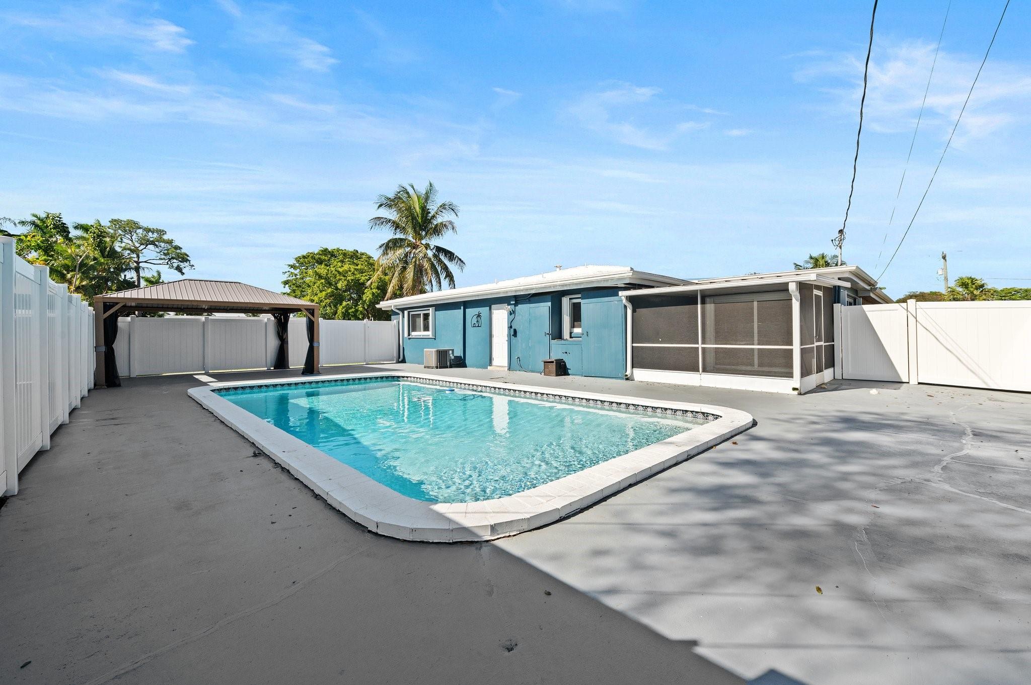 Welcome to your dream home! This beautifully maintained mid-century modern gem blends timeless style with today’s conveniences. Fully move-in-ready, it features a lifetime roof with transferable warranty, new A/C and ductwork, impact windows with hurricane shutters, new pool pump, water heater, ceiling fans, window treatments, and toilets in both bathrooms. The renovated carport adds charm and function. The primary suite opens directly to a private backyard oasis with an inviting in-ground pool—perfect for relaxing or entertaining under the Florida sun.