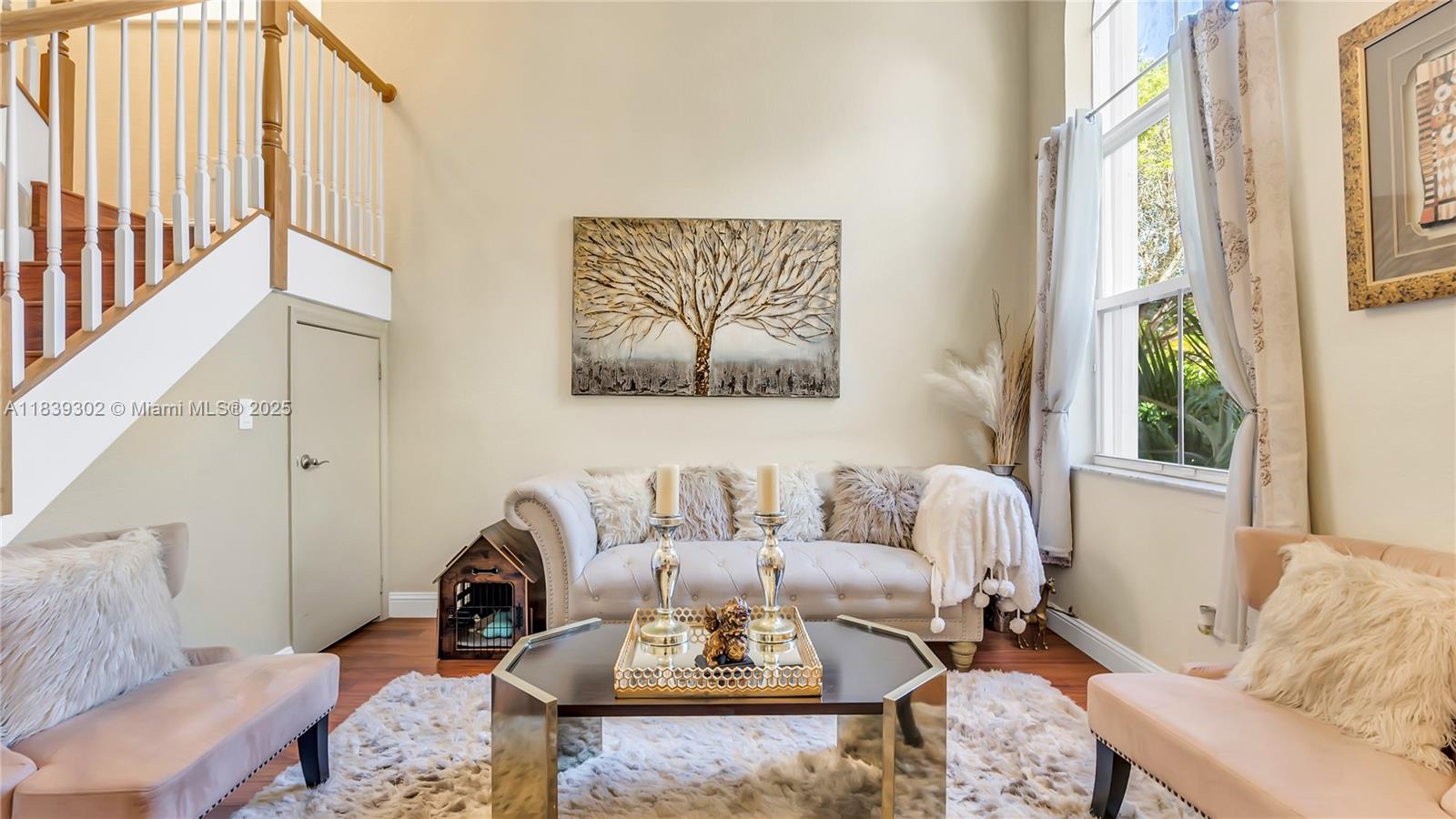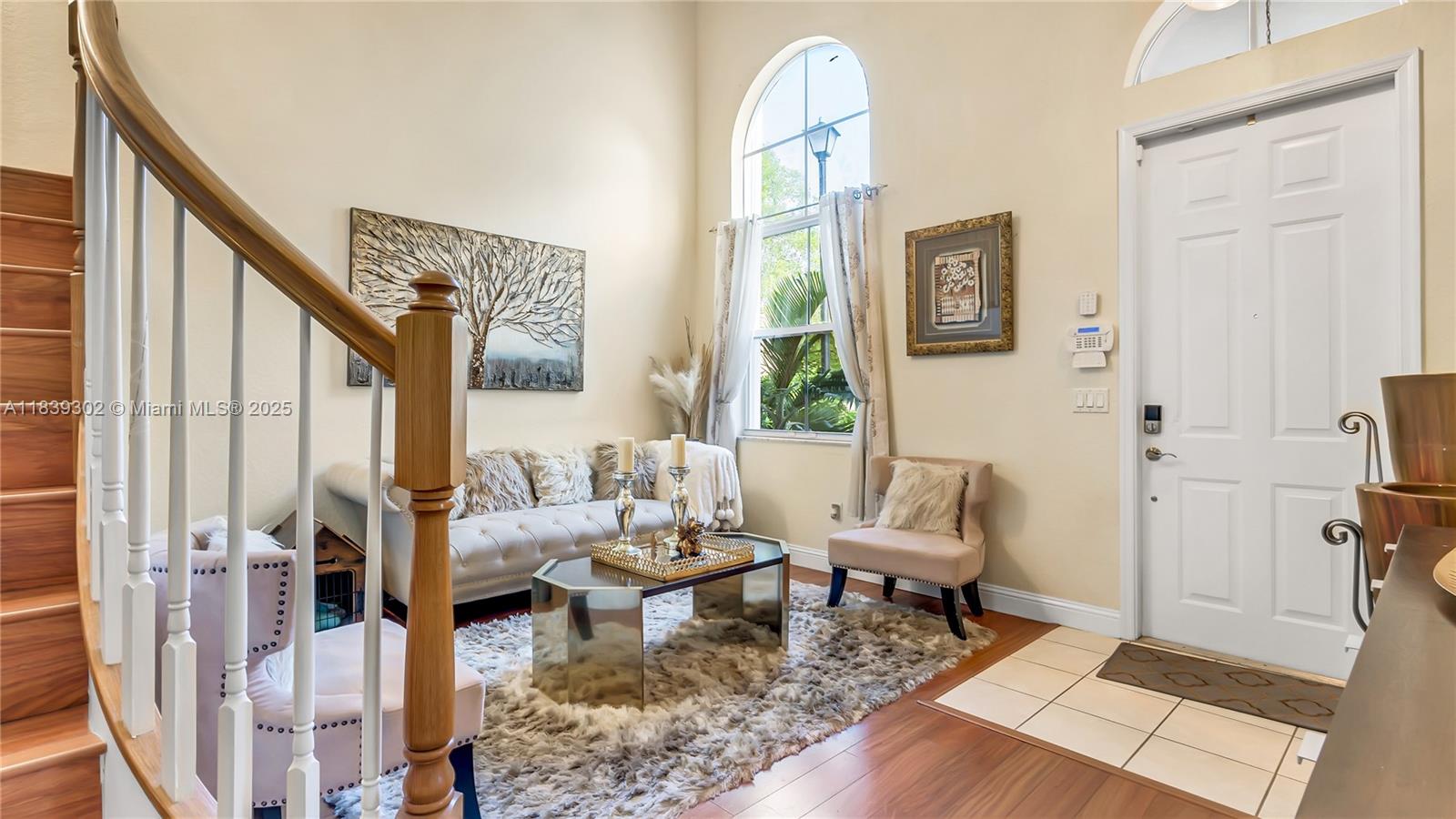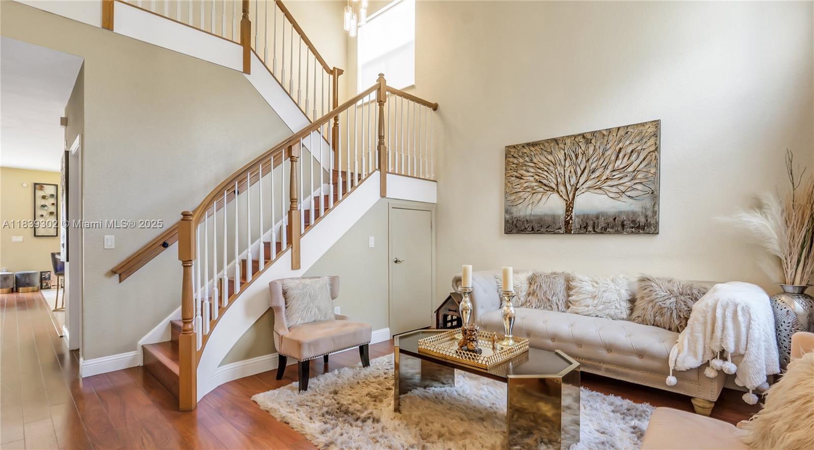 Welcome to this elegant 4-bedroom, 2.5-bath home nestled in a beautifully maintained community. This two-story residence offers a spacious and inviting layout with soaring ceilings, abundant natural light, and stylish wood flooring throughout the main living areas. The formal living room features a dramatic double-height window and graceful staircase, creating a grand first impression. Enjoy a well-appointed kitchen and separate laundry room with modern appliances. All bedrooms are located upstairs, providing privacy from the living spaces. The primary suite includes ample closet space and a comfortable layout for relaxing. Additional features include a powder room on the main level, a two-car garage, and a fenced backyard with mature landscaping.