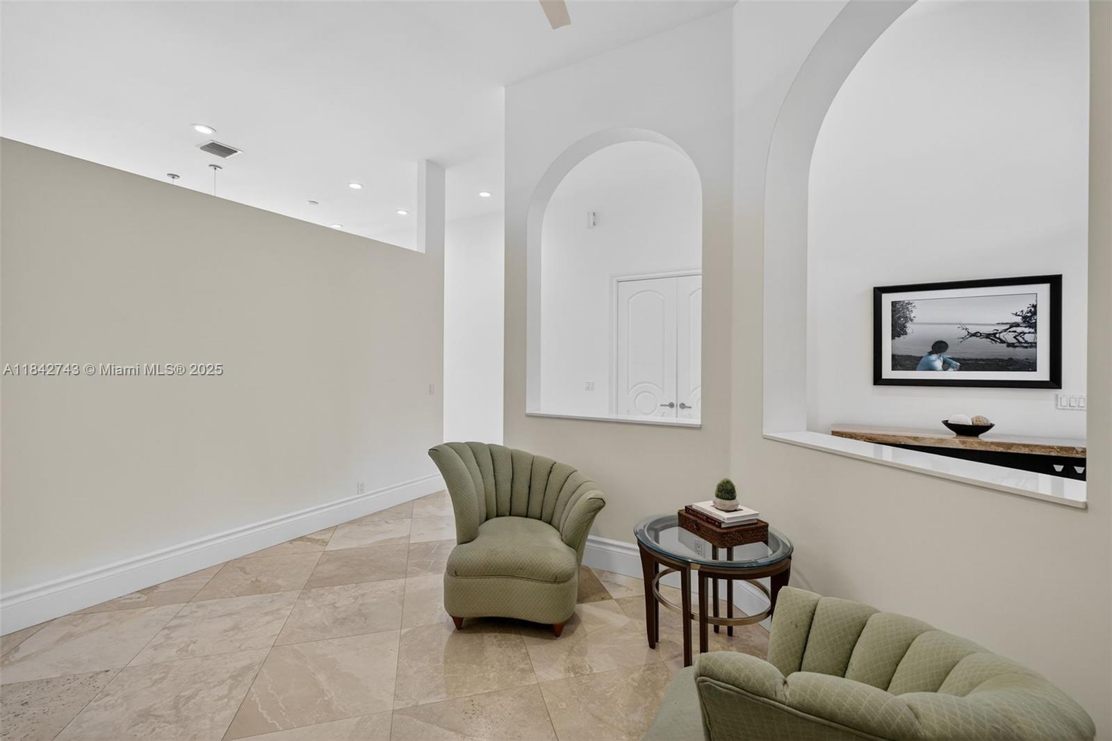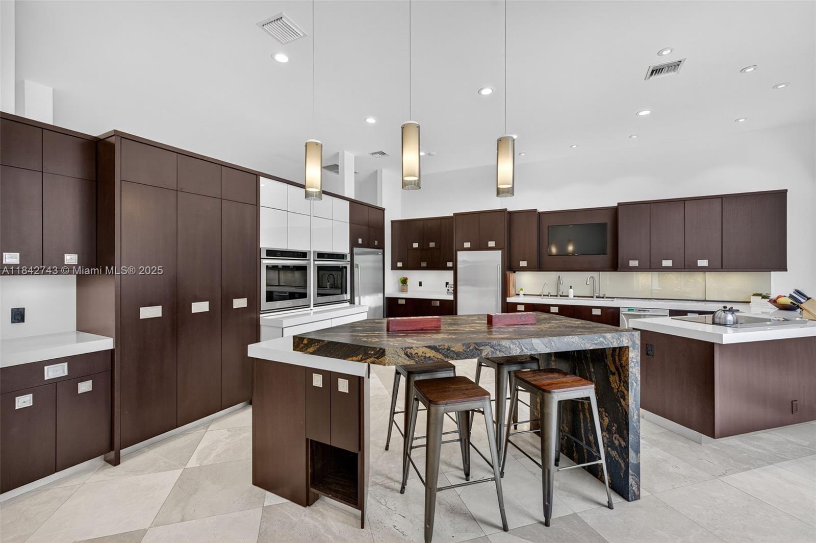Located in a quiet, pet-friendly neighborhood with 24-hr manned gate and walkable access to the town center, this 4/3 features a Grand foyer, high ceilings and marble floors. Open kitchen with quartz counters, granite tabletop, prep sink, full-length appliance garage, retractable island, pull-out pantry, induction stove, double ovens, soft-close drawers, and built-in hutch. Master suite has flex room, sound-buffered walls, soaking tub, dual shower heads, floating furniture, and floor-to-ceiling closets. Guest suite is also sound-buffered. Living room features impact picture windows and floating TV unit. Wired for ceiling speakers. Accordion shutters, tinted windows, fenced yard, 3-car garage with workbench. Community has basketball, volleyball, and playground.