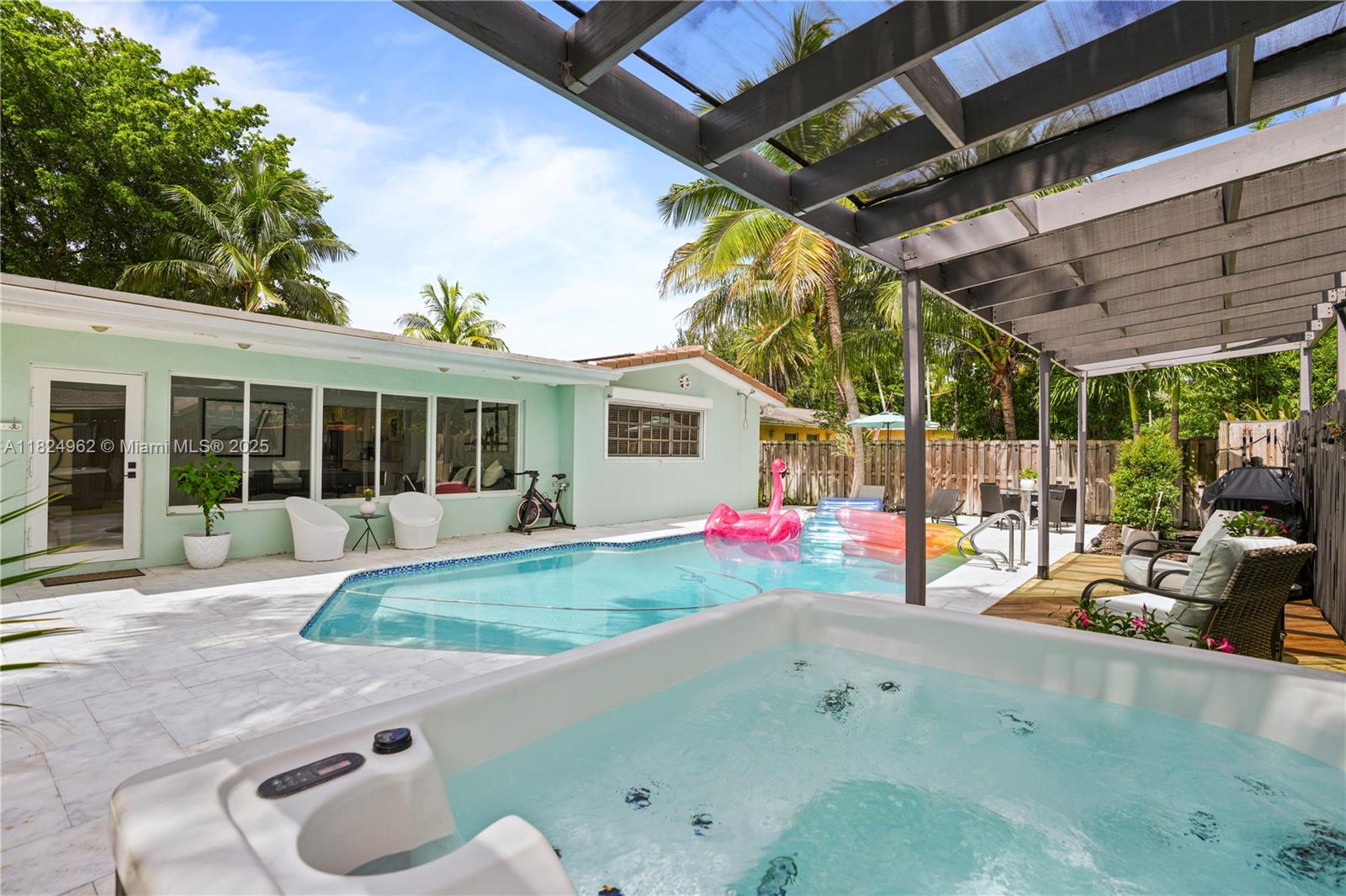 Stunning 3-bed, 2-bath home in the heart of Hollywood with no HOA. Enjoy a private fenced backyard with a pool, deck, hot tub, and a new covered patio—perfect for relaxing or entertaining. Inside features a bright open layout, a modern kitchen with stainless steel appliances, and elegant marble tile floors throughout. The spacious primary suite includes dual sinks, stylish vanities, and a custom walk-in shower. Includes a two-car garage. Ideal as a primary residence or Airbnb investment. Located just blocks from shops and dining on Hollywood Blvd and minutes to I-95. A rare find in a high-demand area—schedule your showing today!