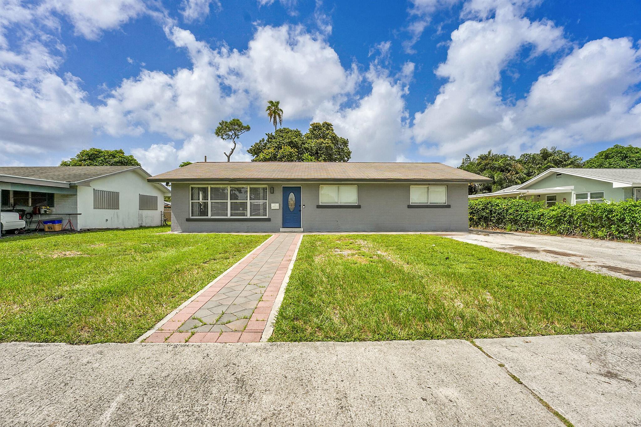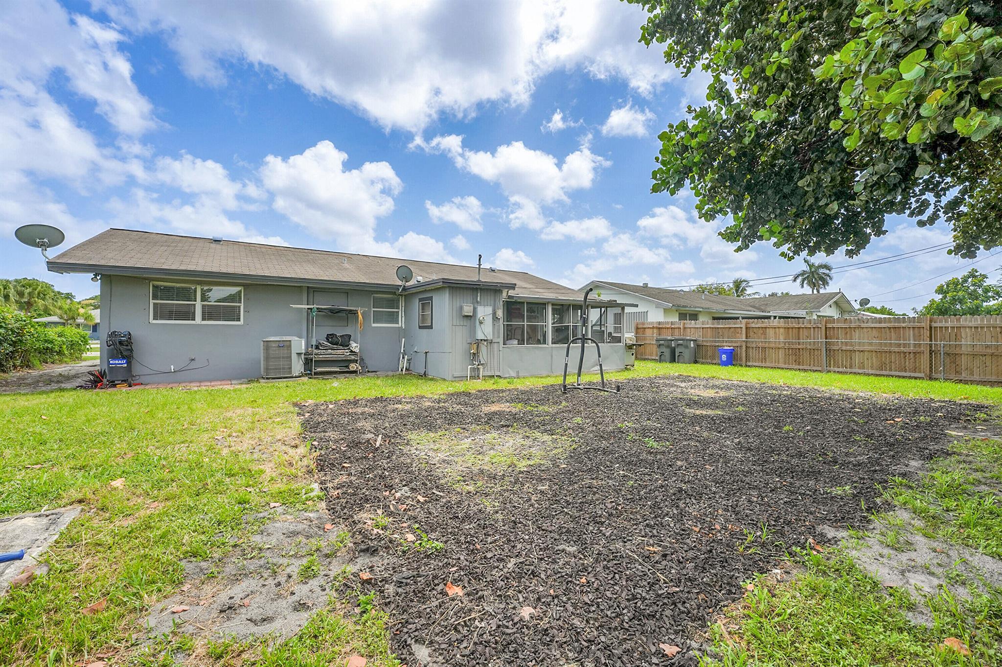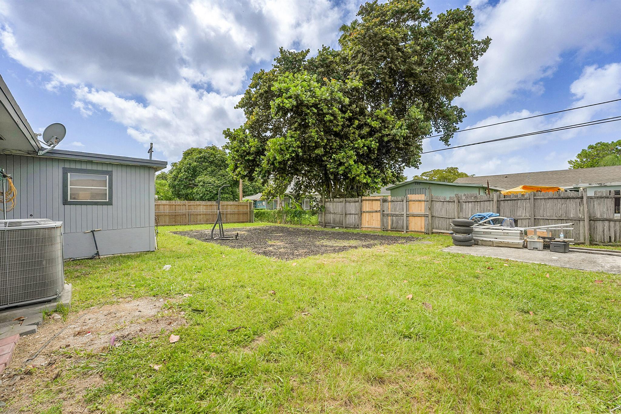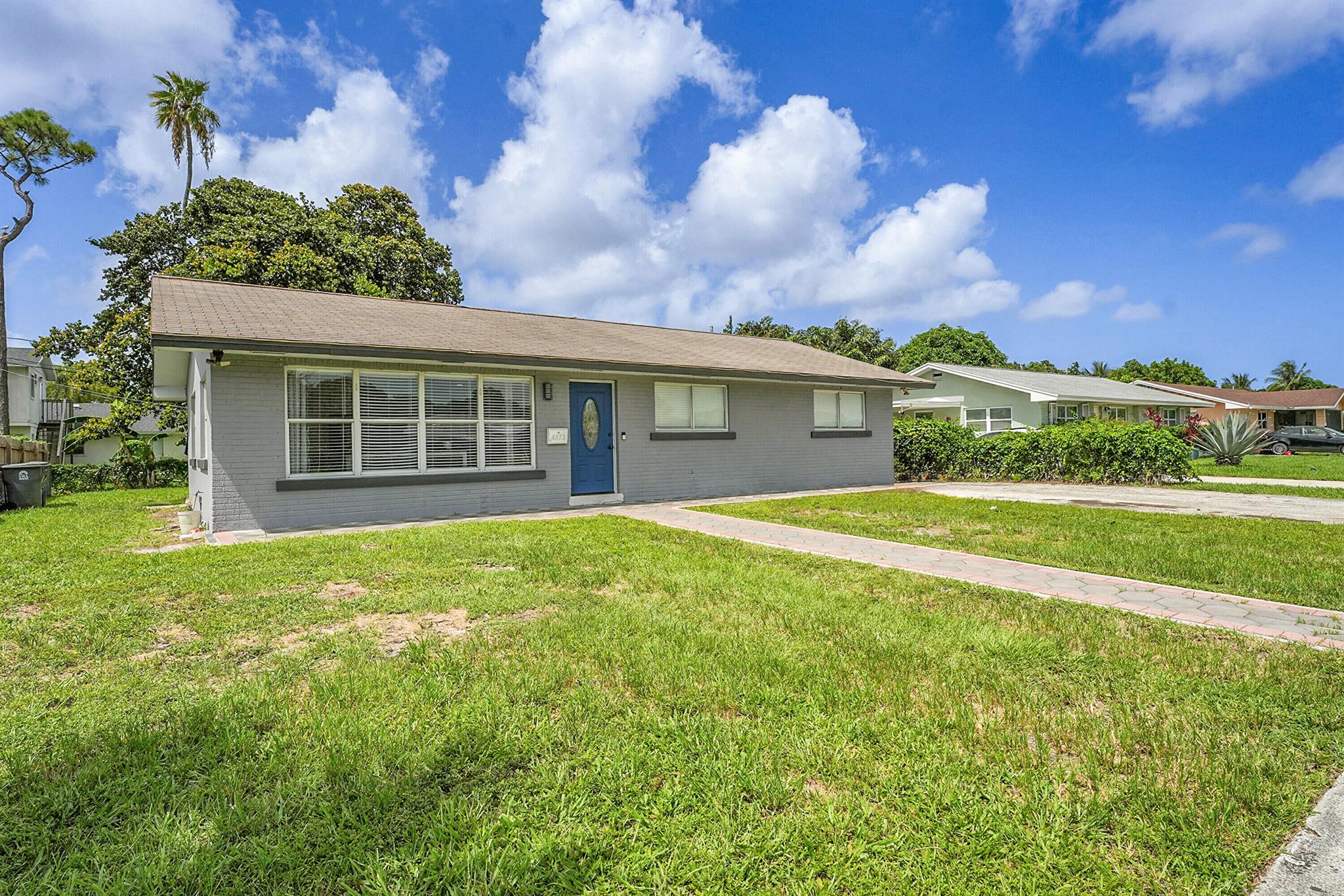 Welcome to this beautifully remodeled and upgraded 3 bedroom, 2 bathroom single story home located in the desirable Knotty Pine Acres community of West Palm Beach. Set on a spacious .17 acre lot with no HOA, this home offers a bright open floor plan with tile flooring throughout and a modern kitchen featuring a central island, pantry space, and upgraded stainless steel appliances. The layout flows easily into the living and dining areas, creating an inviting space for everyday living or entertaining. Both bathrooms have been tastefully renovated, and the home is equipped with storm shutters, central air conditioning, and ceiling fans. Outside, enjoy a spacious covered patio and a large fenced backyard with private garden views - perfect for relaxing or entertaining. Great location!