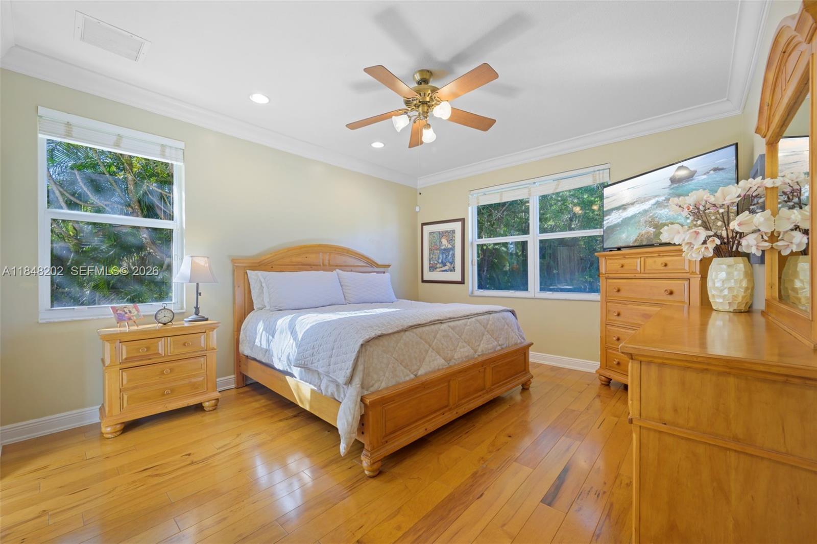 Gated 2.24 acre estate in exclusive Sunshine Ranches offering unmatched privacy, space, and tropical luxury. This 7 bedroom, 6.5 bath hacienda style residence (including a den) also features a separate office, wood and tile flooring, crown molding, and generous living areas filled with natural light. The fully fenced grounds are a true tropical paradise professionally landscaped with over $300K in mature palms and exotic plants, plus over $20K in custom outdoor lighting. Outdoor highlights include an expansive travertine deck, scenic walking trails, and a tiki hut overlooking a serene private lagoon. Additional features include a 4 car garage, whole house generator, 500 gallon underground propane tank, and security cameras. A rare find in prestigious Southwest Ranches.