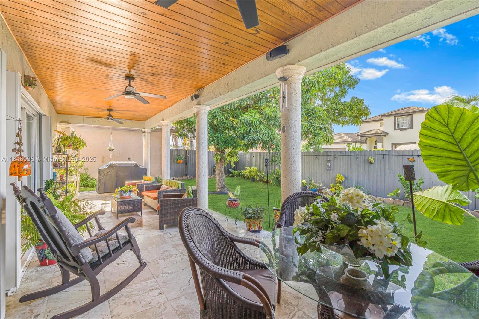 Spacious and well-maintained 4-bedroom, 2-bath single-family home featuring vaulted ceilings, energy-saving solar panels, and laminate flooring throughout. Enjoy a bright open layout, a 1-car garage, and a large covered terrace with beautiful wood ceilings and crown molding—perfect for outdoor living. The backyard has ample space for a pool and includes an exterior storage closet. Centrally located near top-rated schools, shopping, dining, and major highways for an easy commute. No HOA, giving you flexibility and freedom. This home is move-in ready with great curb appeal, nestled in a desirable, quiet neighborhood. A perfect blend of comfort, convenience, and value—ideal for families or anyone looking to enjoy the South Florida lifestyle.