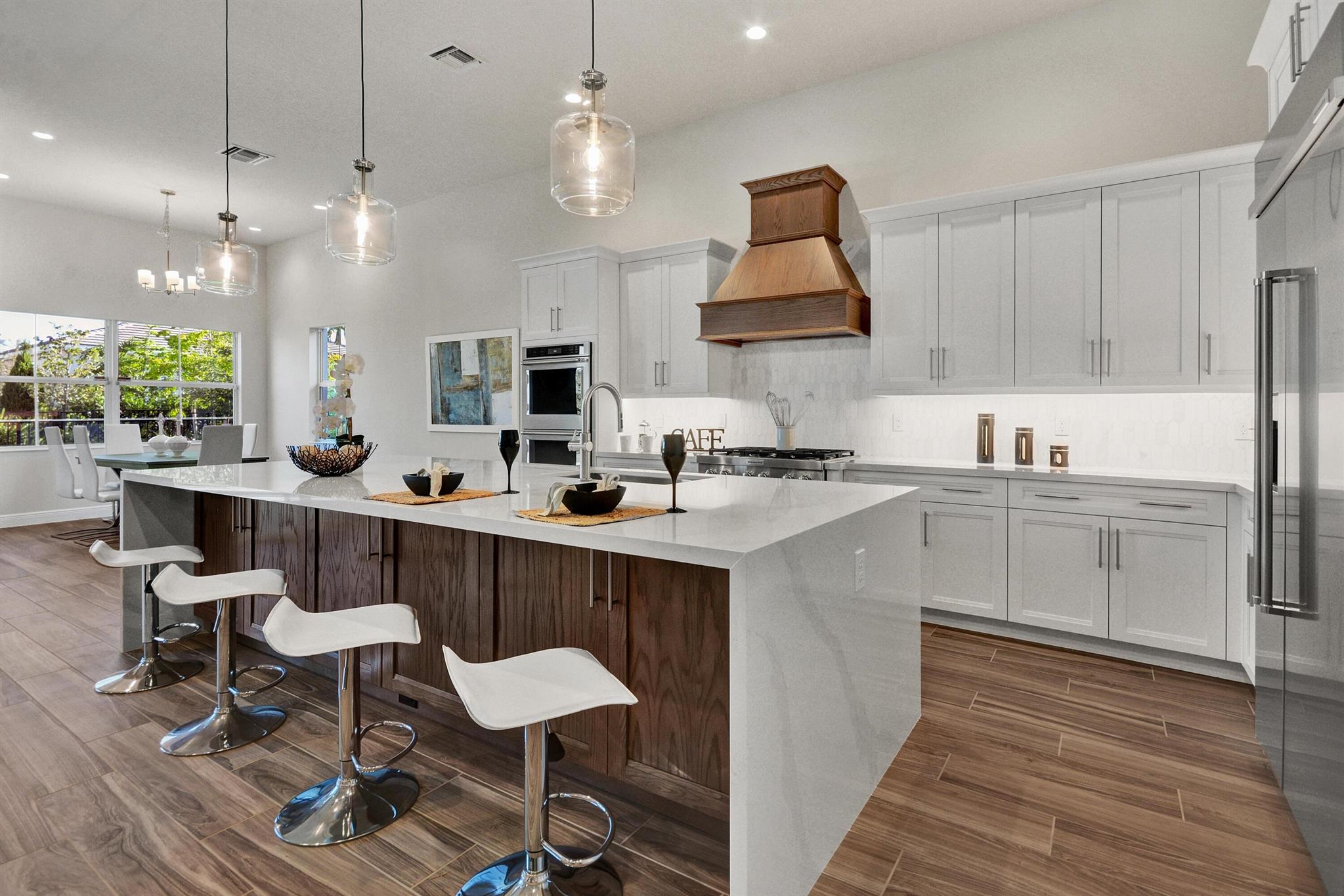 Gorgeous Salerno Contemporary on Prime Corner Homesite. This beautifully designed Salerno Contemporary features a spacious three-car garage. A double-door entry with glass panels welcomes you into a bright, open layout enhanced by porcelain wood-look tile throughout. The chef's kitchen impresses with a two-toned design, upgraded KitchenAid appliances with double oven, and an oversized island with quartz waterfall countertop--perfect for entertaining. The luxurious primary suite offers double walk-in closets and a spa-inspired bath complete with walk-in shower and a separate drop-in soaking tub. Step outside to your private oasis, complete with a sparkling pool, and enjoy the serenity of the outdoors with pre-plumbed stub outs for a future outdoor kitchen.