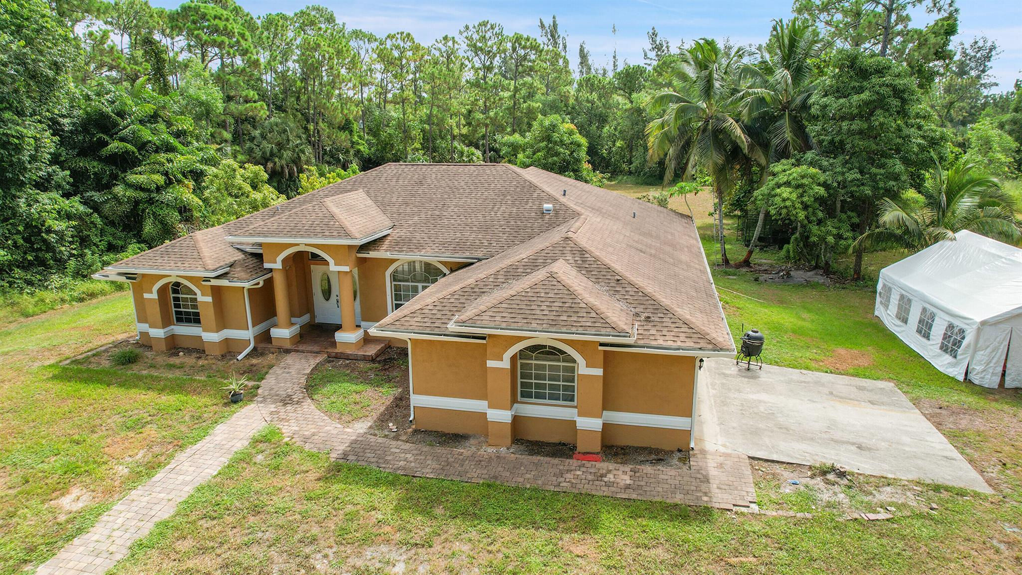 Spacious 3/2/2 CBS home on very private 5 acres in the beautiful equestrian community of Deer Run.Home is open, light and bright with vaulted ceilings and an open floor plan. The 5 acres has a dramatic palm tree-lined, long, circular driveway. The acreage is a blank slate for you to design and build out barns/paddocks/pool/etc. as needed. There's even an existing ''pad'' for a guest house or barn. Or leave it as it is and enjoy the peace, tranquility and privacy of your own 5-acre slice of Florida paradise!Don't miss this lowest priced home in Deer Run!