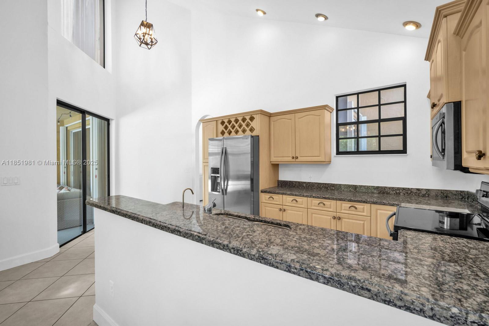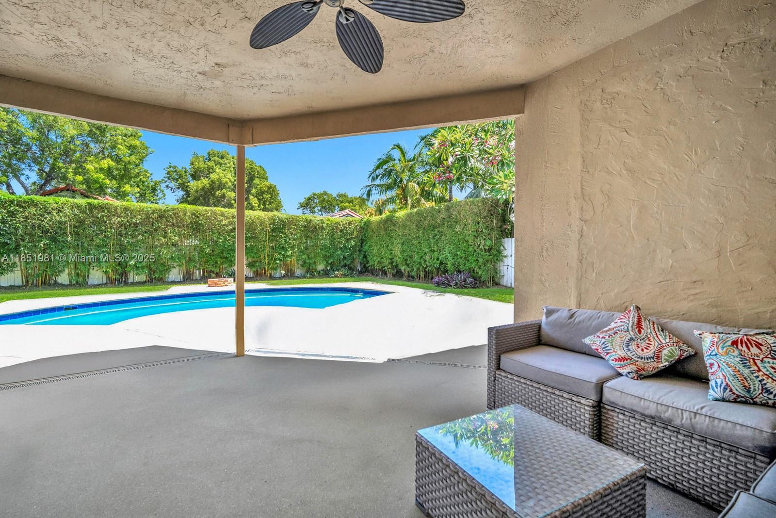 Welcome to Rock Creek a charming & sought-after community, proudly boasts this awesome 3 bedroom 2 bathroom pool home. The light and bright interior has soaring ceilings and a fabulous flow. Lovely primary suite with gorgeous updated en-suite cabana bath. Private backyard paradise has a covered patio, free form pool & spa and a lovely fire pit for relaxing on cool nights. Extras include laundry room, updated second bathroom, & mix of impact windows and accordion shutters. 2020 AC, 2021 water heater, 2023 flat roof. Rock creek is a pet friendly community with 2.75 mile jog/walk path, parks, lakes, sports courts, tot playgrounds on tree lined streets. Pool and tennis center offers 8 tennis courts, pool, lighted basketball courts, fitness room for a small fee and Cooper city's school system.