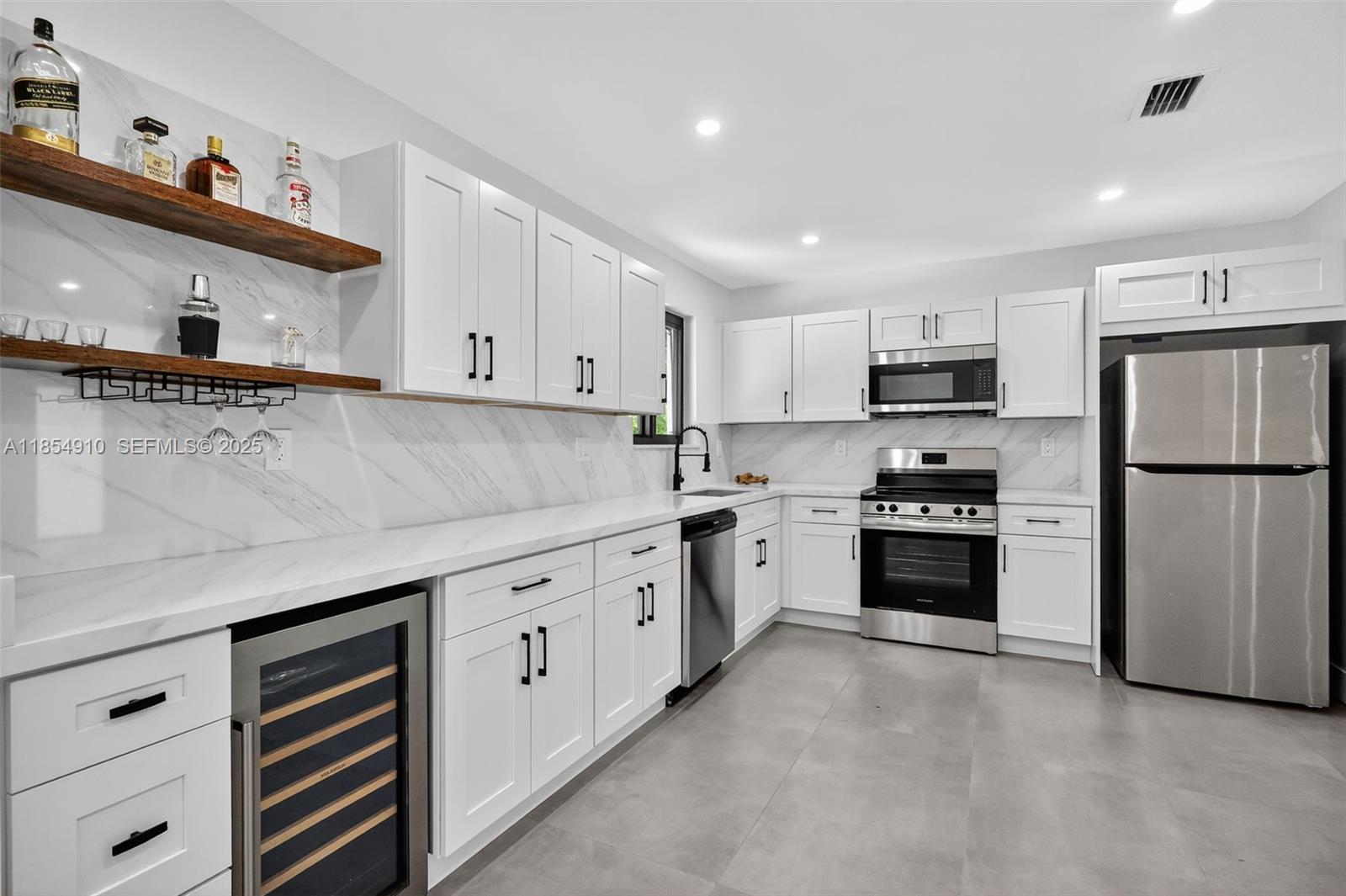 This stunning home is truly turnkey. Beautiful kitchen and bathrooms. Kitchen highlights built-in wine cooler, spacious pantry, accent wall with open shelves, custom made kitchen cabinets, quartz counter tops and stainless-steel appliances. Bathrooms nicely decorated with contemporary cabinets and hardware. Uniform slate grey tile throughout the house. Convenient split bedroom layout. Separate laundry room. New Metal Roof 2025. All impact windows and doors. The spacious backyard has plenty of room for a pool and lounge furniture. Fenced in backyard. Bigger than tax roll. Great neighborhood with nearby excellent schools, restaurants and entertainment. Must See!