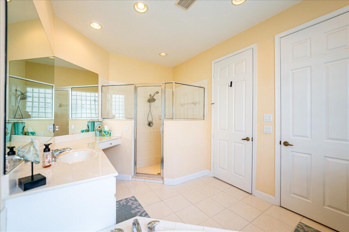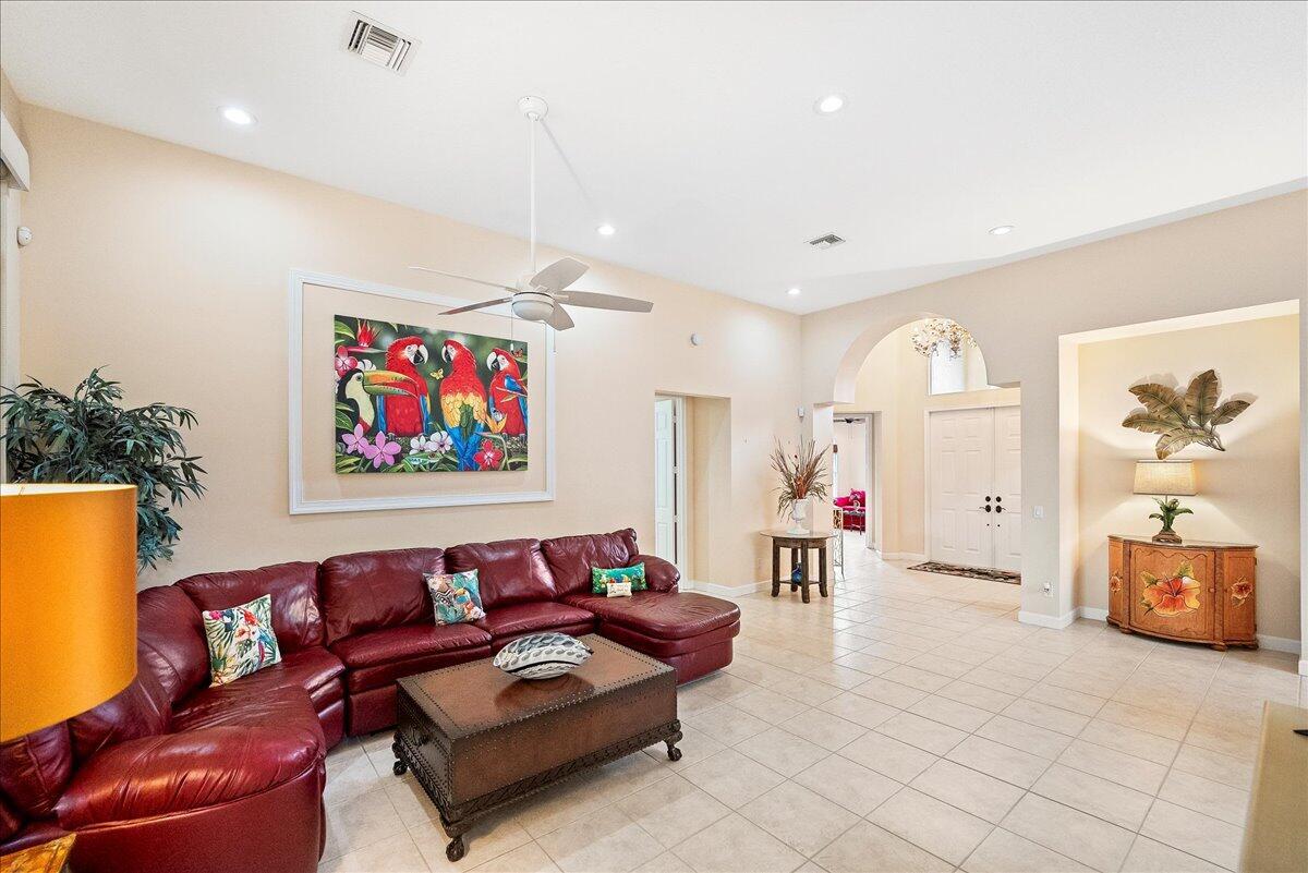 Tee up your Florida lifestyle at 8821 Champions Way in the prestigious PGA Village.Fully furnished and move-in ready, this 3 bedroom, 3.5-bath home offers over 2,300 sq. ft. of bright, open living space overlooking the golf course. Step outside to your private solar-heated, screened-in pool with cabana bath, or fire up the brand-new outdoor kitchen--complete with sink, ice well, grill, and granite seating for six--perfect for post-round gatherings.Inside, soaring 15' ceilings, oversized 12' sliding glass doors, and tile flooring throughout create a light, airy feel. The chef's kitchen boasts granite countertops, 42'' cabinets, and stainless-steel appliances, while the spacious primary suite features dual sinks, a soaking tub, and a separate shower.