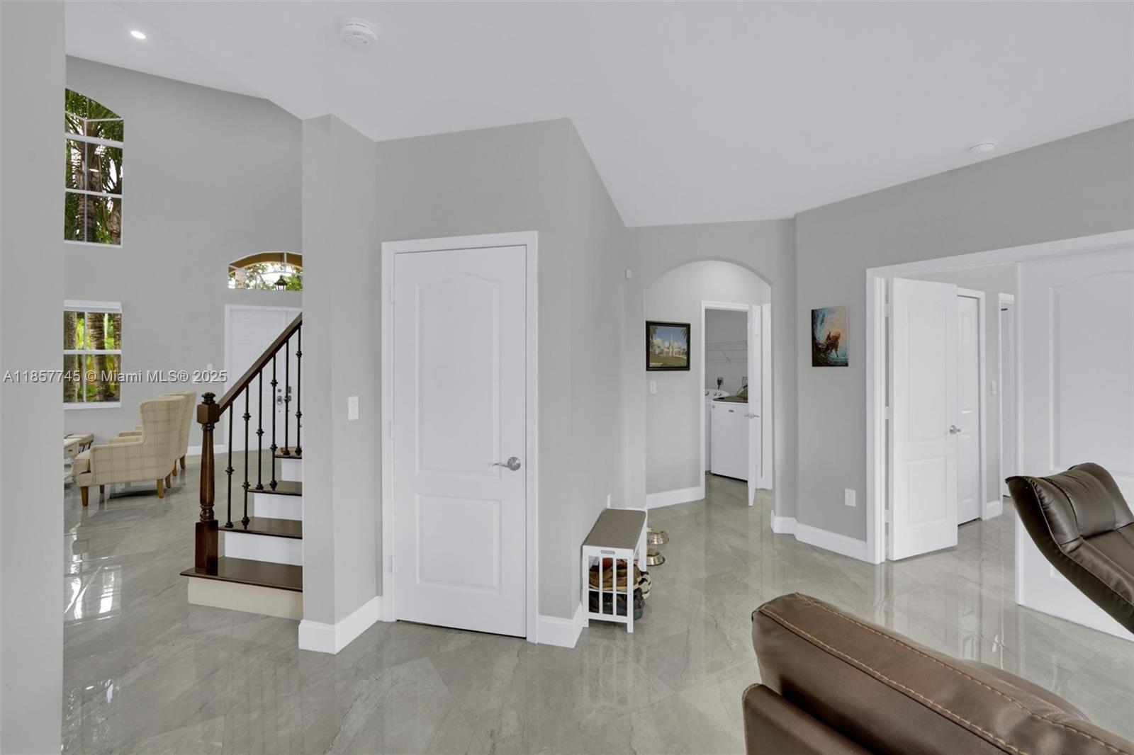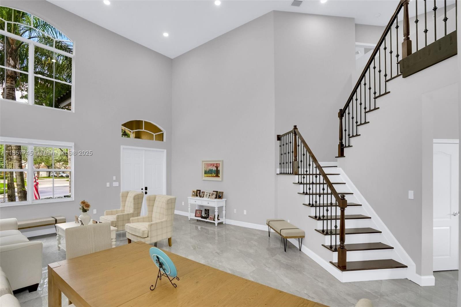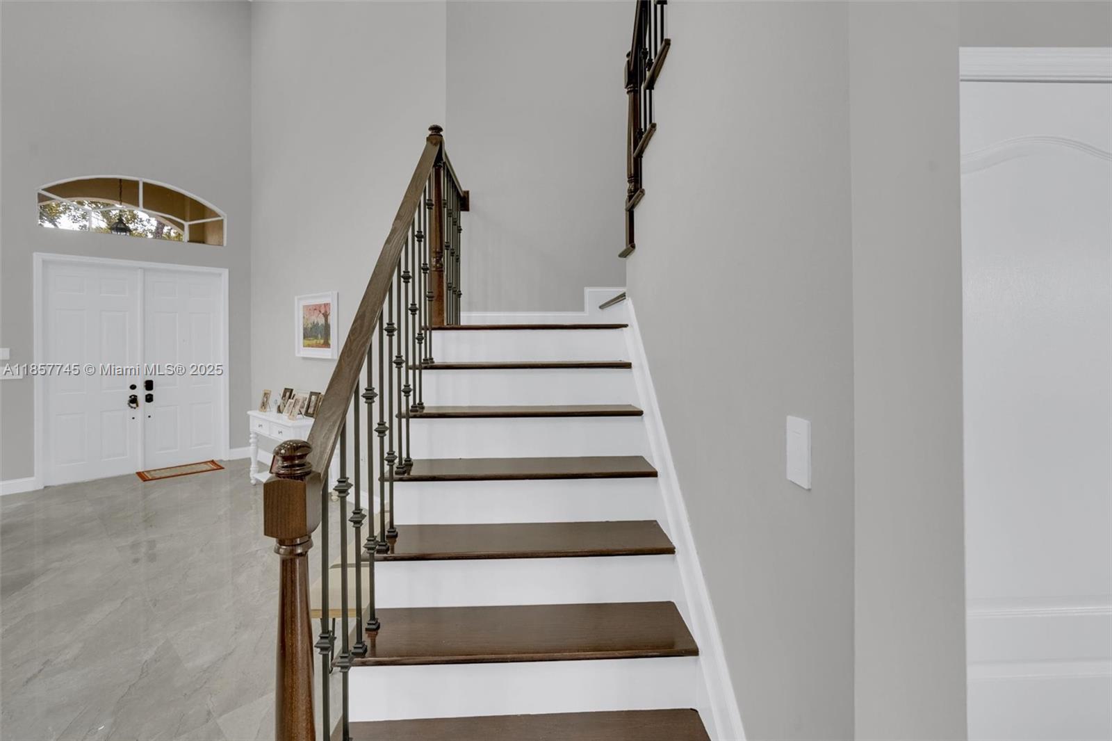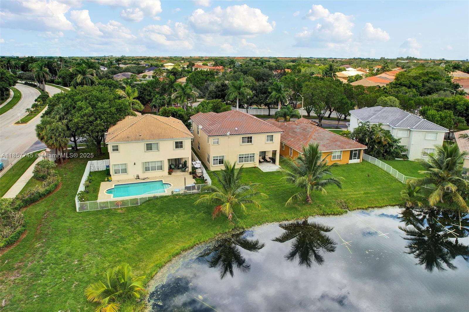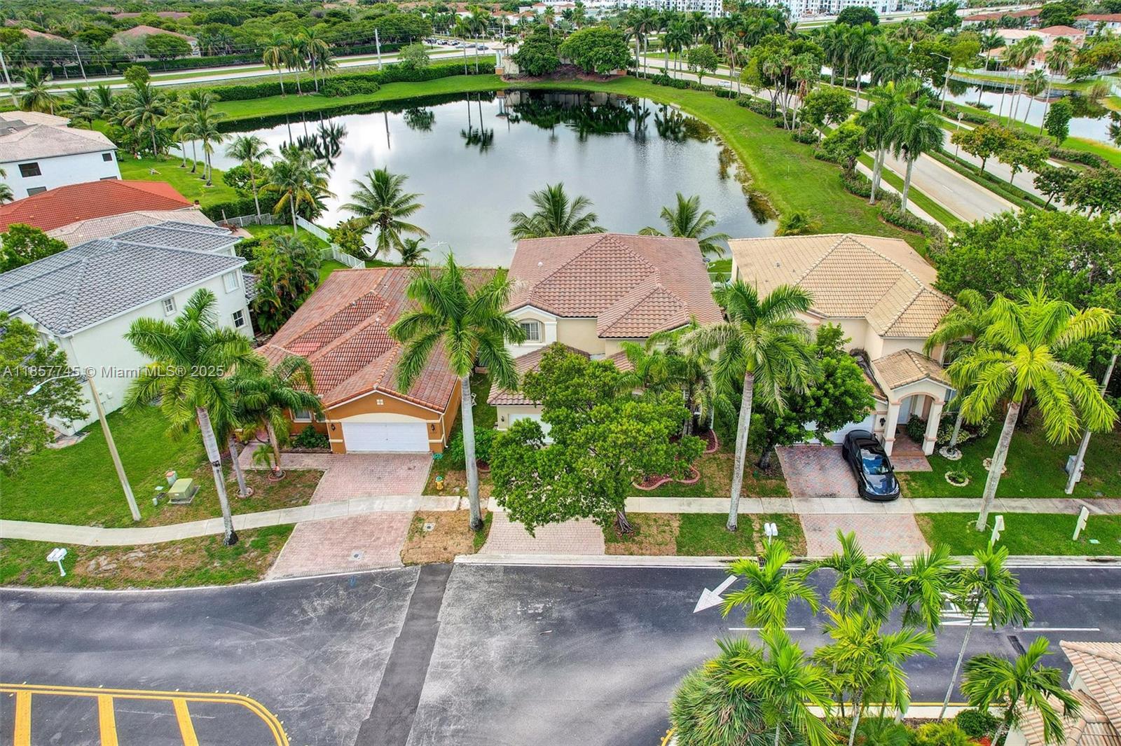 Magnificent lakefront home, lovingly maintained by its original owners and completely remodeled with many upgrades over the last years. Features include a 2-year-old barrel tile roof, accordion hurricane shutters, and new PEX-A plumbing throughout. The gourmet kitchen boasts a massive 8.5' x 5' quartz island, double ovens, newer appliances, and quartz countertops in both kitchen and baths. Elegant, oversized porcelain tile floors flow through the first floor, while upstairs showcases a beautifully redone hardwood staircase and hardwood floors in the loft. Freshly painted exterior, zebra blinds, spacious closets, and updated systems, including an improved AC, ensure comfort and peace of mind. Enjoy serene water views, community amenities, and a true turnkey property with countless extras.