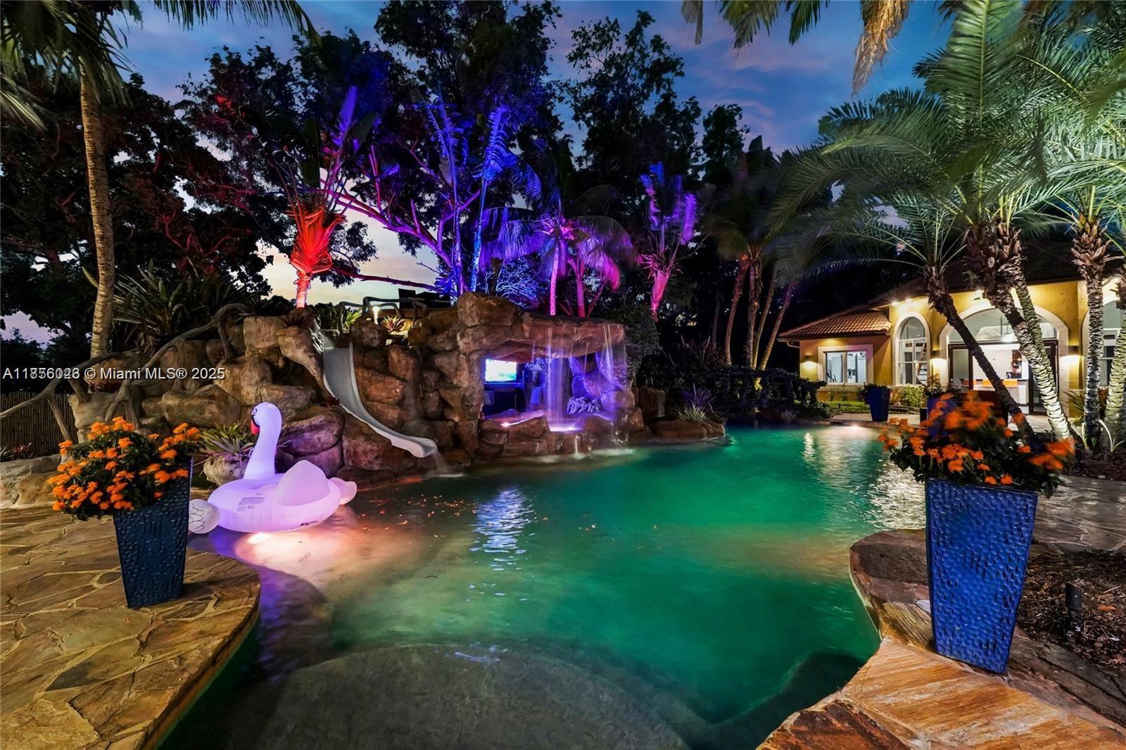 A Private Paradise Awaits Luxury Resort-Style Living in Your Own Backyard. This exclusive residence is more than a home, it's an entertainer’s dream. Nestled on 1.5 acres of lush tropical landscape, the backyard is an oasis featuring a 50x30 lagoon pool, cascading waterfalls, & a 12-man jacuzzi inside a grotto cave with an ice/refrigerator bar & secluded seating. Towering palms sway in the breeze, enhancing the ambiance.The Crestron smart home technology ensures seamless control of lighting, climate, security, and entertainment. An expansive covered patio with contemporary lounge seating & an outdoor kitchen. As the sun sets, soft lighting transforms this retreat into a five-star resort, offering sophistication, privacy, & the finest elements of tropical living. SELLER FINANCE AVAILABLE!
