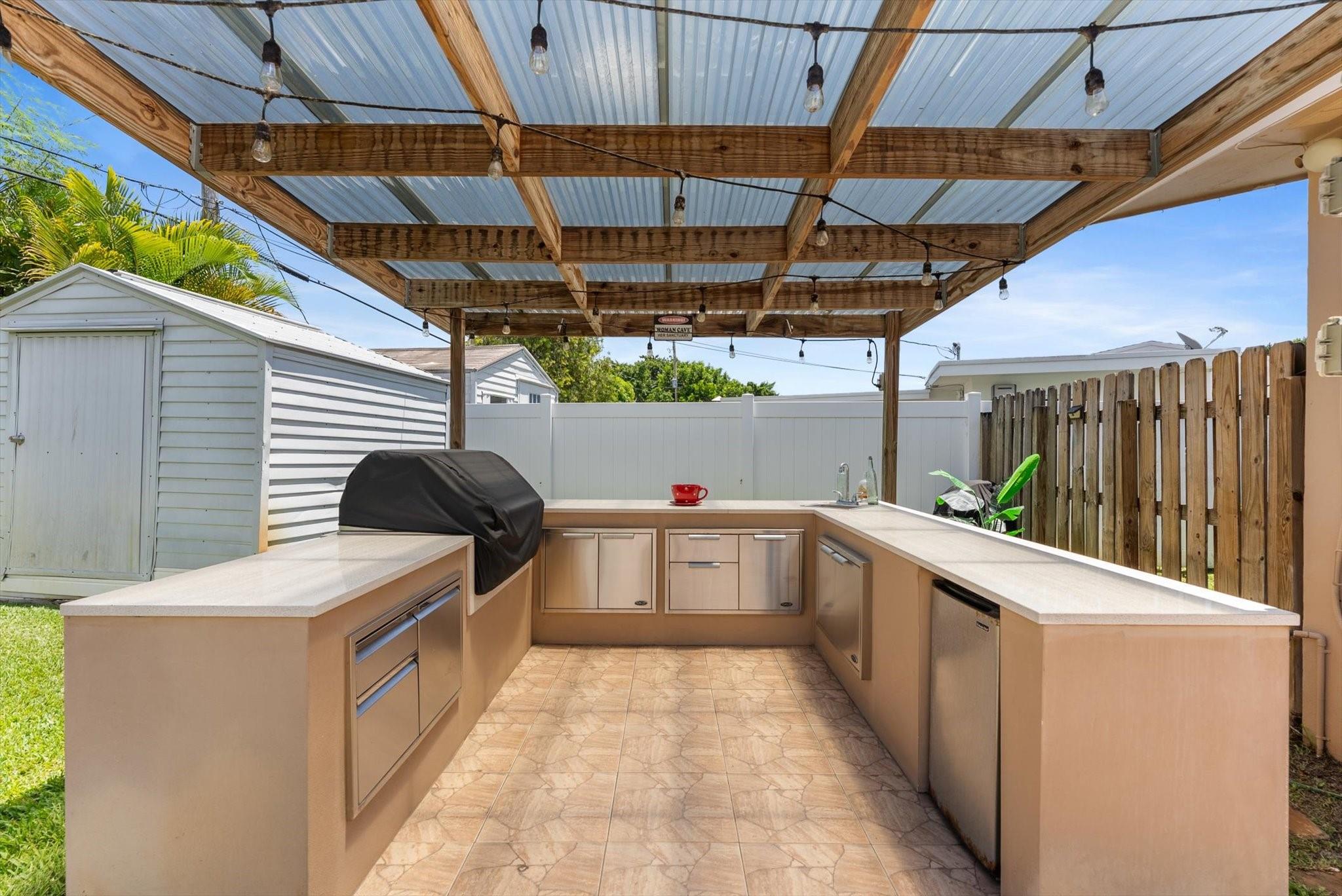Brand-new roof! Perfectly updated & maintained! This beautiful home has an impressive curb appeal boasting an inviting front porch, oversized driveway, manicured landscape & a large front yard. The interior shines with plantation shutters, a beautiful kitchen with fine wood cabinetry, granite counters, & SS appliances. The spacious primary suite features a ensuite bath, large closet & wood-look tile floors. Out back, your private oasis awaits with a fenced yard, a full summer kitchen (refrigerator, grill, & sink), patio, gazebo, mosquito misting system, night lighting, & space for a pool, pets to roam, & kids to play. Bonus features include a sunny Florida room Impact windows/doors/some accordion shutters & roomy secondary bedrooms. RV, boat, trailer, etc. parking is allowed.