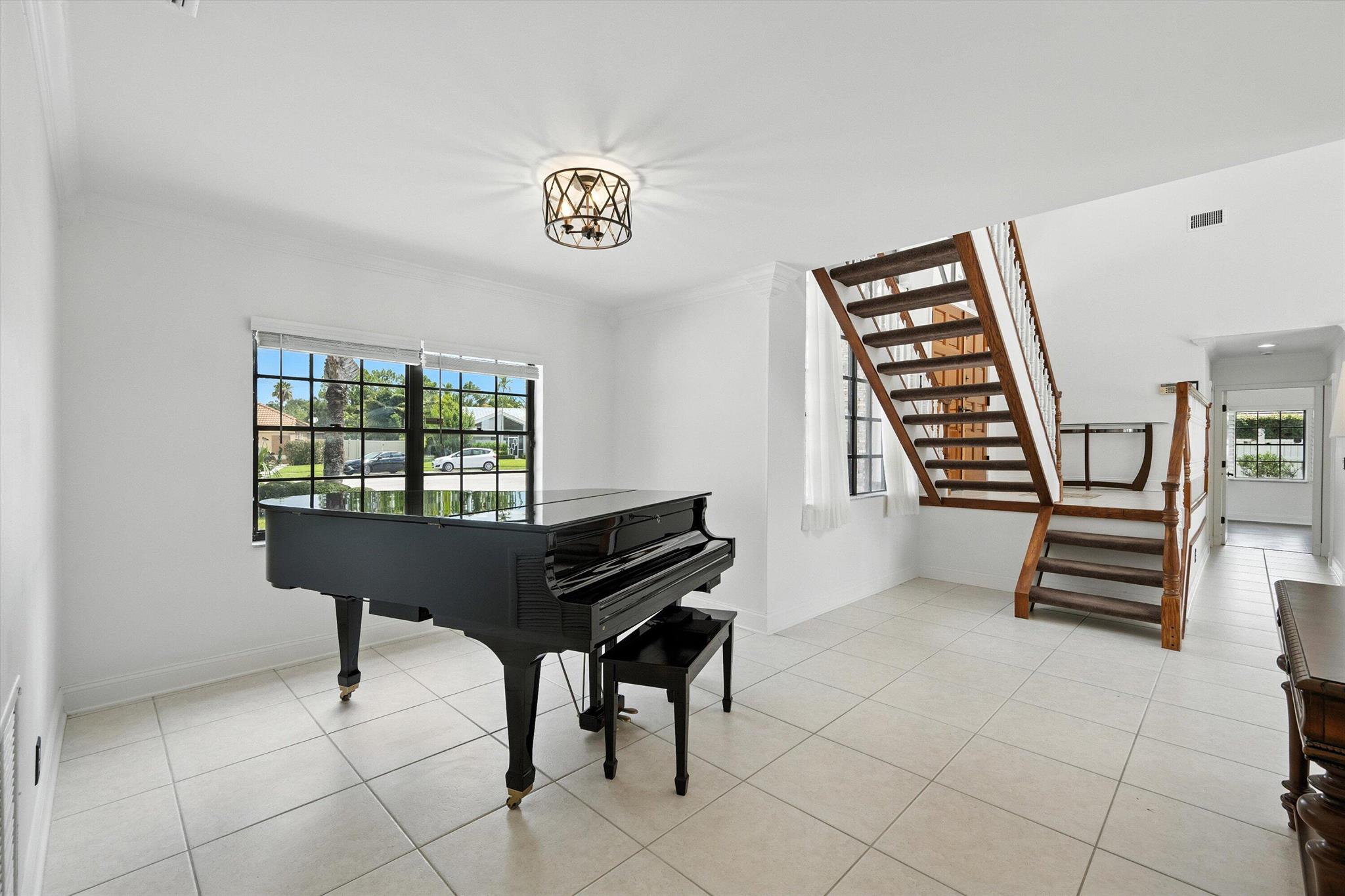 Welcome to this Mediterranean-style retreat in the heart of Wellington, FL, perfectly situated on a quiet cul-de-sac with sweeping waterfront views and a private oversized boat dock. Offering 2,403 square feet of light-filled living space, this beautifully maintained home is designed for both everyday comfort and memorable entertaining. Step through the impressive wooden entry doors into a warm and inviting interior, featuring a cozy living room fireplace. The primary suite is conveniently located on the ground floor, while two additional bedrooms, a loft and bathroom upstairs provide space for family or guests. A versatile office/flex room on the main level adds to the functionality of this home. Recent upgrades include a new clay tile roof and a newly resurfaced, heated pool. The outdoo