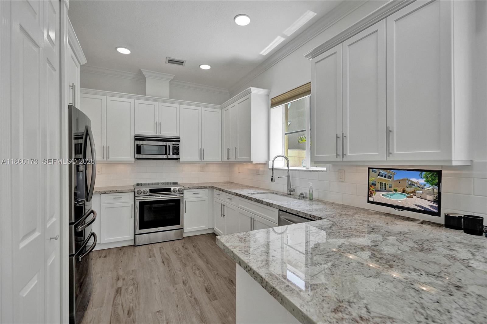 This updated corner townhome combines modern design with comfort, ideal for today’s lifestyle. The open floor plan is filled with natural light, volume ceilings, and sleek finishes. The chef’s kitchen with snack bar offers abundant counter space and flows into the dining area, custom bar, and great room. French doors with impact windows lead to a private tropical retreat featuring an free-form pool, patio, custom BBQ, dining area, lighting, and Bluetooth sound. The primary suite includes two walk-in closets, spa-style bath with Jacuzzi and shower, plus a balcony overlooking the pool. The junior suite has two balconies, and the third bedroom can be used as an office.