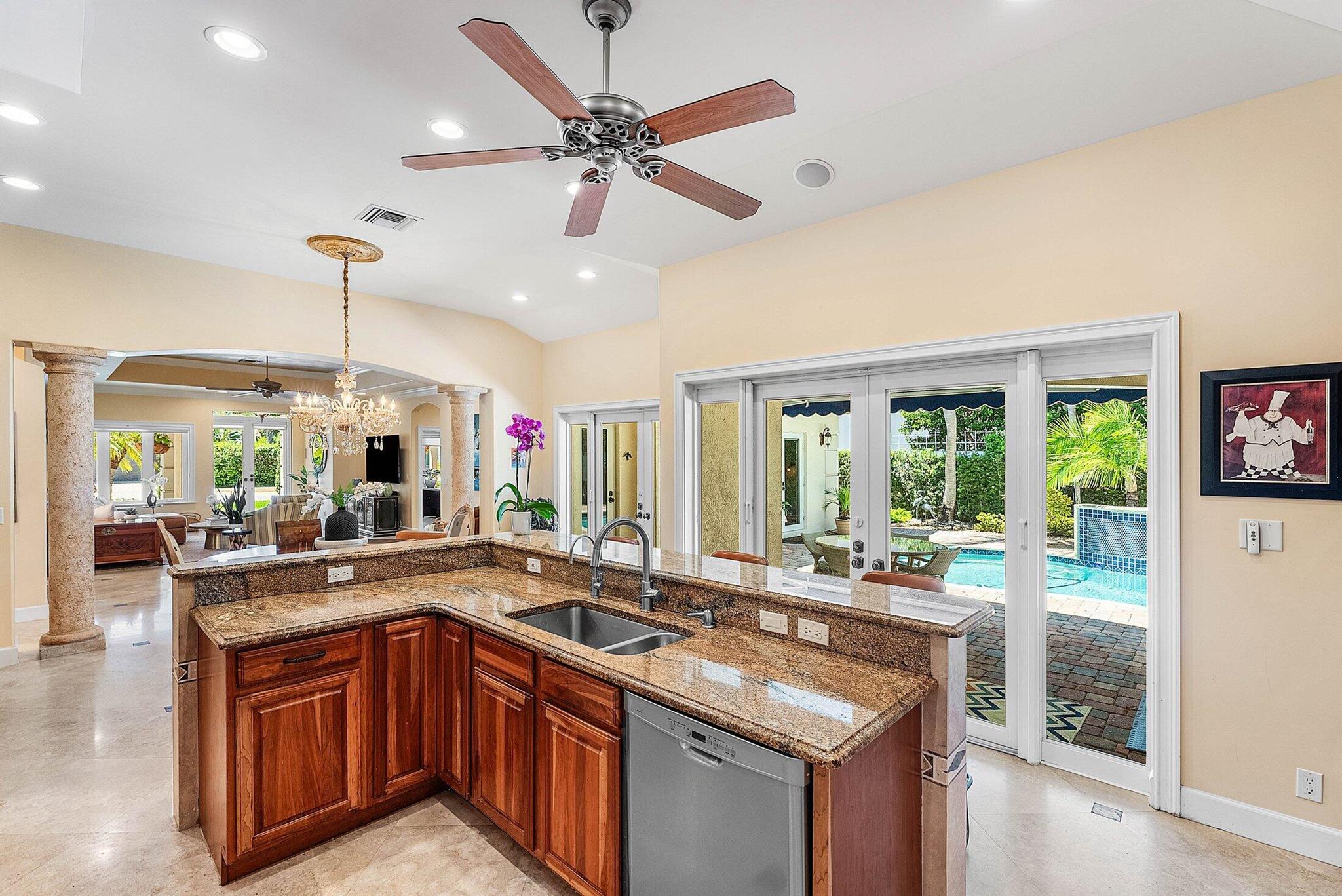Exquisite 3BR/3BA custom home designed by a renowned local architect and built by its engineer-owner. Offering 2,206 SF under air (2,936 total) on a .21-acre lot, this property boasts PGT impact windows and doors, barrel tile roof, Kohler whole-house generator, two newer AC units with UV lighting, and no HOA.Interior highlights include 10-12 ft ceilings, 24x24 travertine floors, crown molding, coffered and tray ceilings, solid core doors, bar with wine cooler, central vac, and cedar-lined closets. The gourmet kitchen features granite counters, cherry cabinetry, professional 6-burner Jenn Air gas cooktop with pot filler, dual convection ovens, and pantry with pull-outs.The luxurious primary suite offers French doors to the pool, a spa bath with onyx vanities, Jacuzzi tub,