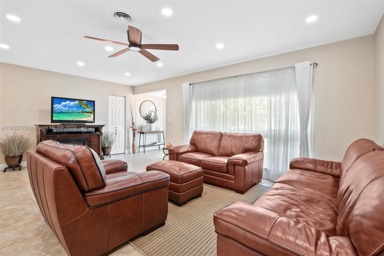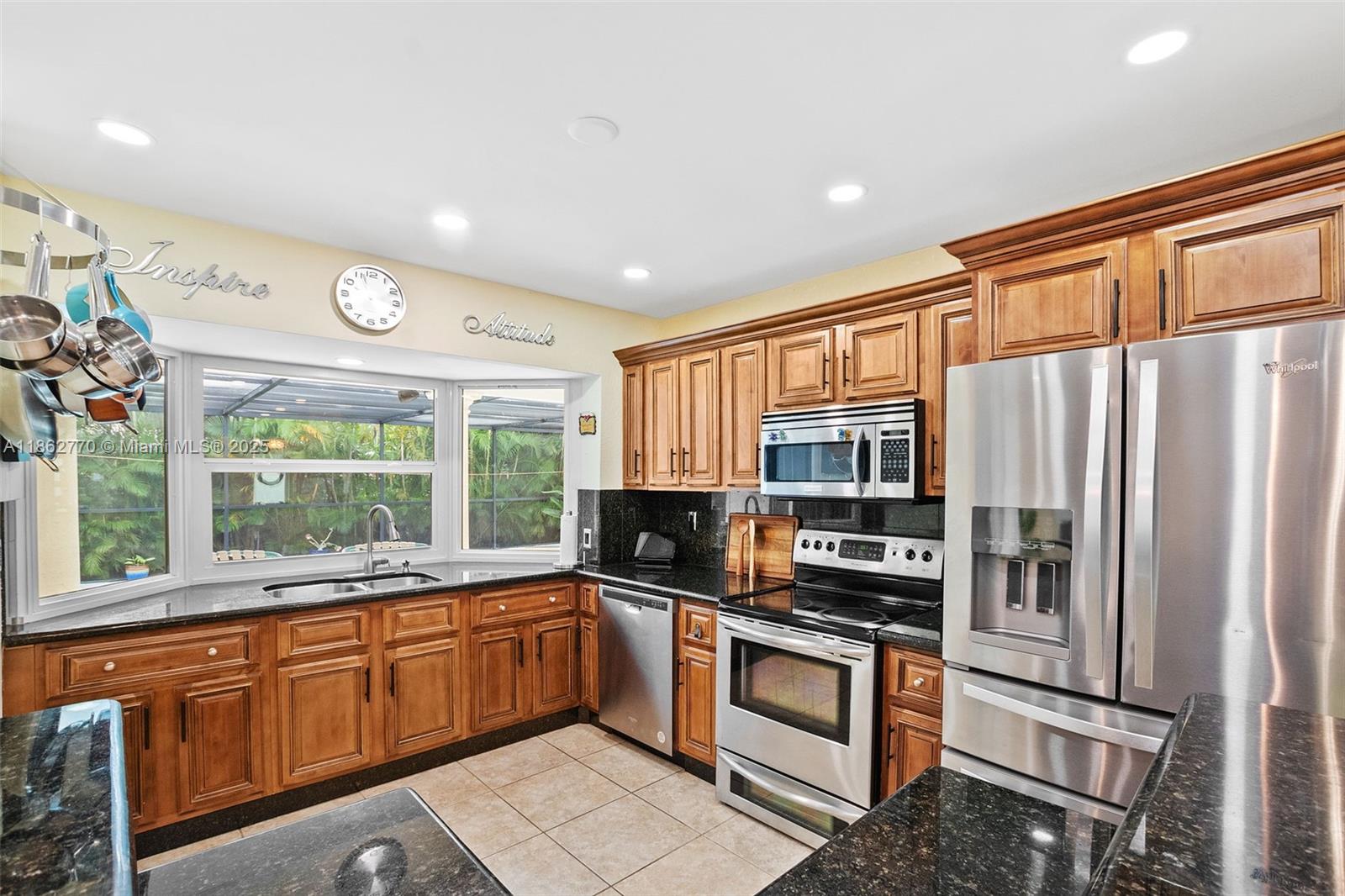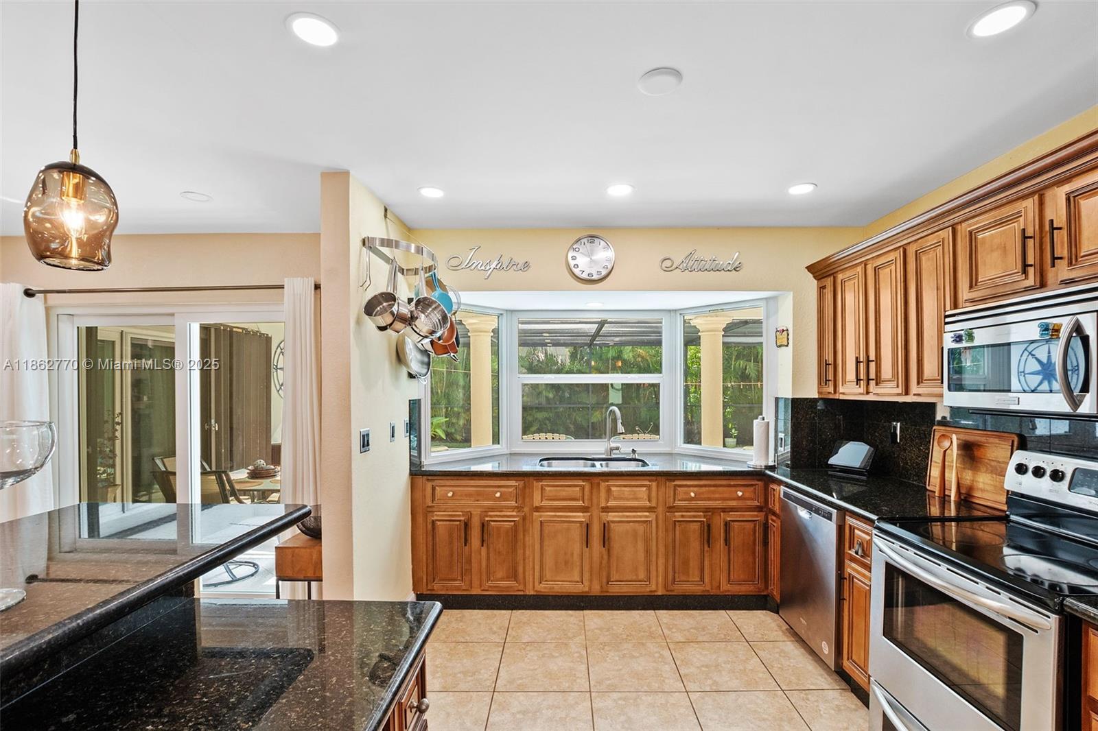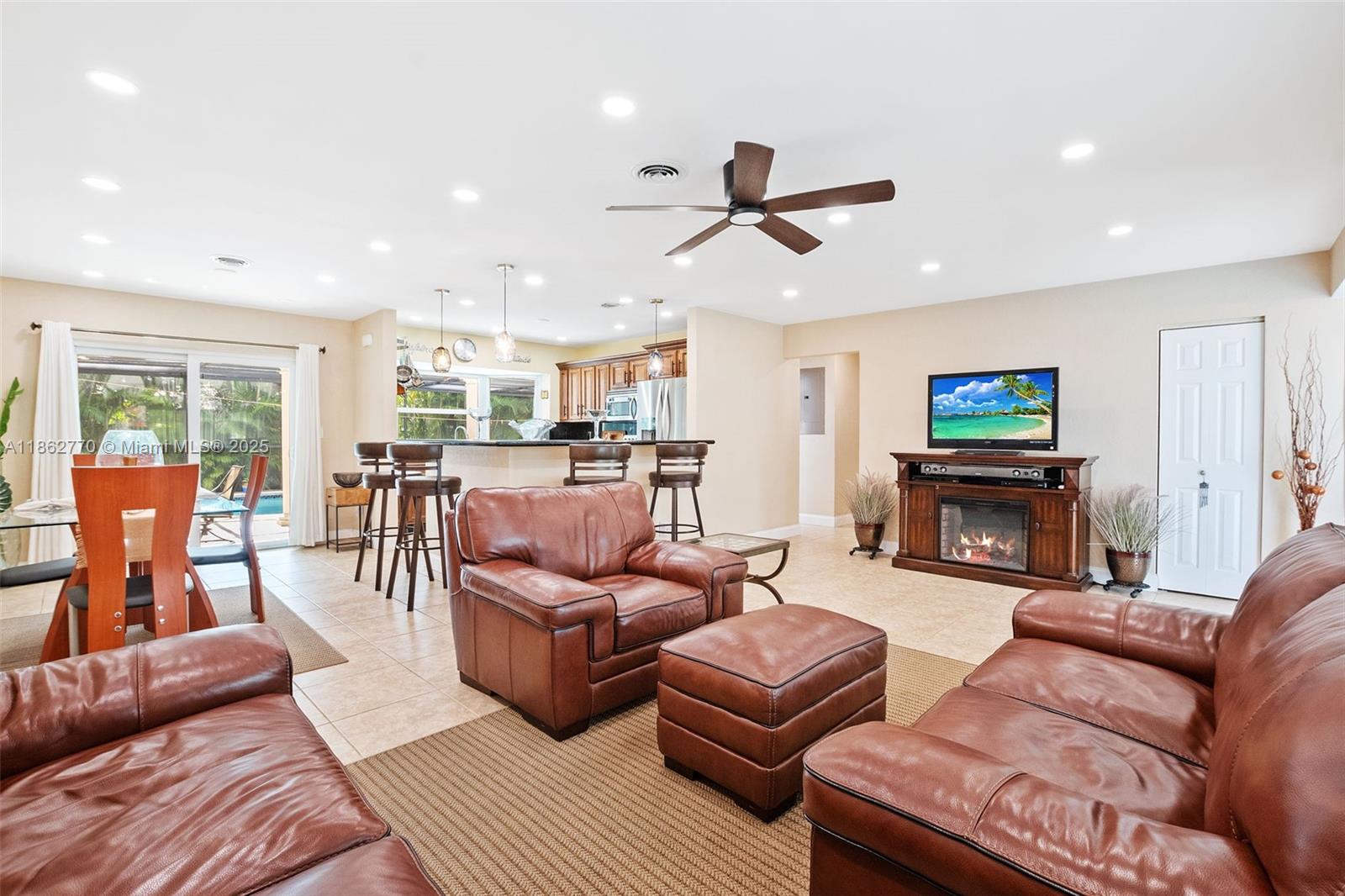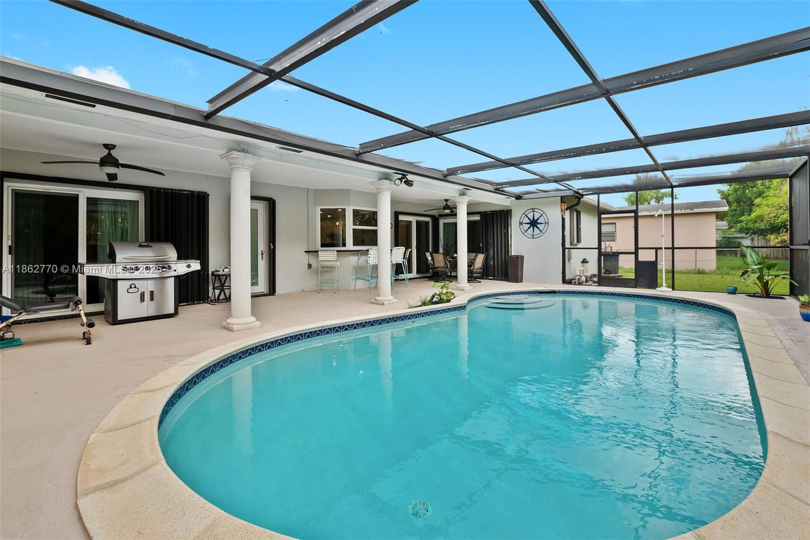 Welcome to this 3/2/1 historic Miramar home conveniently located between The Hardrock Casino and The Hardrock Stadium. This 1637 sq. ft. home is well maintained & includes: a complete package of impact windows and doors-2017 (plus Bahama & accordion shutters) roof-2017, hurricane garage door and tankless water heater-2021, new electrical panel box-2020, Bluetooth smoke and carbon monoxide detectors, LED can lights-2020, pool pump-2022, HVAC-2017. Chef's kitchen has stainless steel package, granite counters, pass thru window to screened poolside oasis for dinning alfresco. Tiled floors throughout entire home. Both baths completely updated in 2022 with lighted mirrors, bluetooth fans, and smart speakers. Exterior painted-2023, Irrigation system. Termite tent-June 2025. This is a must see!