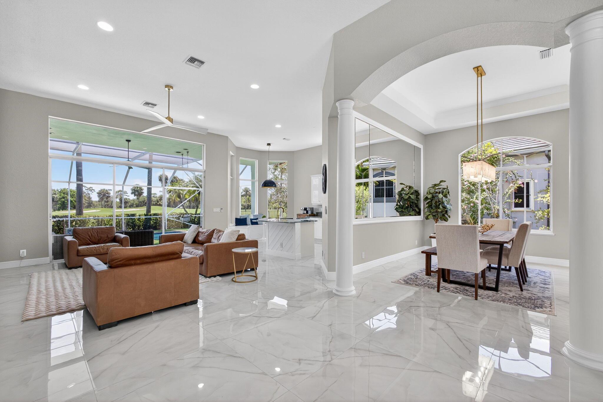 Set on a private cul-de-sac in the boutique Ironhorse community, this updated 4-bedroom, 4-bath ranch styled home offers panoramic views of the preserve, & the renowned Arthur Hills Championship golf course, with no mandatory membership. Be captivated by the 12-ft ceilings with abundant natural light, elegant new porcelain tile floors throughout, a brand-new roof (2024), new A/C, new pool heater, new water heater, new pool pump, new impact double front door, new tesla charger, new rock garden, extended driveway & fresh interior & exterior paint.The open-concept kitchen with quartz countertops, a built-in breakfast nook, & a shiplap-accented island, flowing into spacious living areas framed by custom wood panel media wall & sweeping golf views, while the primary suite boasts custom his &