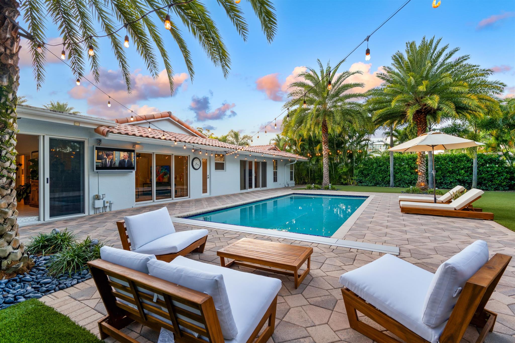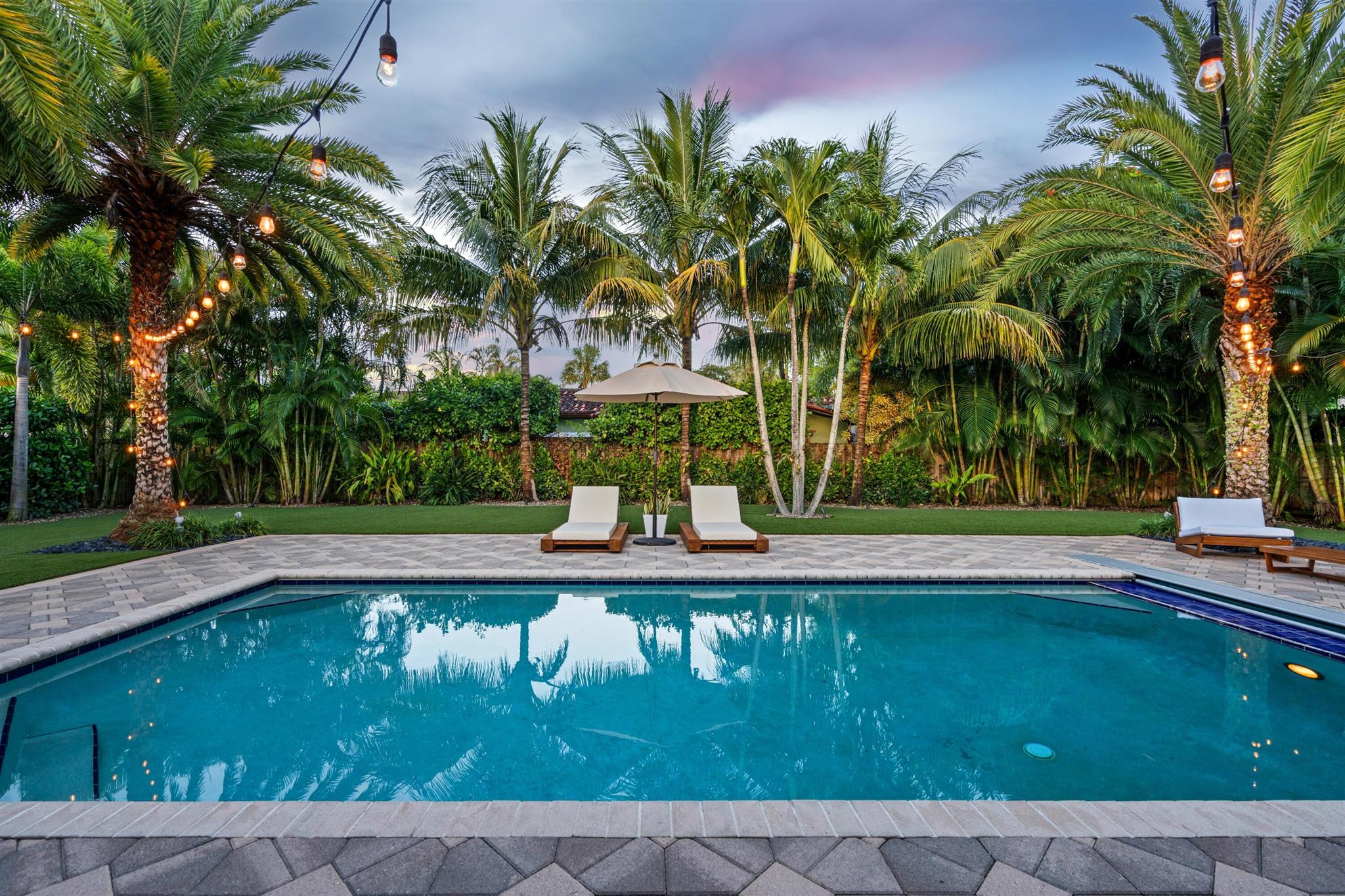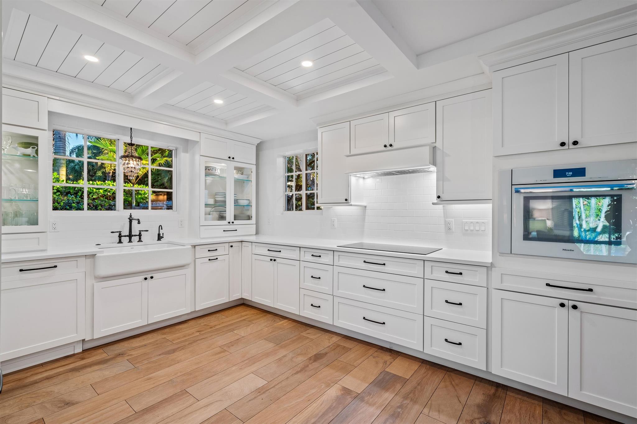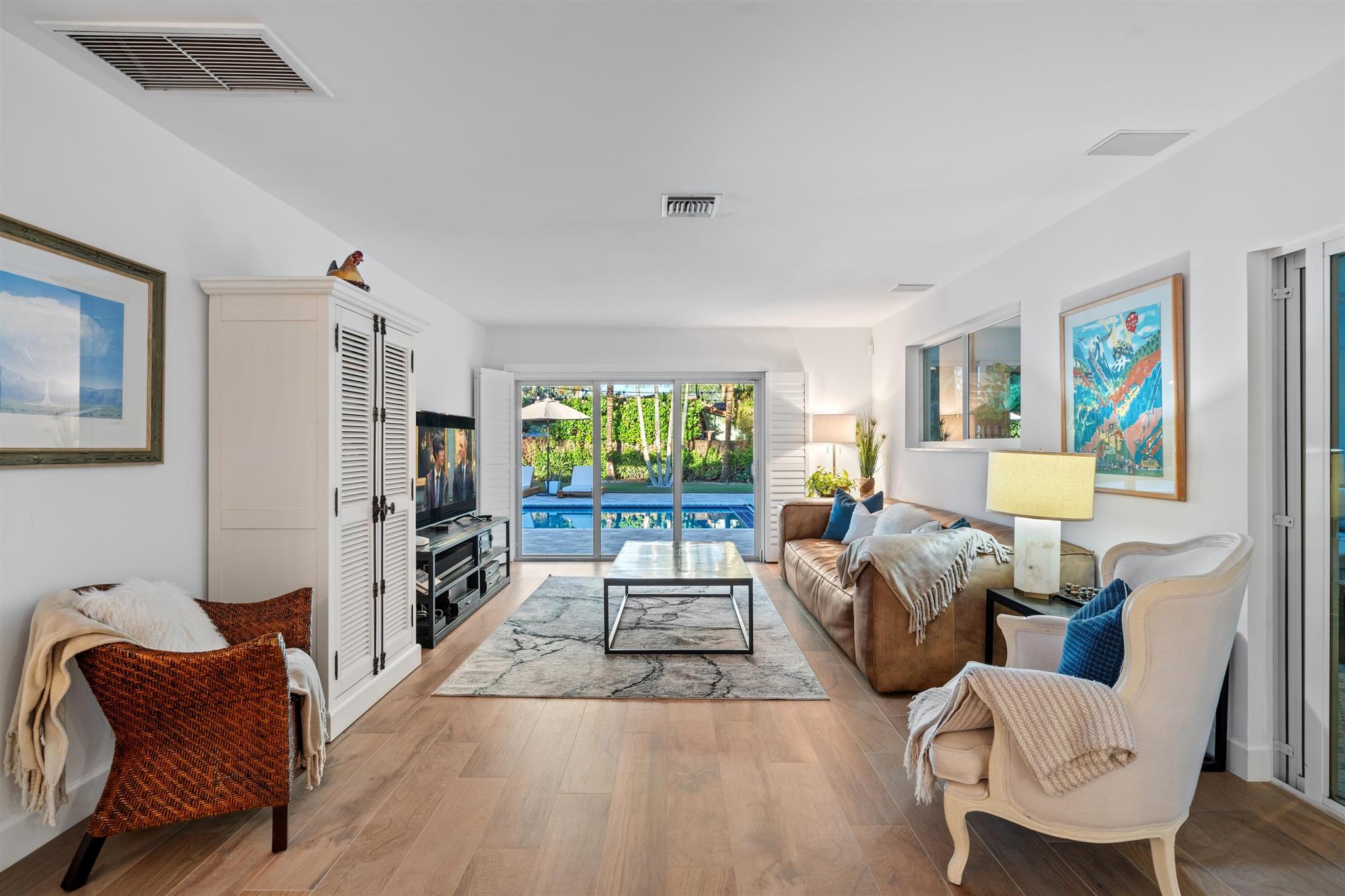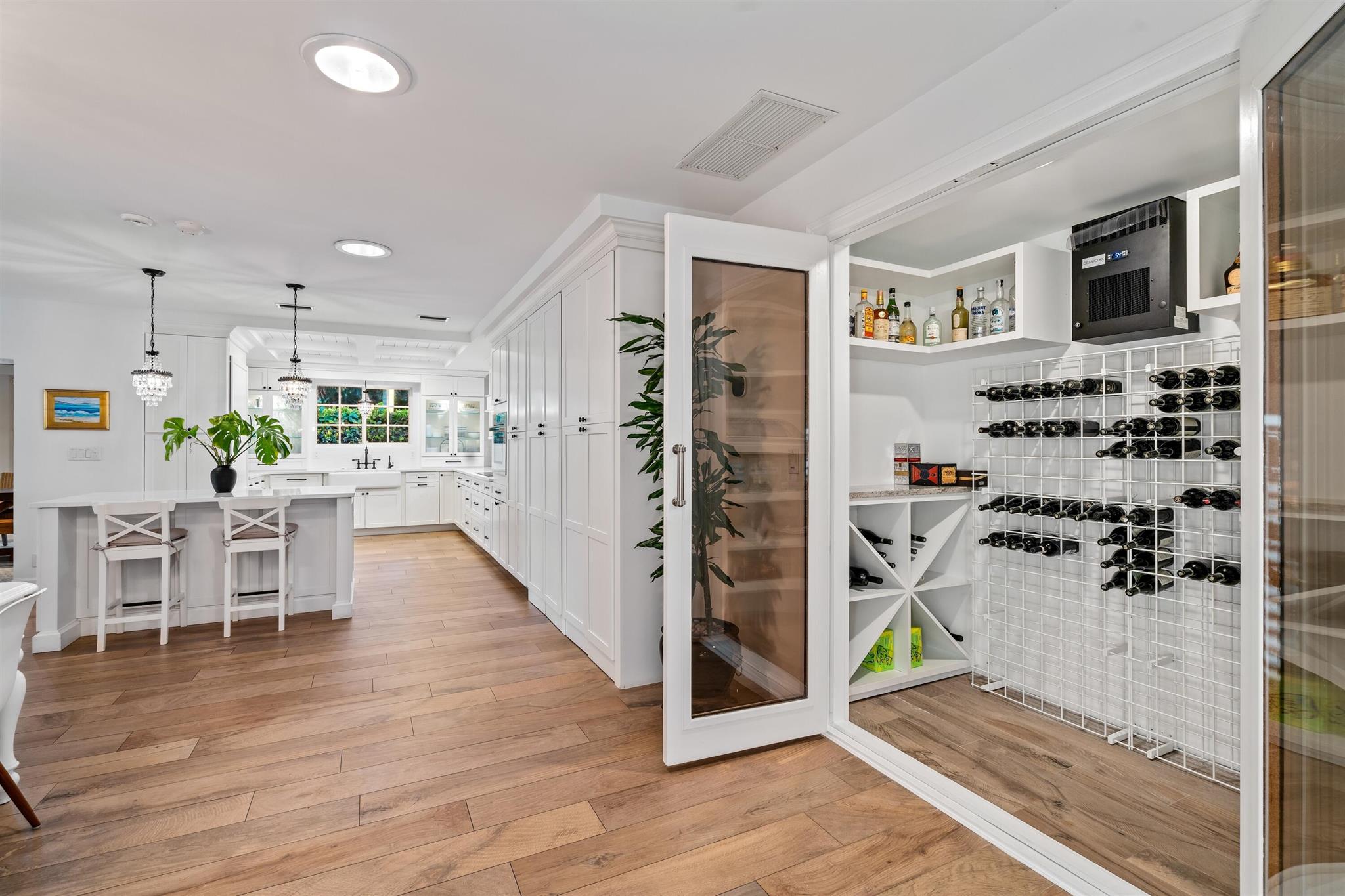 Blending West Indies charm with modern luxury, this renovated residence, with four bedrooms and 3,373+/- total square feet, conveys a relaxed casual elegance that emphasizes easy livability and care-free maintenance. Impact-glass sliding windows and doors from all main rooms offer serene pool and garden views, designed in an open flowing layout that meets every need for gracious entertaining. The temperature-controlled 200-bottle wine room, perfectly positioned next to the dining area, is a connoisseur's delight, while the spacious great room adjoins the gourmet kitchen appointed with high-end Miele appliances. Imported Italian wide plank wood style porcelain tile flooring throughout and Plantation shutters in the living areas and bedrooms lend a coastal ambience.