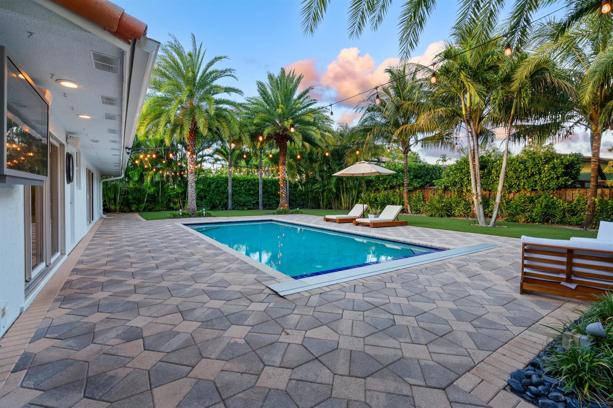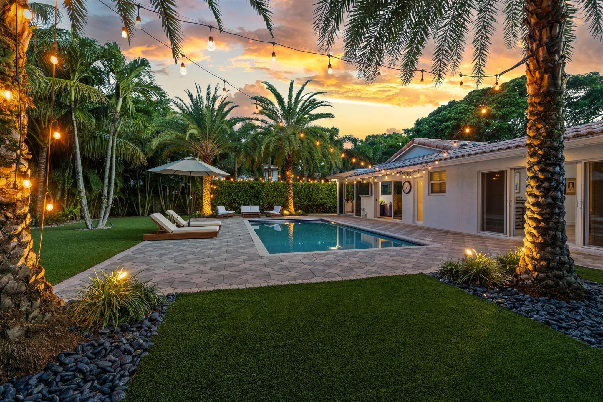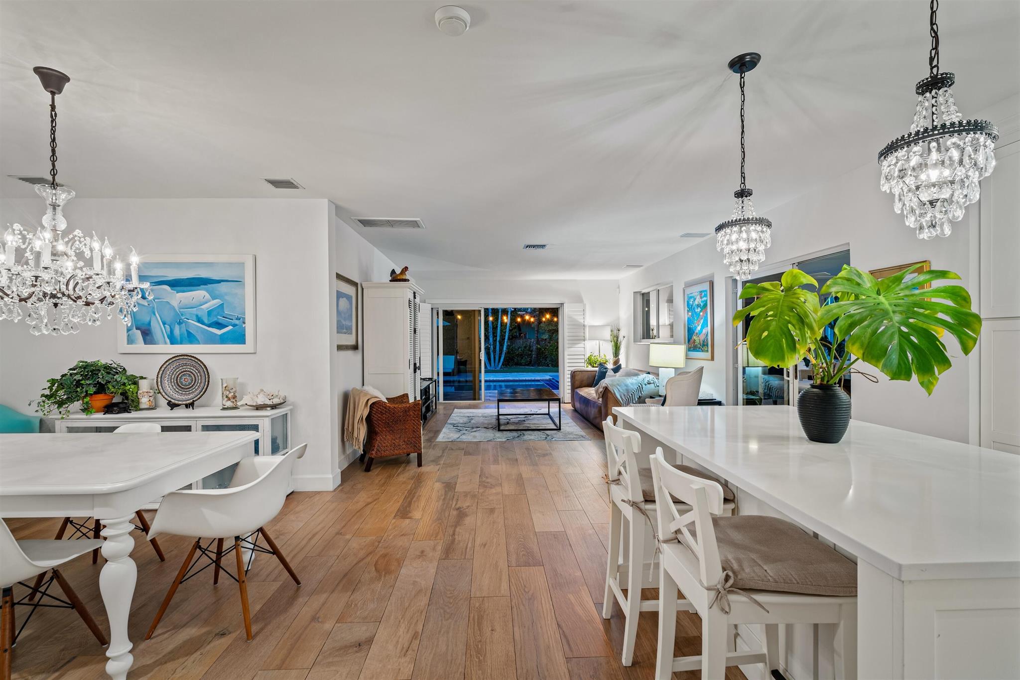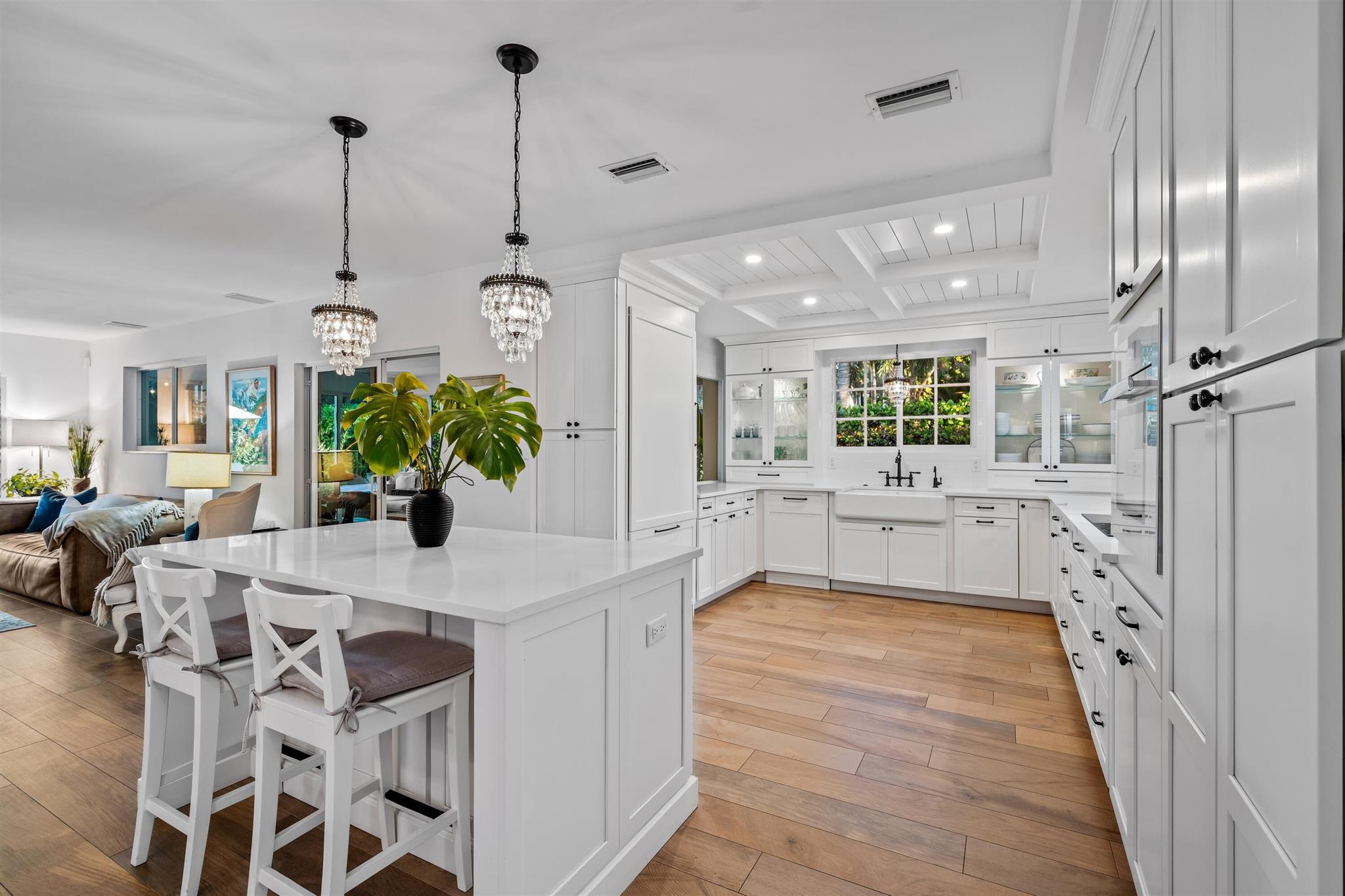 Blending West Indies charm with modern luxury, this renovated residence, with four bedrooms and 3,373+/- total square feet, conveys a relaxed casual elegance that emphasizes easy livability and care-free maintenance. Impact-glass sliding windows and doors from all main rooms offer serene pool and garden views, designed in an open flowing layout that meets every need for gracious entertaining. The temperature-controlled 200-bottle wine room, perfectly positioned next to the dining area, is a connoisseur's delight, while the spacious great room adjoins the gourmet kitchen appointed with high-end Miele appliances. Imported Italian wide plank wood style porcelain tile flooring throughout and Plantation shutters in the living areas and bedrooms lend a coastal ambience.
