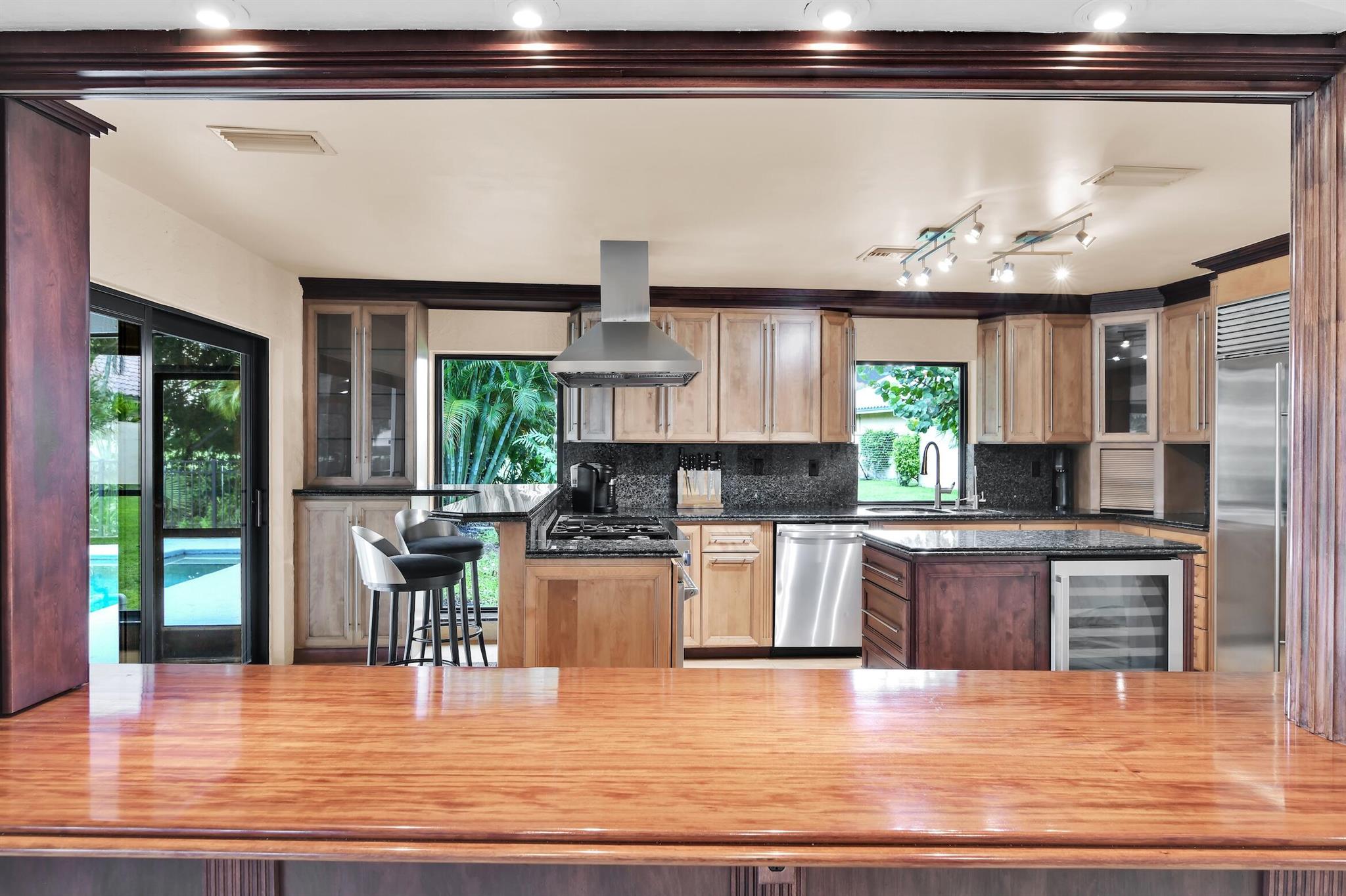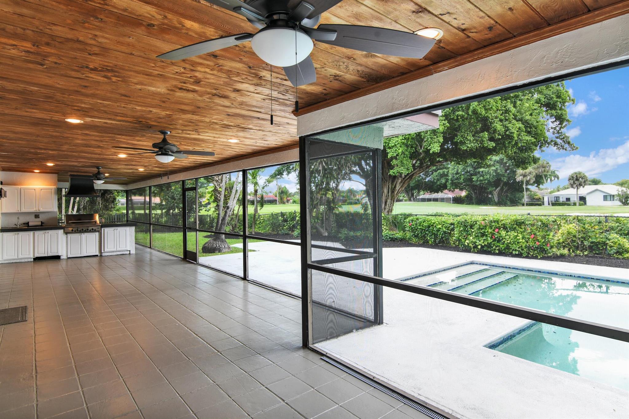 NEW ROOF. COMPLETE HURRICANE IMPACT PROTECTION. Air conditioners (2) replaced in 2023. Pie shaped .36 acre lot with circular driveway.No membership required. Large .30 acre lot.Professional GAS stove, appliance garage, subzero refrigerator, granite counters in the beautifully remodeled kitchen ideal for Gourmet cooks. Built-in Honduran Rosewood 10 seat Island with retractable door. Built-in wine cooler with room for 54 Bottles. Master bedroom overlooks patio, and has 2 walk-in closets, and large bathroom with tub and separate shower. Large screened in Patio with DCS outdoor kitchen with rotisserie and custom exhaust. Large, fenced yard with large deck and 37X18 ft pool with expansive view of the 14th hole fairway.Well for sprinklers saves water