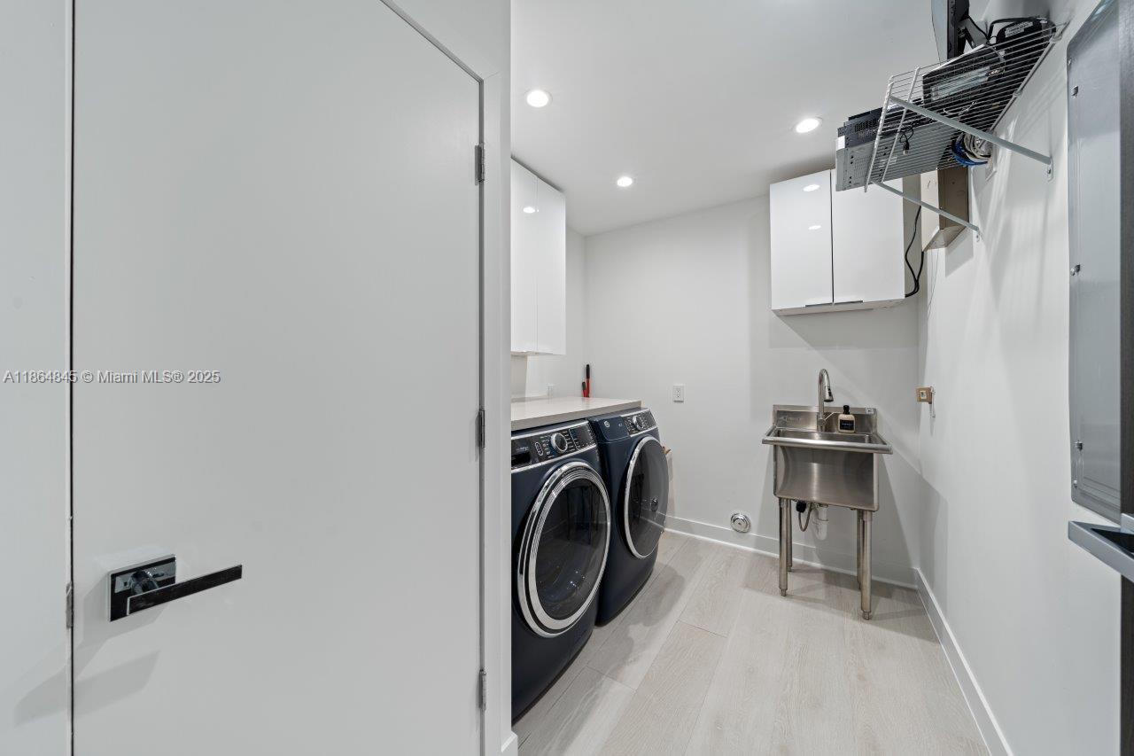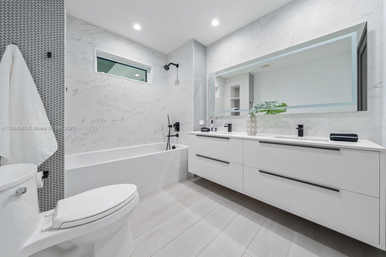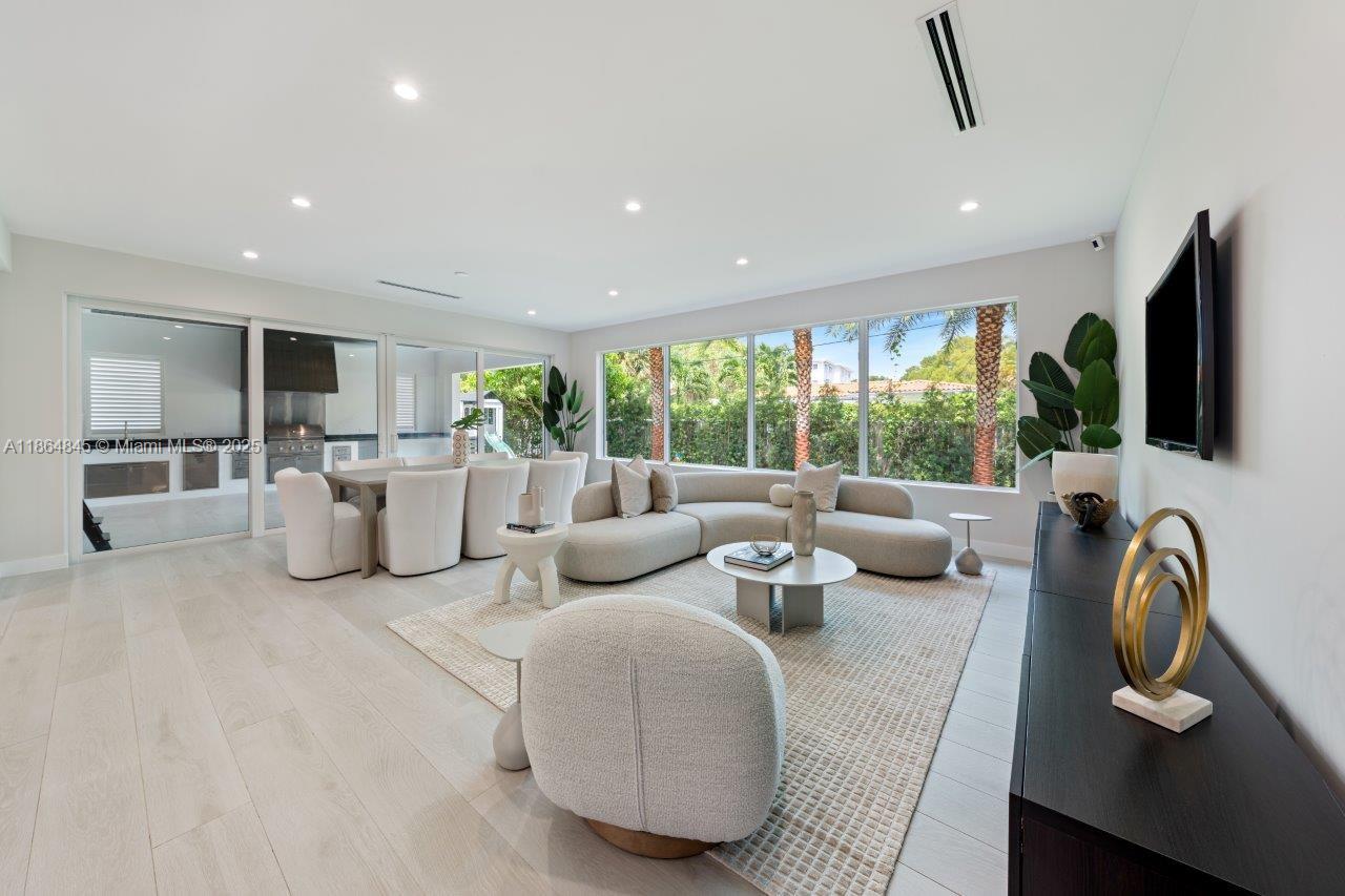 Modern Executive Style home in 24HR guard-gated Sans Souci Estates. 2,580 SF of AC living space, 3,323 SF under roof, boasting 4br 3ba & 2car gar w/AC. Whole-house generator w/automatic transfer switch, hurricane impact windows/doors, & new 2020 roof. Gourmet kitchen crafted by Mia Cucina with top-of-the-line JennAir appliances, including double 30" ovens & microwave drawer. Spa-like master bath is a Mia Cucina design, w/spa tub & separate Shower. Porcelain tile flrs, custom California closets in all rooms, new washer & dryer. Step outside to backyard with huge 350SF covered patio w/built-in BBQ + space for pool, even a private putting green. Sprinkler/irrigation system, 2nd refrigerator in garage. Home offers luxury and security in one of North Miami’s most desirable neighborhoods.
