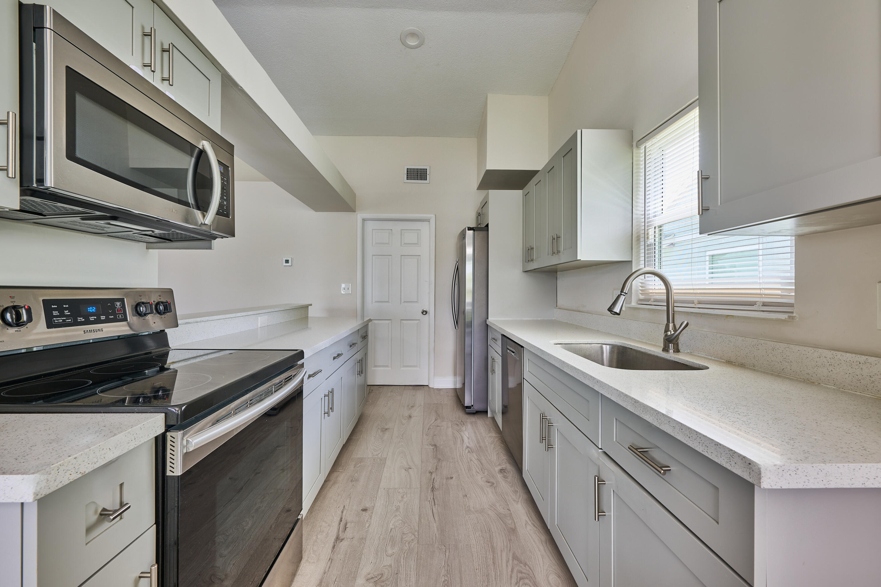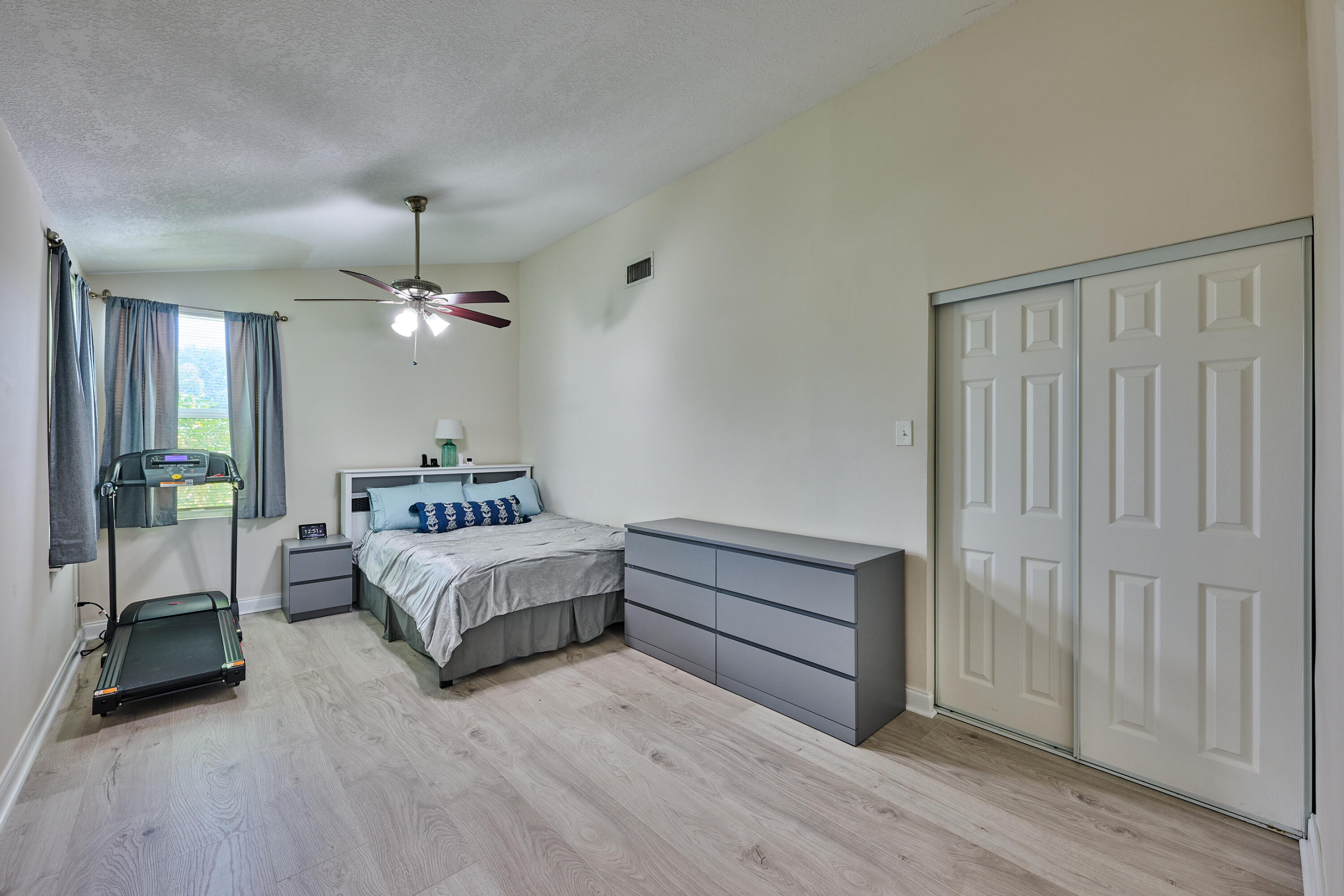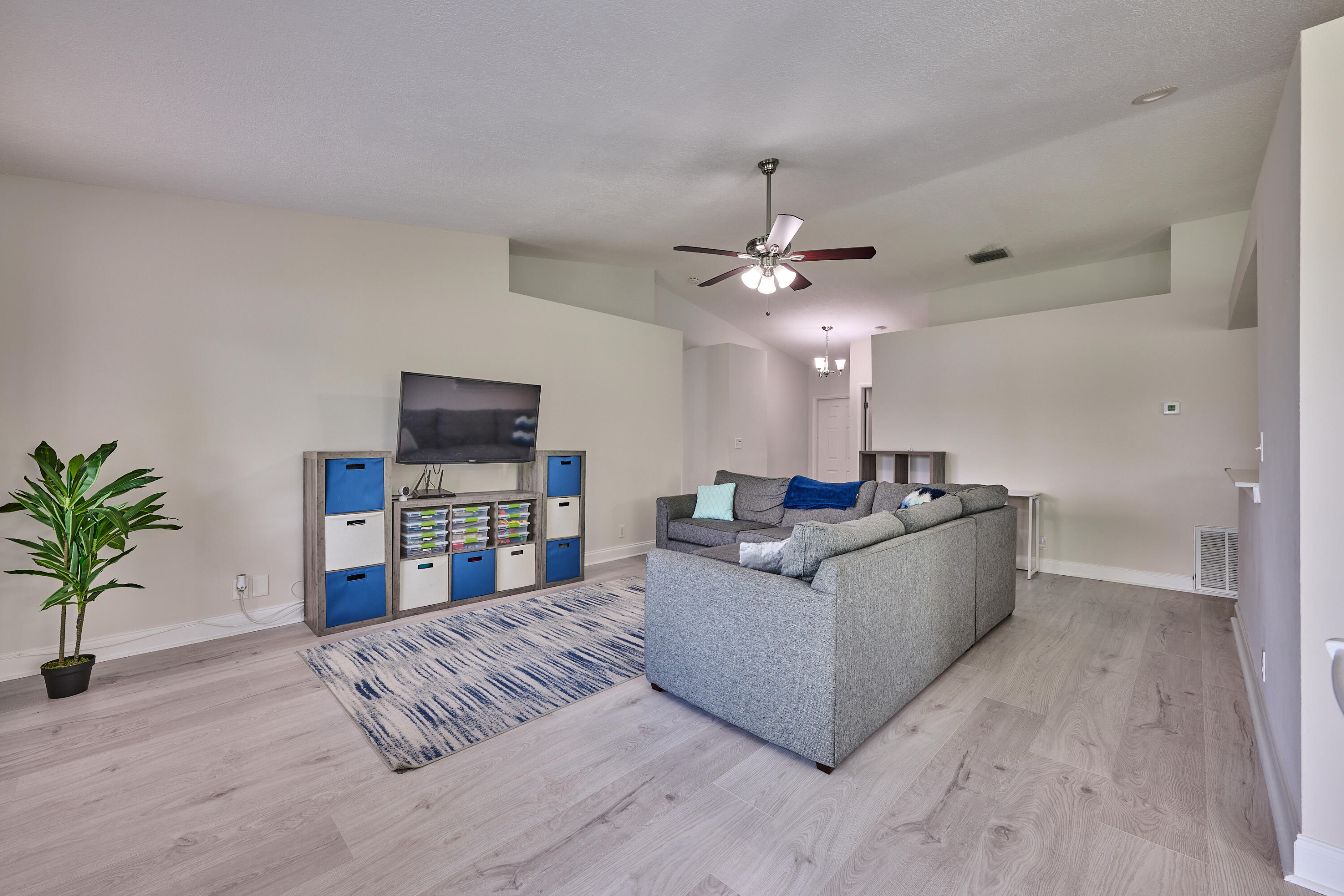 This bright and open home welcomes you with soaring cathedral ceilings that fill the space with natural light. The kitchen has been beautifully updated with modern gray shaker cabinets, sparkling quartz countertops, and sleek stainless steel appliances. Just off the kitchen, a versatile bonus room is currently being used as a 4th bedroom.Luxury vinyl plank flooring flows seamlessly throughout the home, complemented by freshly painted interior walls. The exterior and driveway have also been recently painted, giving the property a crisp, move-in-ready feel.Both bathrooms have been tastefully renovated with new vanities, stylish light fixtures, and updated shower tile. Major upgrades add peace of mind, including a new roof (2019) and complete impact windows and doors.
