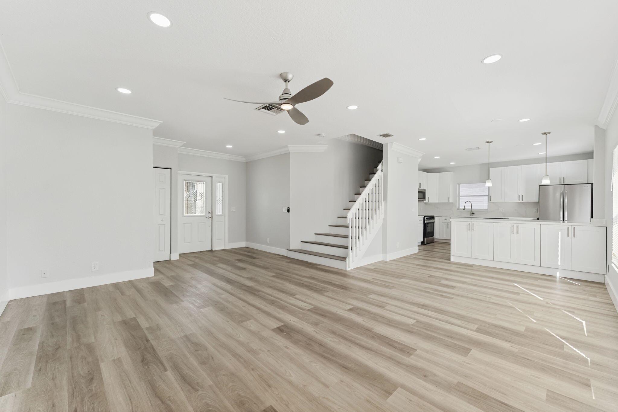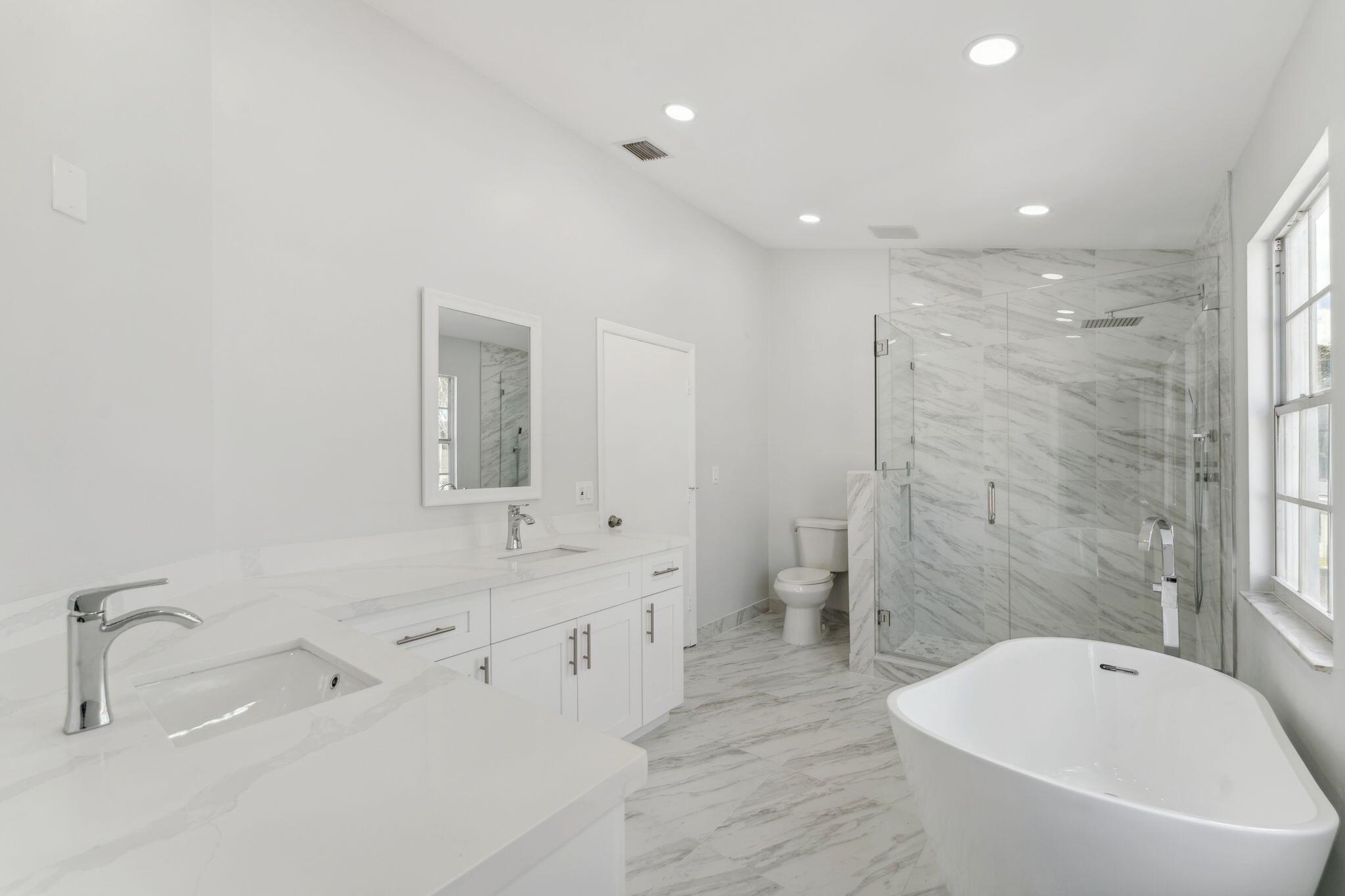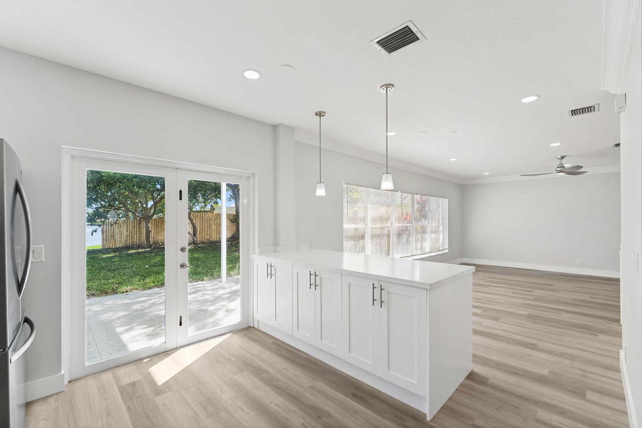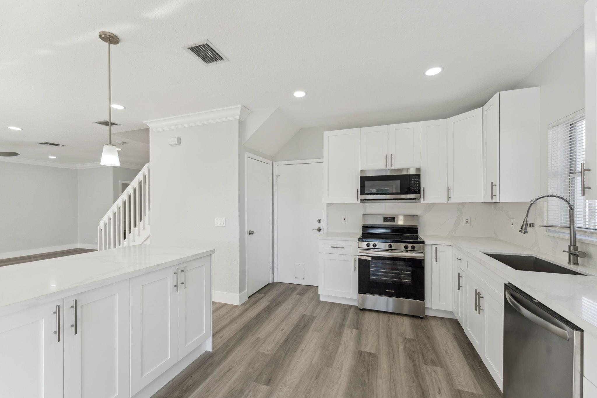 Step into this gorgeous waterfront home and enjoy stunning lake views from the moment you enter. This completely renovated property offers 3 bedrooms, 2.5 baths, and 1,666 SF of living space with a desirable split-bedroom floor plan. No detail has been overlooked, featuring a brand-new roof (2024), luxury vinyl flooring, porcelain tile in all bathrooms, modern recessed lighting, and updated fixtures throughout.The gourmet kitchen showcases quartz countertops, white shaker soft-close cabinetry, an oversized island, and premium Frigidaire appliances. The spacious primary suite includes a walk-in closet and a spa-like bathroom with a freestanding tub and dual quartz vanities.Additional highlights include a brand new 4-ton Rheem AC system, hurricane-impact garage door, full-size