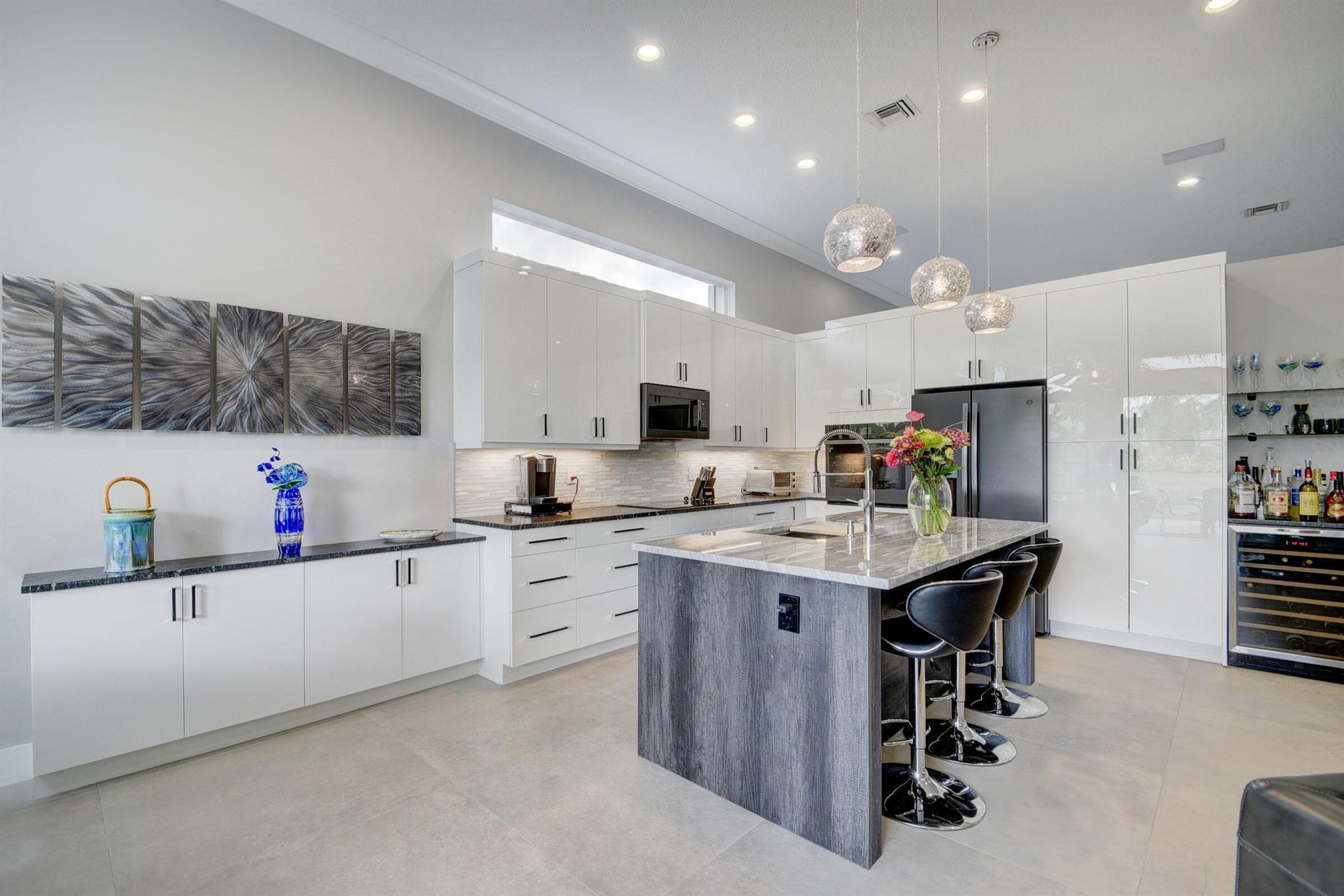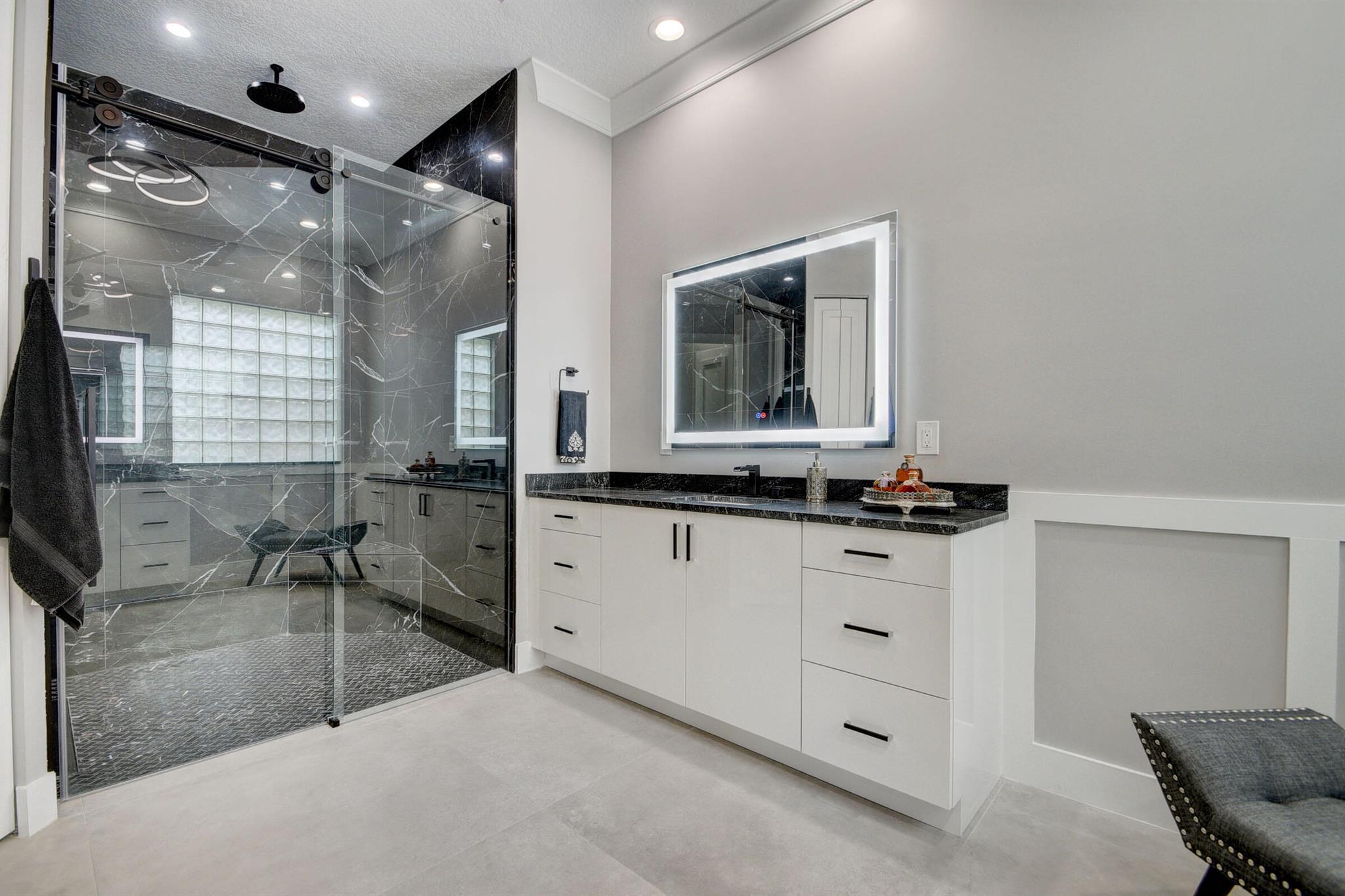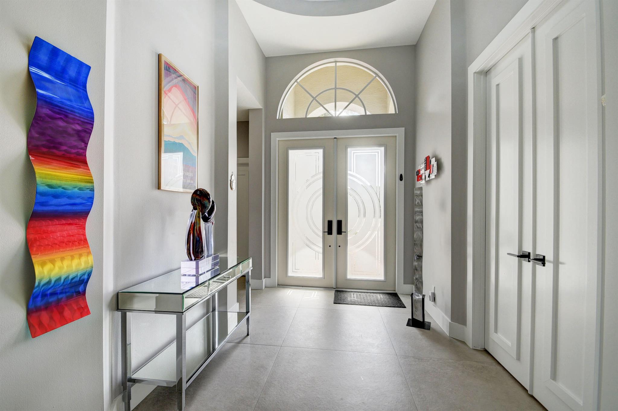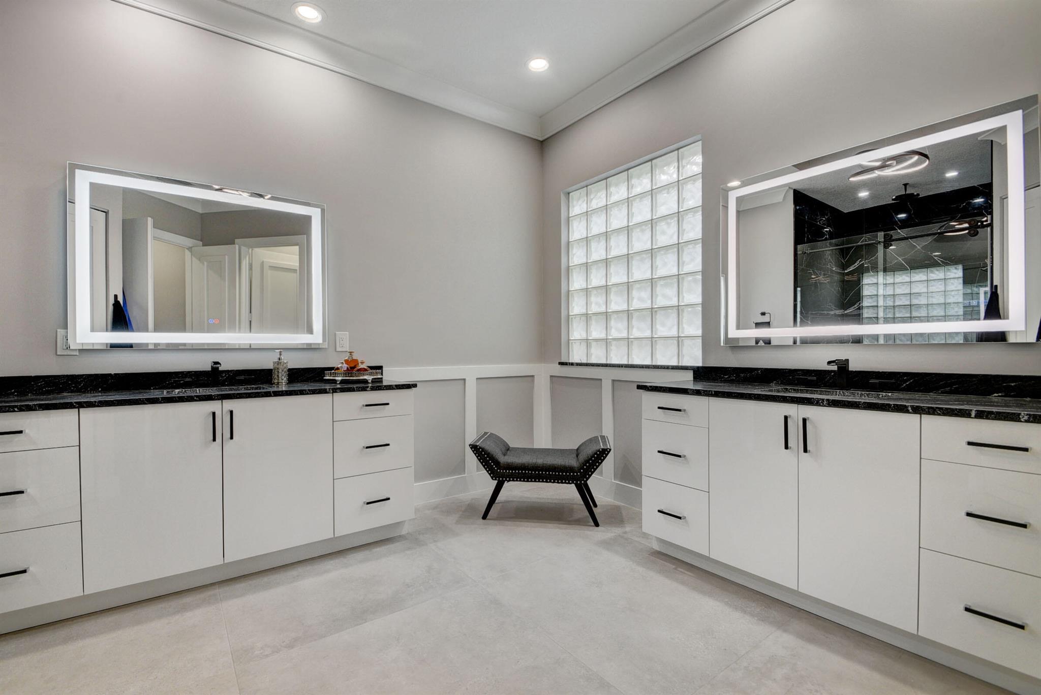 Renovated with every detail in mind, this 4-bedroom, 4-bathroom waterfront home offers a contemporary yet warm design. Oversized 3.25' x 3.25' tile floors, new baseboards, crown moldings, door frames and moldings. Open kitchen, 42-inch cabinetry, quartz countertops, tiled backsplash, raised oven, wine cooler, large island with bar seating Soft-close cabinets and drawers throughout. Flexible floor plan with unique converted DR to office and a media-style living room. The primary suite showcases a custom wood accent wall with fountain & lake views. The bath boasts dual oversized vanities with heated mirrors and an expanded glass-enclosed rain shower with wall and ceiling fixtures. Each guest room has its own updated en-suite bath with raised cabinetry and frameless glass doors.