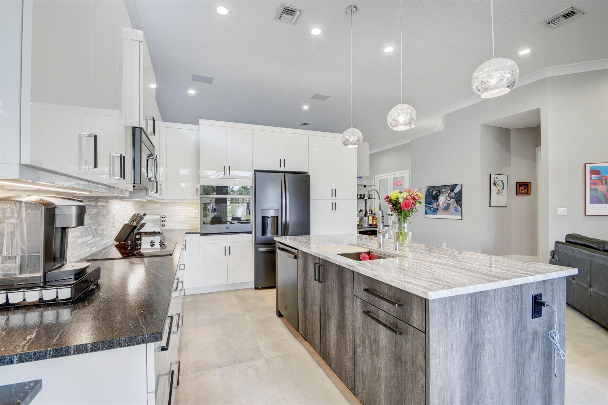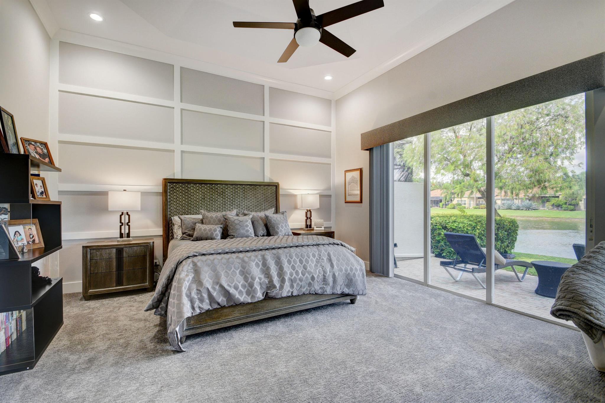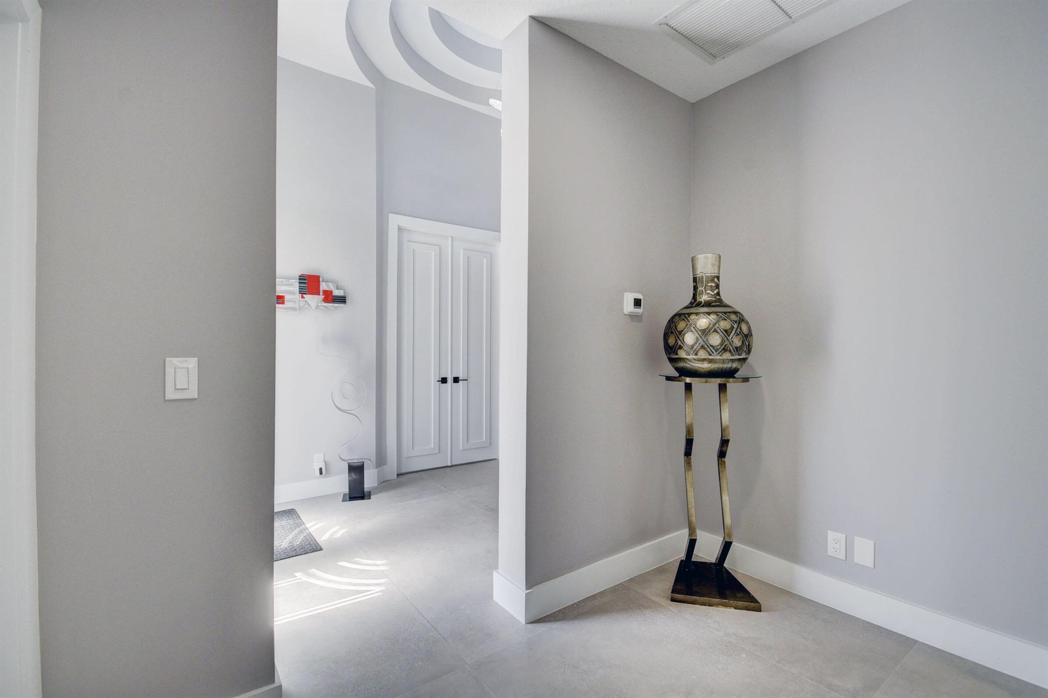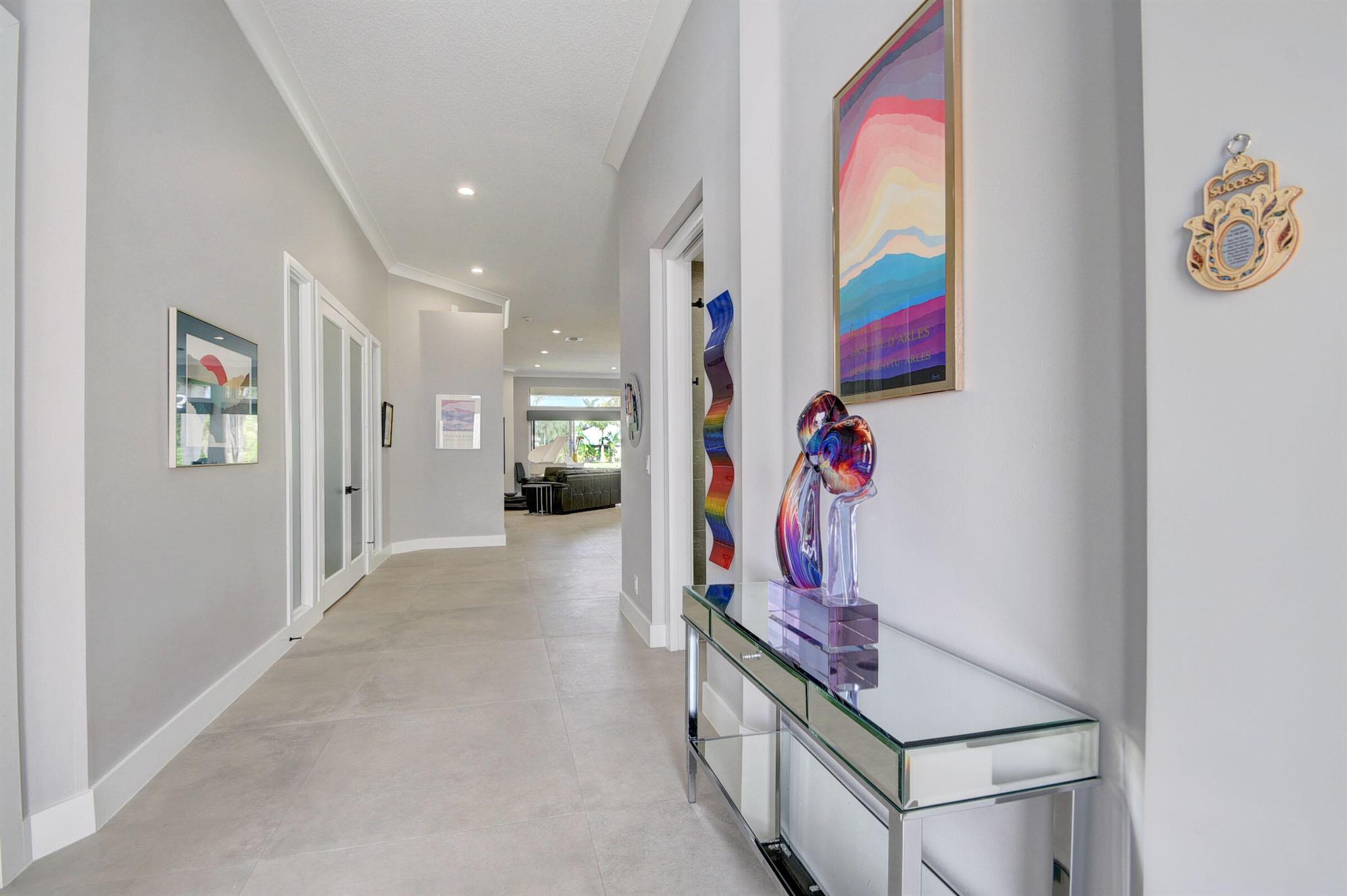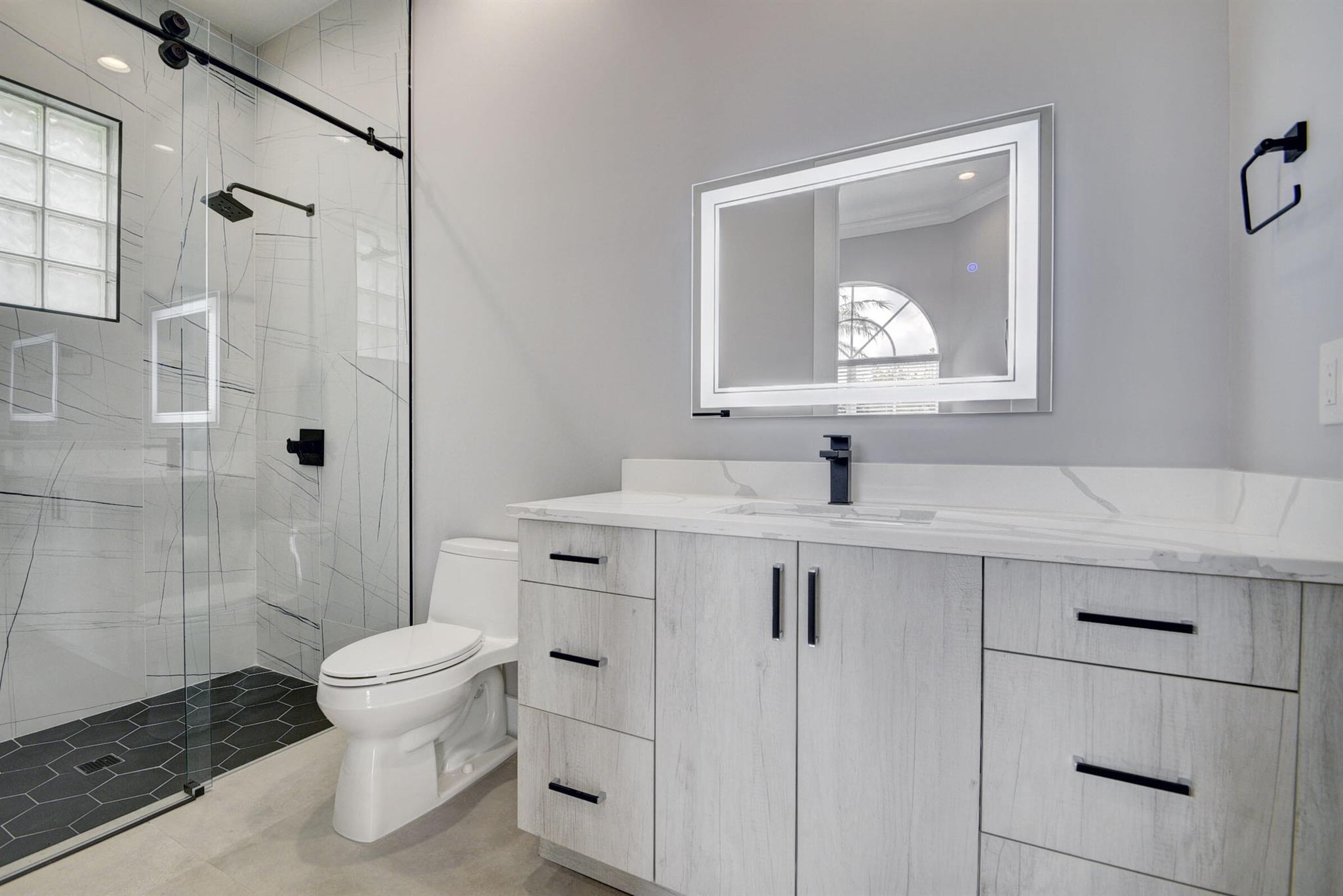 Renovated with every detail in mind, this 4-bedroom, 4-bathroom waterfront home offers a contemporary yet warm design. Oversized 3.25' x 3.25' tile floors, new baseboards, crown moldings, door frames and moldings. Open kitchen, 42-inch cabinetry, quartz countertops, tiled backsplash, raised oven, wine cooler, large island with bar seating Soft-close cabinets and drawers throughout. Flexible floor plan with unique converted DR to office and a media-style living room. The primary suite showcases a custom wood accent wall with fountain & lake views. The bath boasts dual oversized vanities with heated mirrors and an expanded glass-enclosed rain shower with wall and ceiling fixtures. Each guest room has its own updated en-suite bath with raised cabinetry and frameless glass doors.