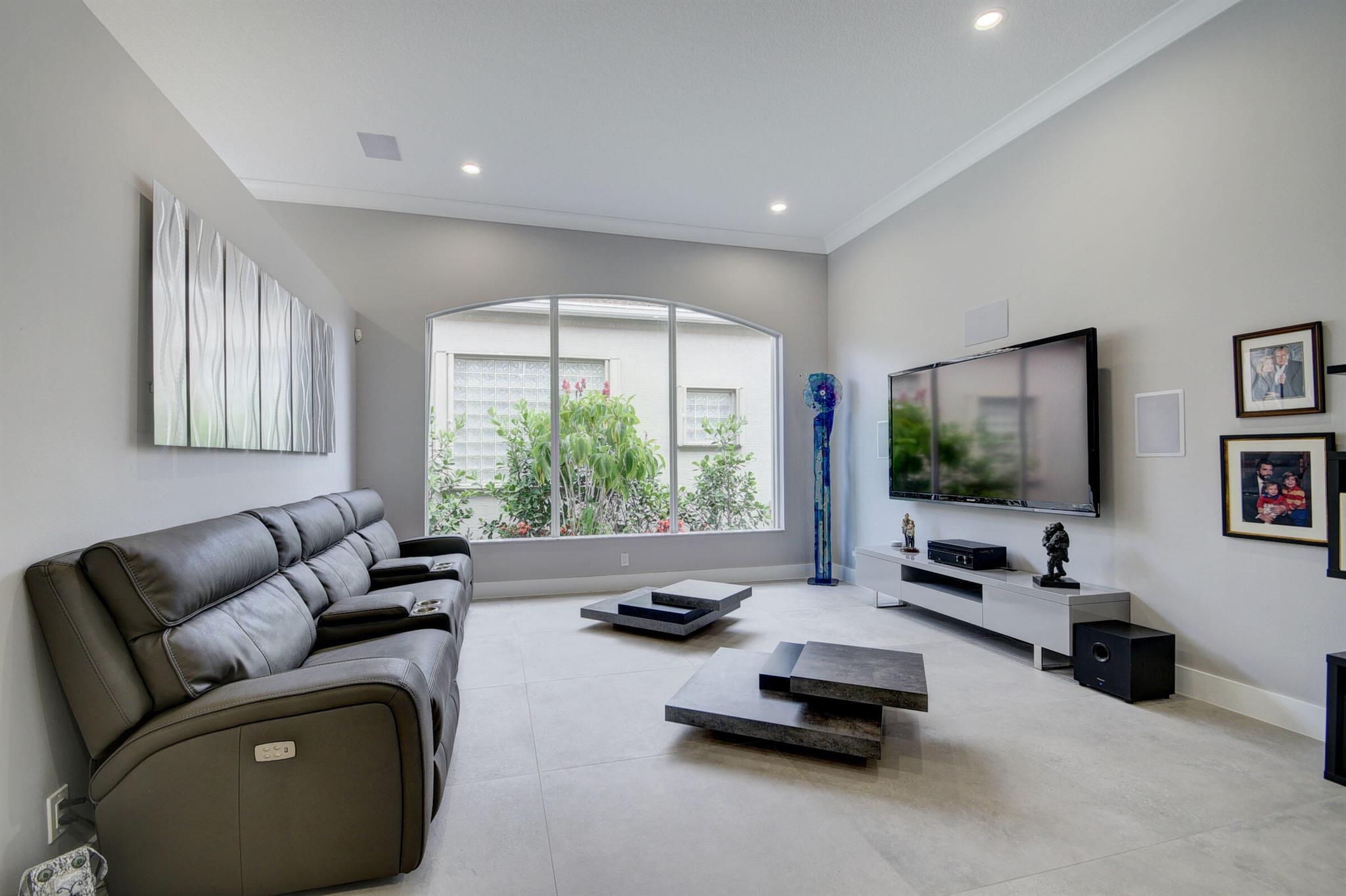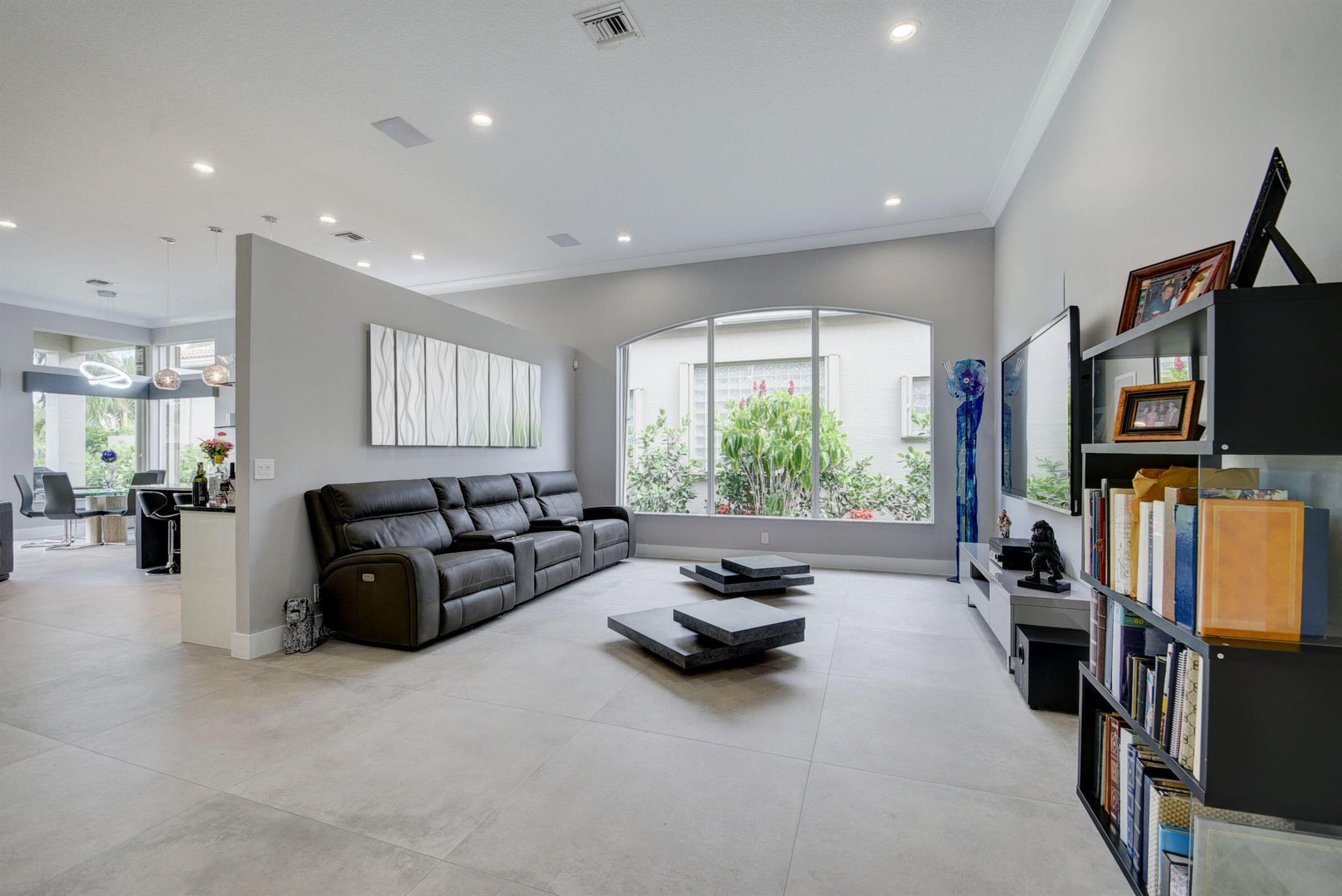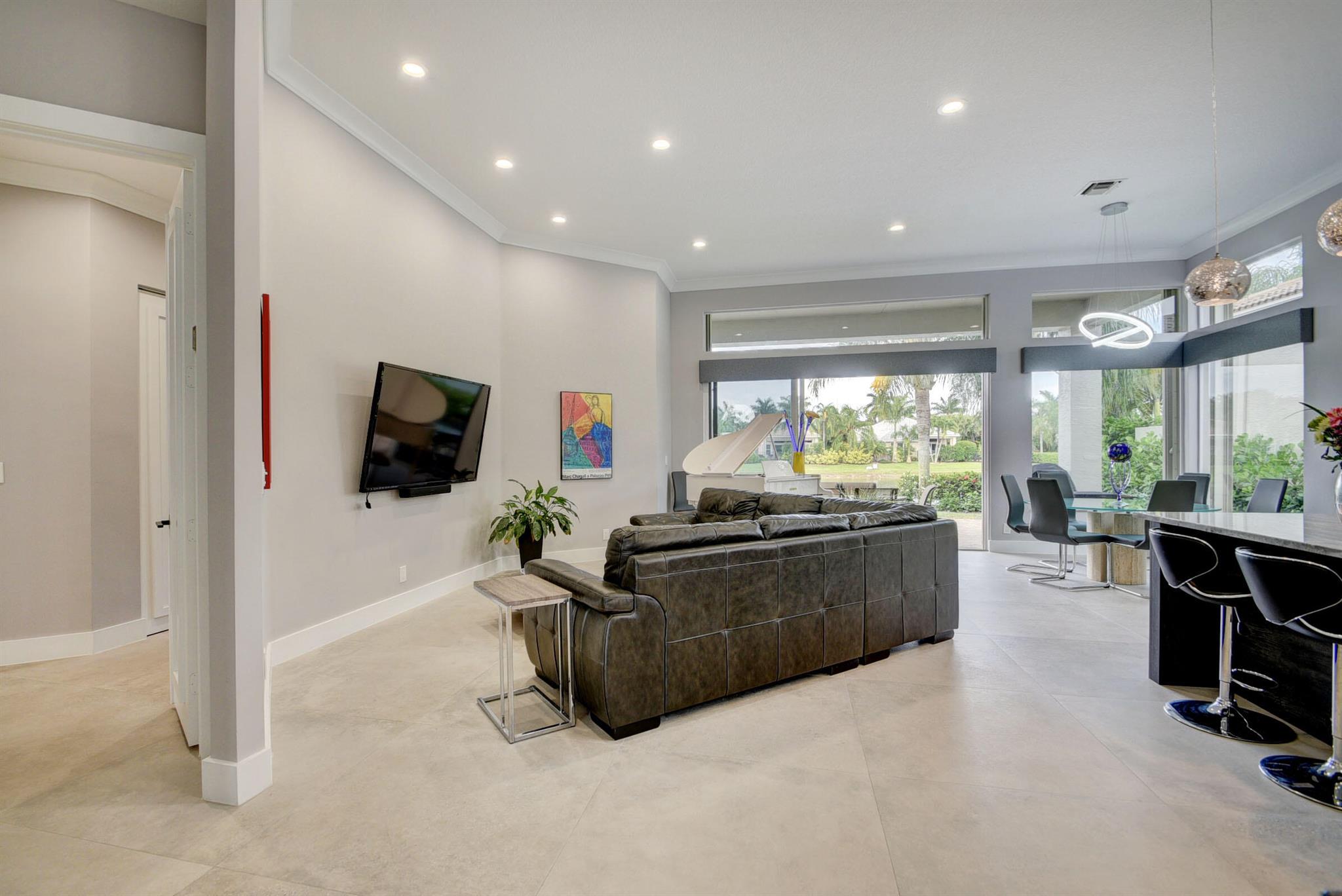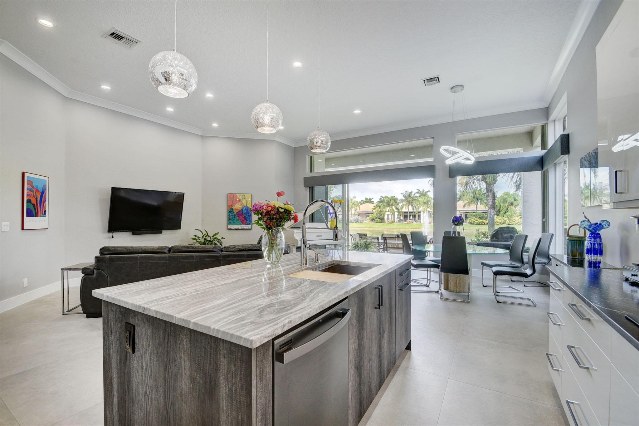 Renovated with every detail in mind, this 4-bedroom, 4-bathroom waterfront home offers a contemporary yet warm design. Oversized 3.25' x 3.25' tile floors, new baseboards, crown moldings, door frames and moldings. Open kitchen, 42-inch cabinetry, quartz countertops, tiled backsplash, raised oven, wine cooler, large island with bar seating Soft-close cabinets and drawers throughout. Flexible floor plan with unique converted DR to office and a media-style living room. The primary suite showcases a custom wood accent wall with fountain & lake views. The bath boasts dual oversized vanities with heated mirrors and an expanded glass-enclosed rain shower with wall and ceiling fixtures. Each guest room has its own updated en-suite bath with raised cabinetry and frameless glass doors.