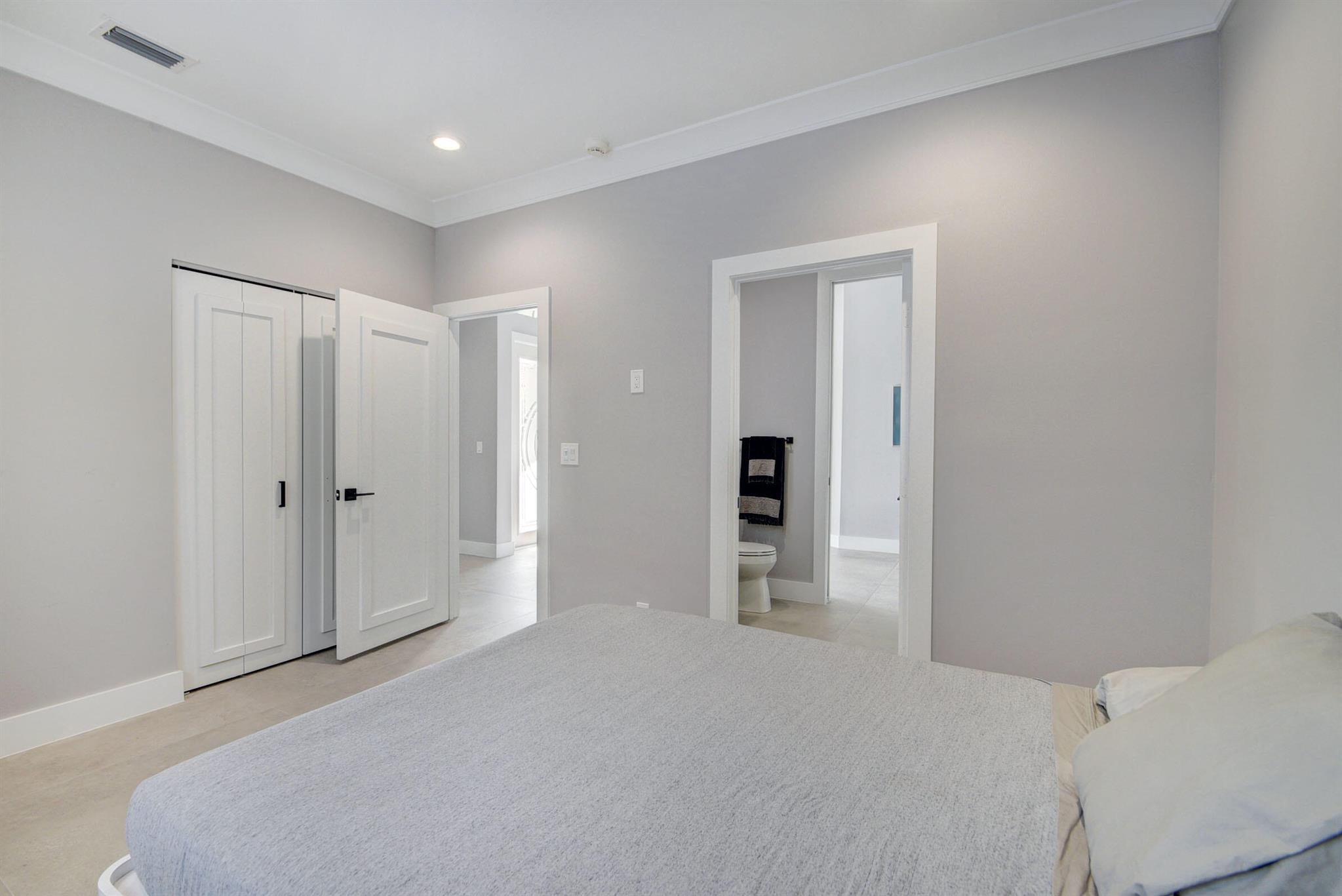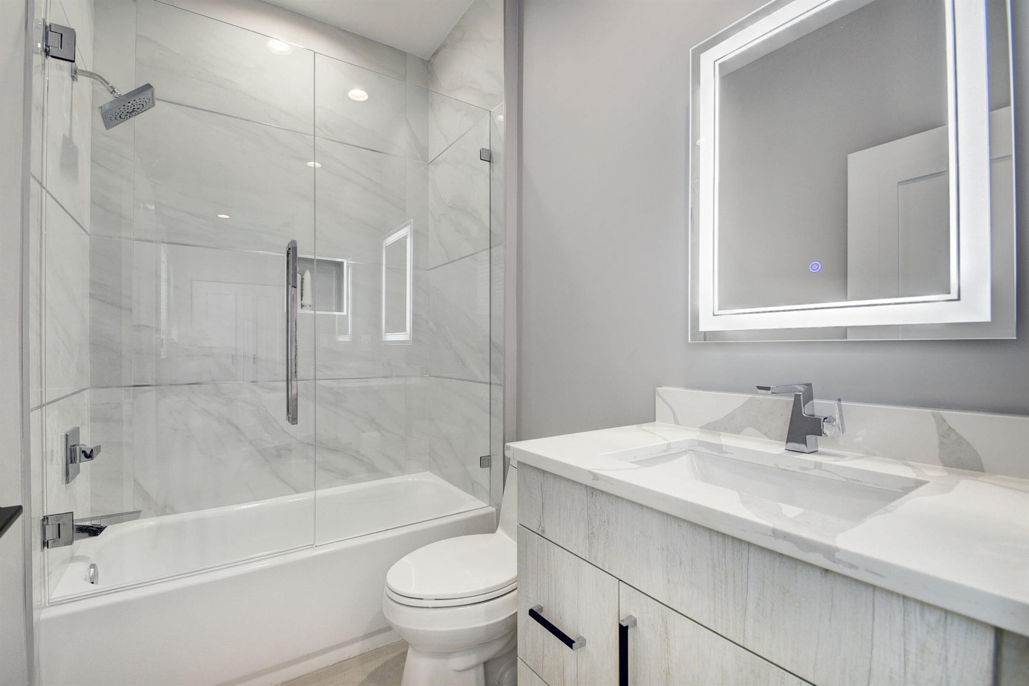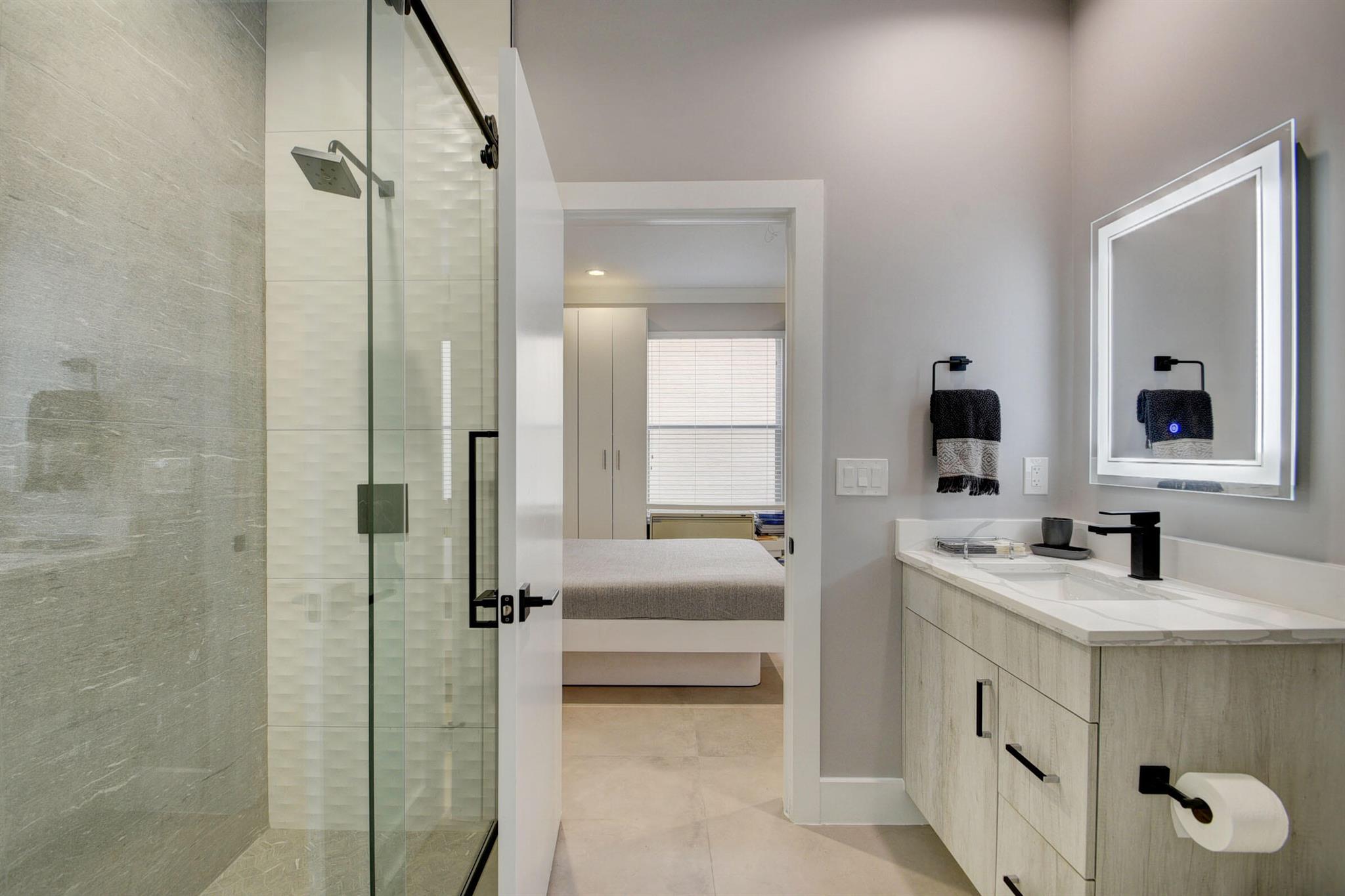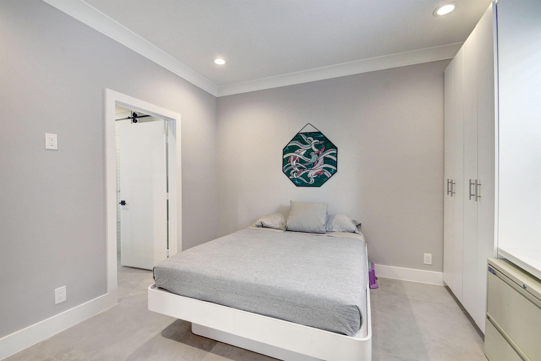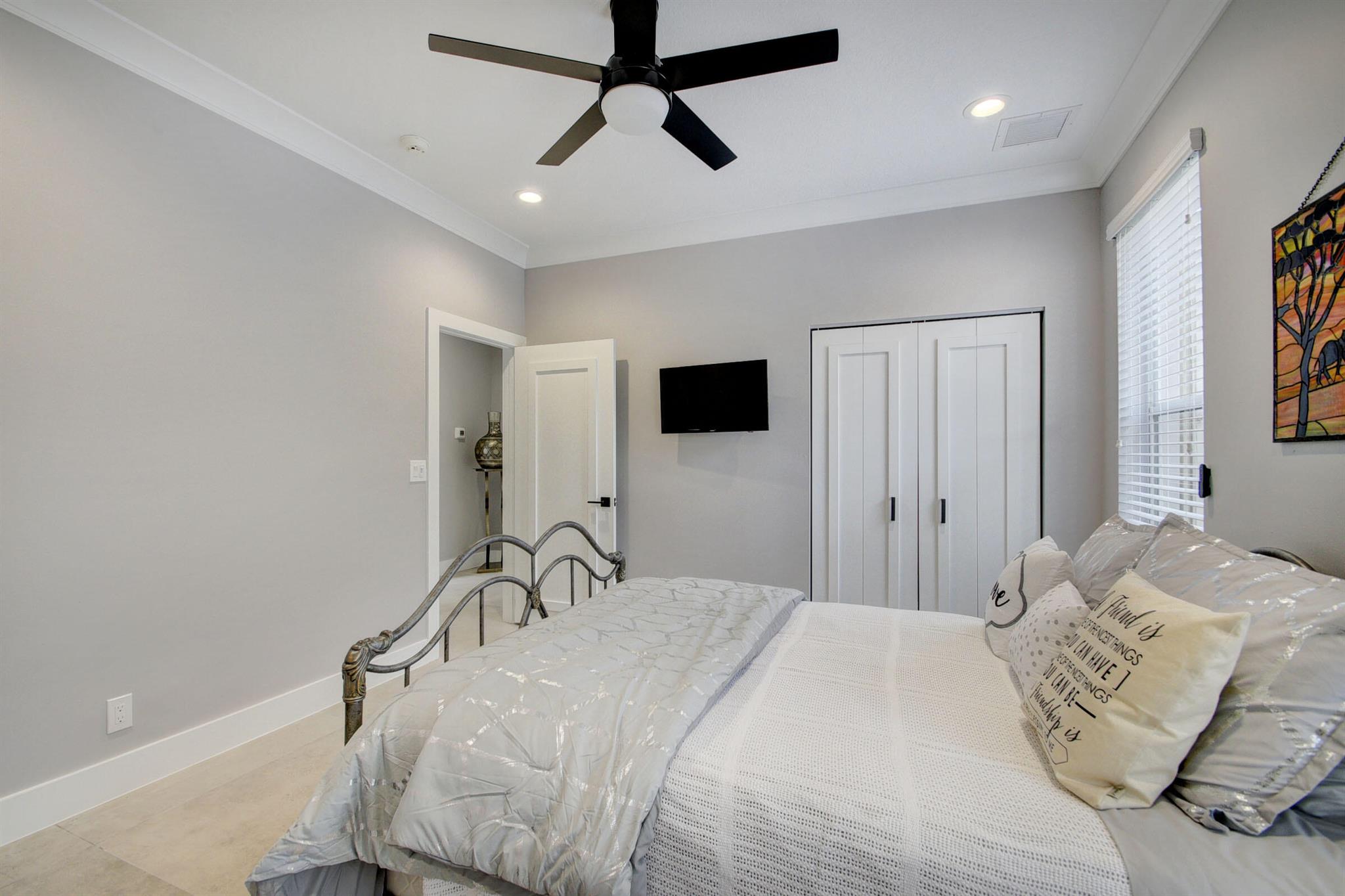 Renovated with every detail in mind, this 4-bedroom, 4-bathroom waterfront home offers a contemporary yet warm design. Oversized 3.25' x 3.25' tile floors, new baseboards, crown moldings, door frames and moldings. Open kitchen, 42-inch cabinetry, quartz countertops, tiled backsplash, raised oven, wine cooler, large island with bar seating Soft-close cabinets and drawers throughout. Flexible floor plan with unique converted DR to office and a media-style living room. The primary suite showcases a custom wood accent wall with fountain & lake views. The bath boasts dual oversized vanities with heated mirrors and an expanded glass-enclosed rain shower with wall and ceiling fixtures. Each guest room has its own updated en-suite bath with raised cabinetry and frameless glass doors.