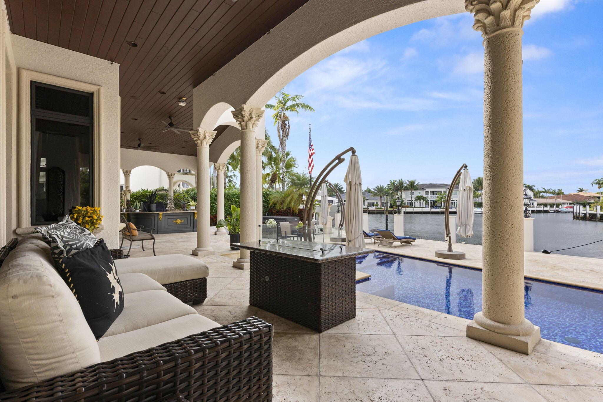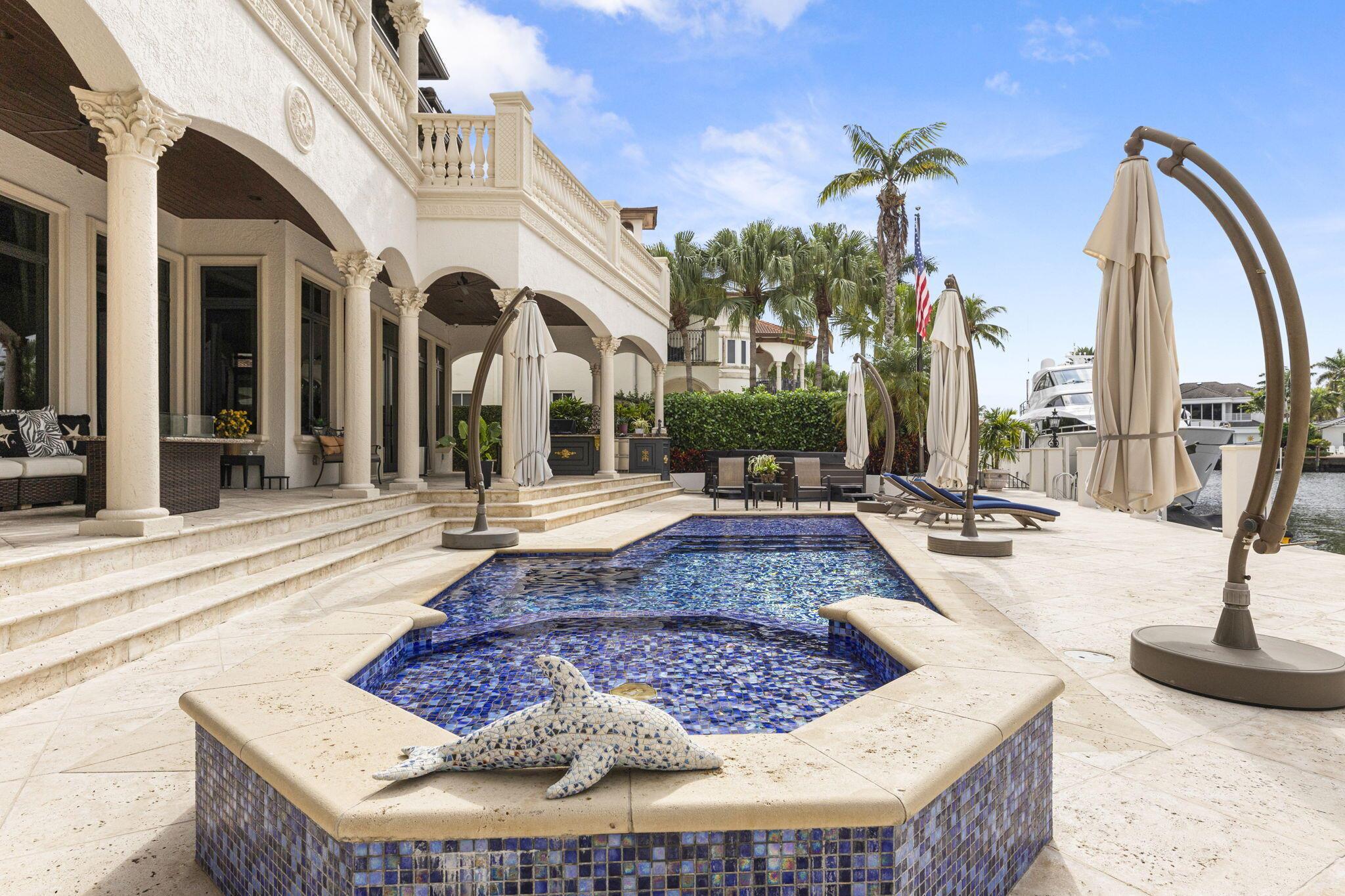 Experience Lighthouse Point's unparalleled waterfront living in this classic coastal-style estate home. This home's versatile floor plan is meticulously designed and crafted. Emulating its coastal surroundings, each element of this home has been curated to enhance functionality and style with sophisticated finishes, high-end design details, and thoughtful elements to enrich everyday life. Situated on 108 feet of water frontage, you will enjoy the long, spectacular sunset views from your observation deck while lounging at your resort-style custom tiled pool with 12 person jacuzzi and summer kitchen. A boater's dream location extra wide turning basin, with extra deep water dock upgraded electrical power, This one-of-a-kind property includes a private workout room, theater, see supplement in