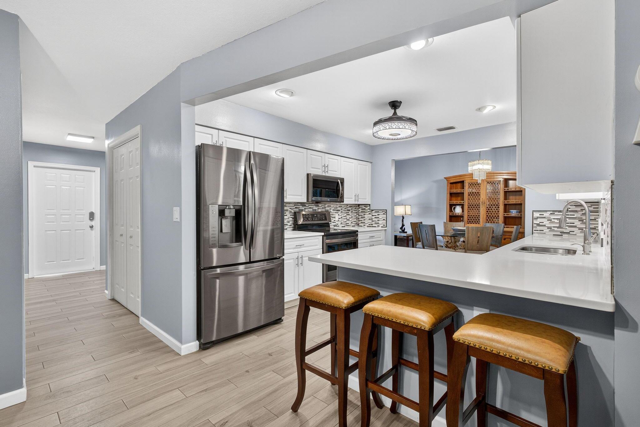 Welcome to this beautifully updated 3-bedroom, 2-bath corner-lot home in Sugar Pond Manor, offering the perfect blend of style, comfort, and functionality--all with no HOA restrictions. Step inside and be impressed by the expansive split floor plan, ideal for both entertaining and privacy. The home showcases continuous wood-look porcelain tile flooring throughout, creating a warm, modern aesthetic. The designer kitchen features quartz countertops, custom cabinetry, and recently updated stainless steel appliances--a dream for any home chef. Both bathrooms have been fully remodeled with high-end finishes, offering a spa-like feel with timeless design. Enjoy year-round comfort with a newer A/C and water heater, plus the long-term savings of fully owned solar panels.
