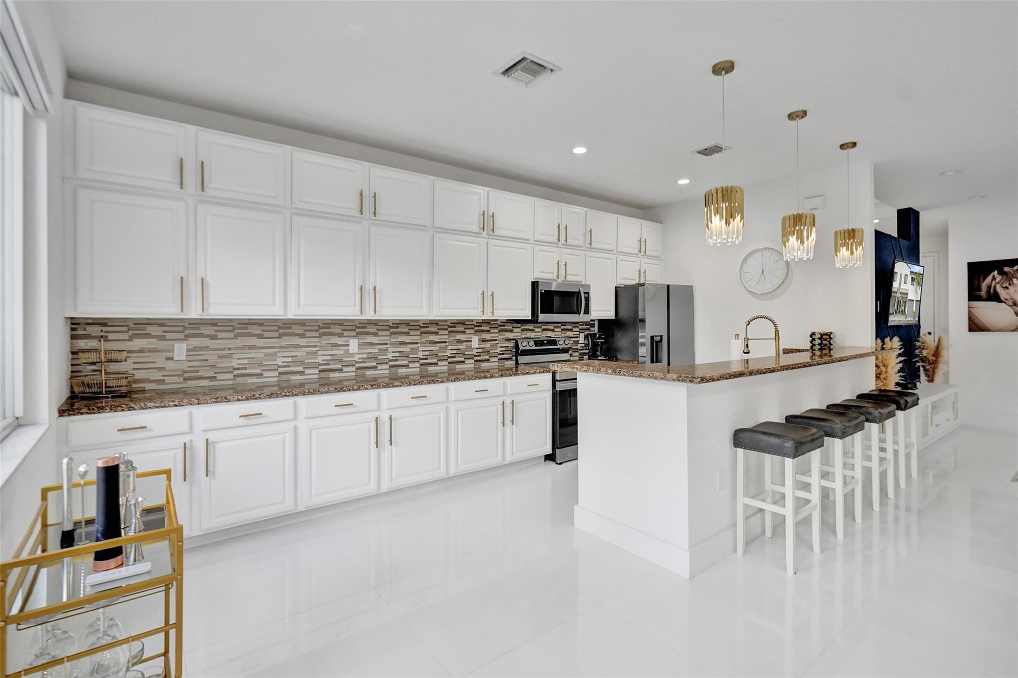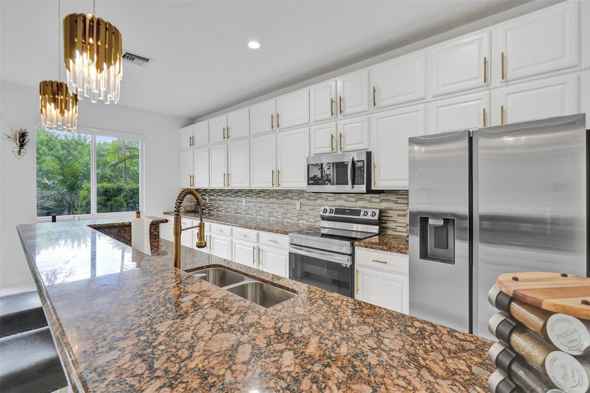 Gorgeous 3 bed/2.5 bath, 2-story townhome with high-volume ceilings in a highly desired gated community, just 6 mins from the beach. The primary suite features two walk-in closets and a spacious bath. Highlights include large kitchen w/ granite counters, lots of cabinet space, brass accent handles/lighting, SS appl, white porcelain 24x24 tile throughout main floor, high-quality water resistant laminate on the 2nd floor, a sleek glass and steel staircase, impact windows and doors, and a lovely back patio/yard just off the kitchen and dining area. Parking includes a 1-car garage plus a covered carport. With new restaurants, entertainment, and waterfront projects underway, Pompano Beach is rapidly transforming making this home not only a perfect lifestyle choice but also a smart investment.