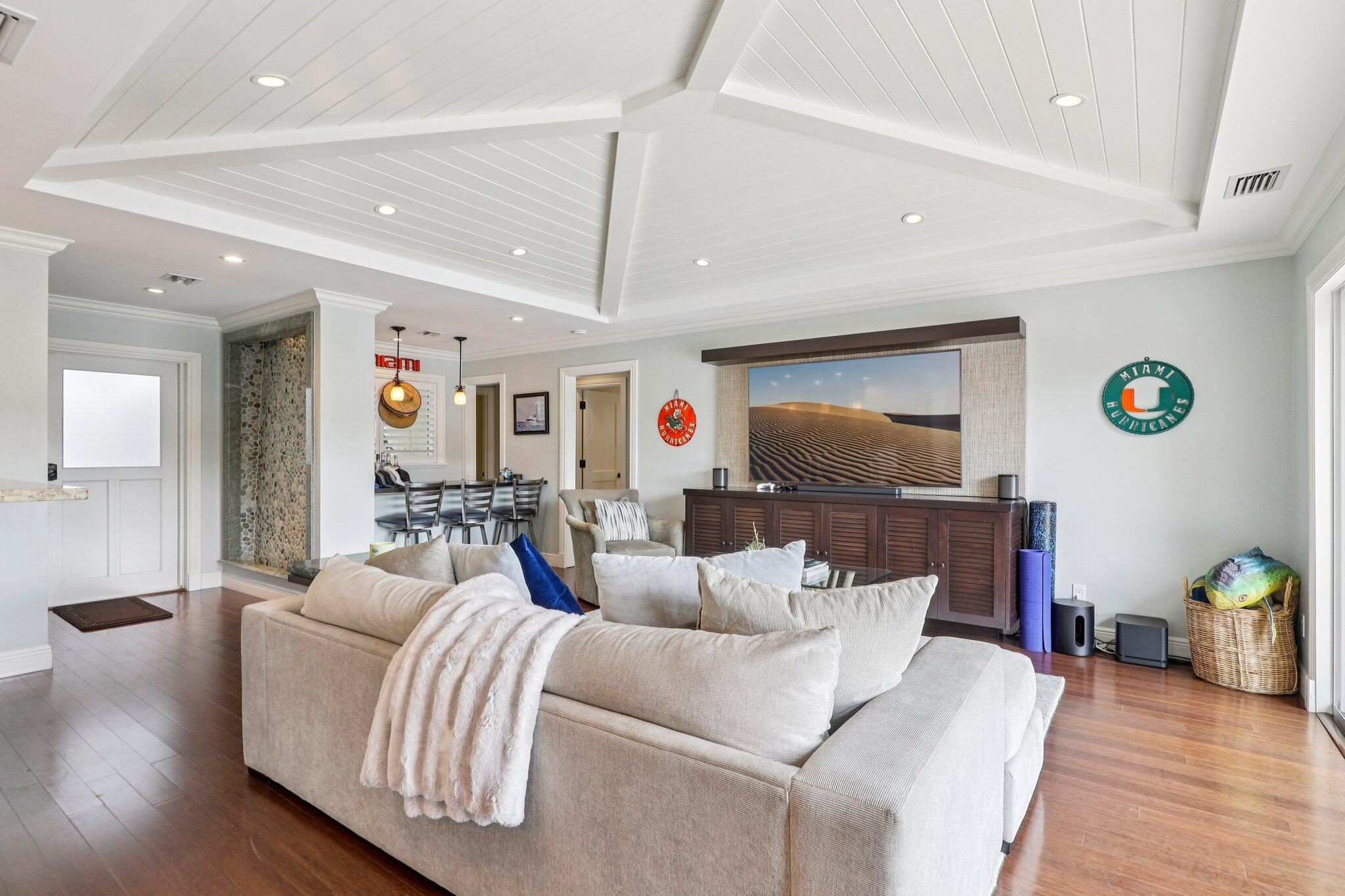 Experience the ultimate in coastal living on a 120' wide southern exposure canal with 75' of premier no fixed bridge waterfront. The closest block to dining & the beach. This private retreat blends elegance and ease. Professionally designed interior showcases vaulted ceilings w/custom woodwork, custom bar, & an open chef's kitchen with breakfast bar, gas cooking, and new stainless appliances (2023). The split floor plan creates seamless flow for living and entertaining. Outdoors, lush landscaping frames a heated saltwater pool, covered bar, and 2021-65' composite dock. Upgrades include AC (2020), Roof, tankless water heater, PVC plumbing, LED lighting, electrical, smart thermostat, and a full-home renovation(2013). Finished with a coral stone drive, incredible landscaping & polished feel.