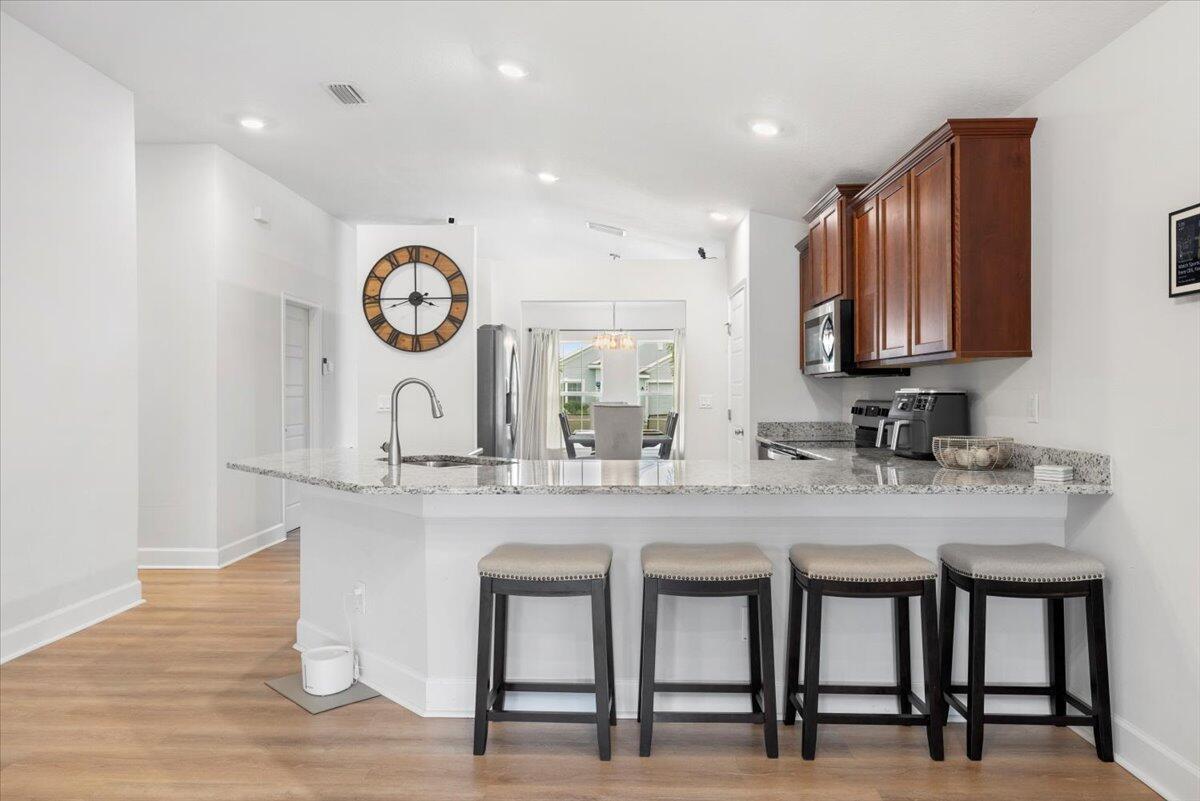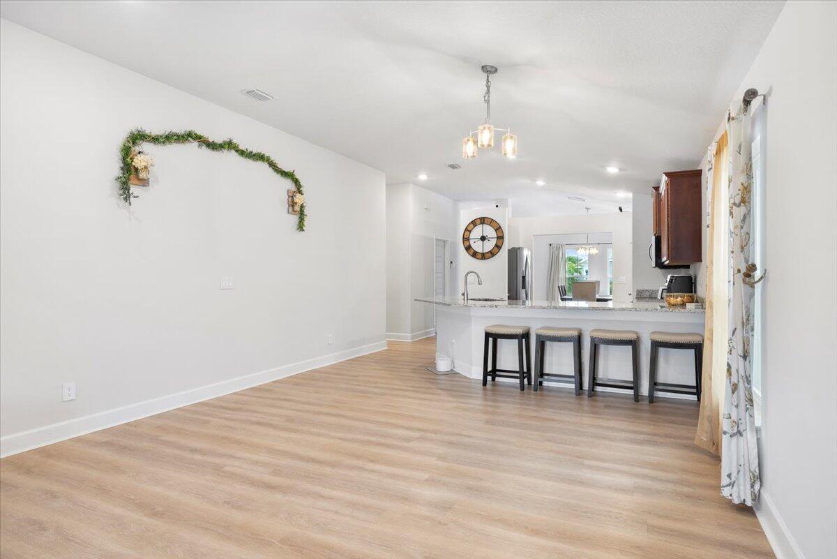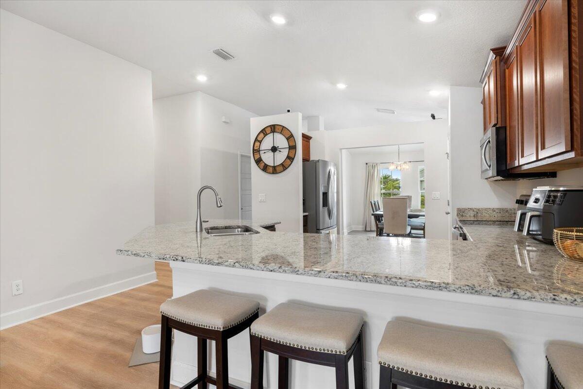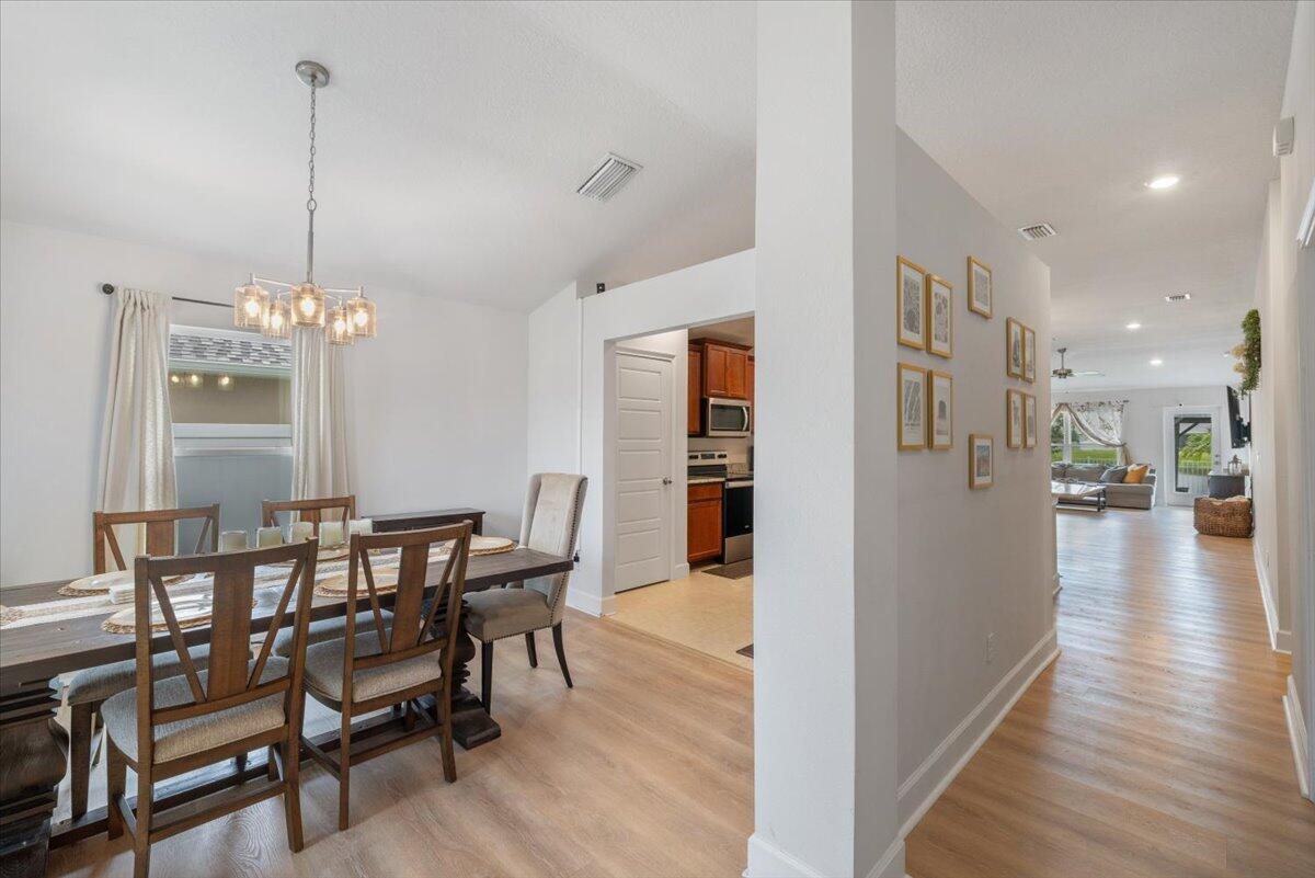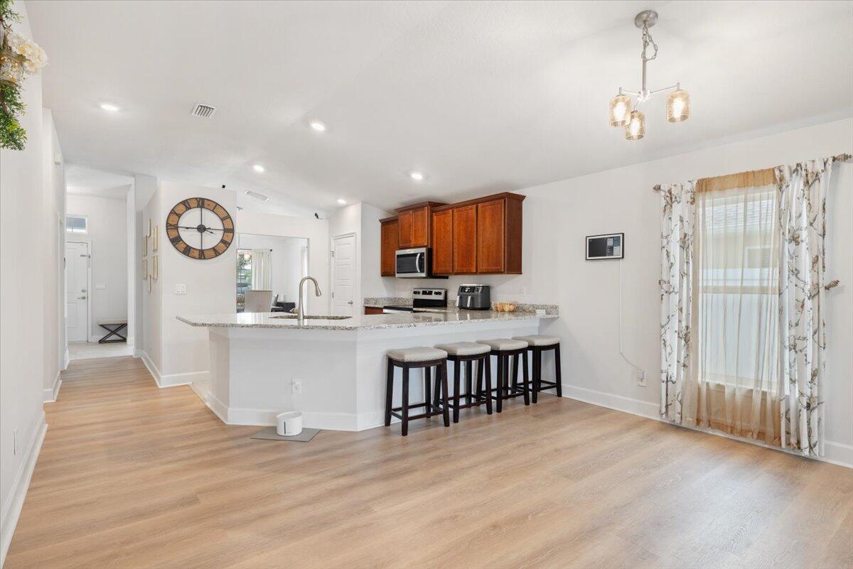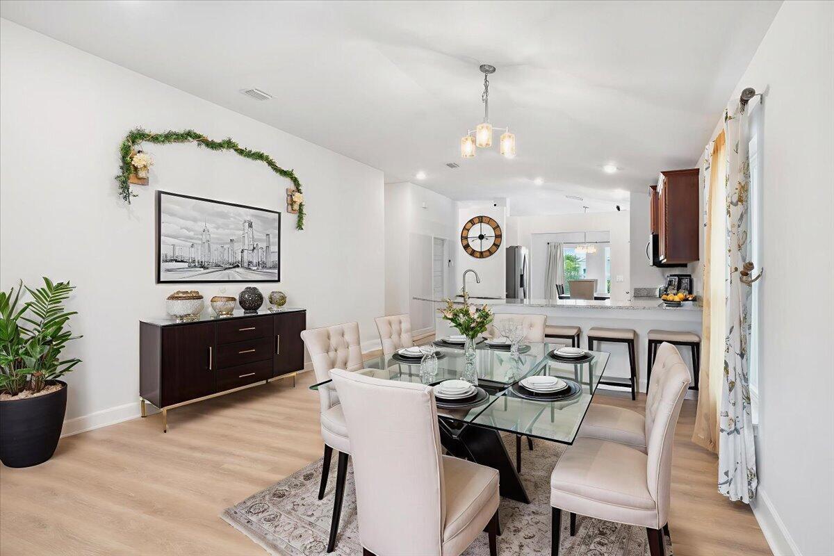 Welcome to Waterstone--a vibrant community where modern convenience meets serene waterfront living. This stunning 4-bedroom, 2-bathroom home with a massive 620sqft 3-car garage, built by Adams Homes in 2021, sits on a premium lot offering peaceful water views and thoughtful upgrades throughout. Step inside to an open floor plan adorned with LifeProof Dusk Cherry vinyl plank flooring and a gourmet kitchen featuring a peninsula-style granite countertop, ideal for casual dining or entertaining. The home's upgrades blend style and function--a hybrid heat-pump water heater (2022) for energy efficiency, solar panels by Windmar Solar financed through Sunnova, and a smart home system complete with Alexa-compatible switches, thermostat, and Blink outdoor cameras for peace of mind.