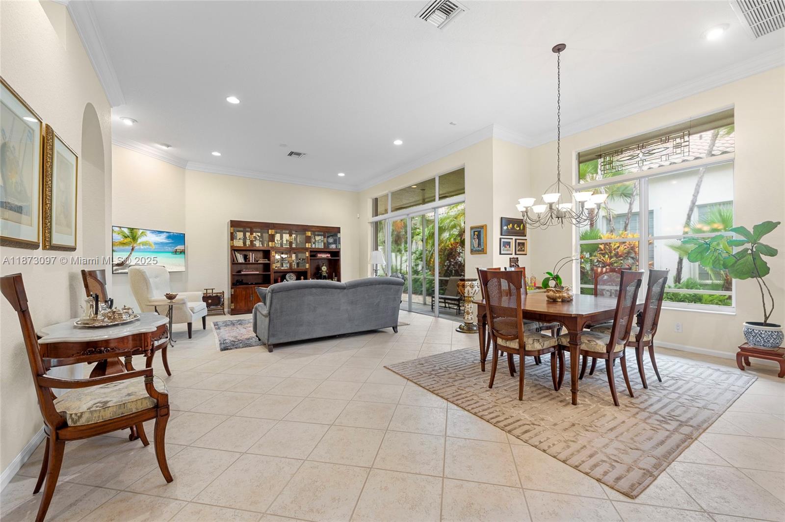 Set on a quiet corner in Bay Pointe at Weston Hills CC, this well-kept one-story home offers 3BD/3BA and natural light. Inside, volume ceilings and large windows frame serene garden views. Porcelain-tile living areas; kitchen with white cabinetry, stone counters, and breakfast nook. Private primary suite with wood flooring, sitting area, and spa bath with Roman tub, separate shower, and dual sinks. Guest bedroom with wood flooring. Custom California Closets throughout the home. Outdoors, a screened patio spans the back for al fresco dining. Spacious backyard has room for a pool and a summer kitchen. Recent updates: water heater 2024, A/C 2020, full accordion shutters. The association maintains landscaping, sprinklers, exterior paint, and pressure cleaning.