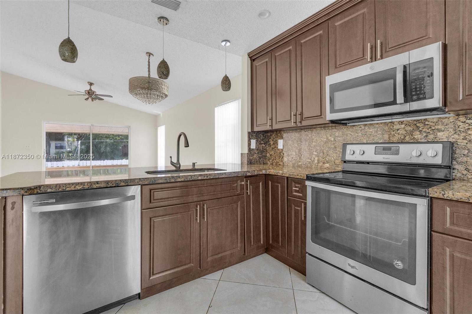 Welcome home to this charming 3-bedroom, 2-bath residence perfectly situated just off the Turnpike with a low HOA. Inside, you’ll find a split bedroom floor plan, vaulted ceilings, and a spacious kitchen with a pass-through to the dining room. Recent updates include a new stainless steel dishwasher and disposal, newer stove and refrigerator, as well as a newer washer and dryer. Both bathrooms have been tastefully retiled. Step outside to your enclosed patio with tranquil lake views, plus an additional concrete area ideal for grilling. The community pool is conveniently located right across the street.