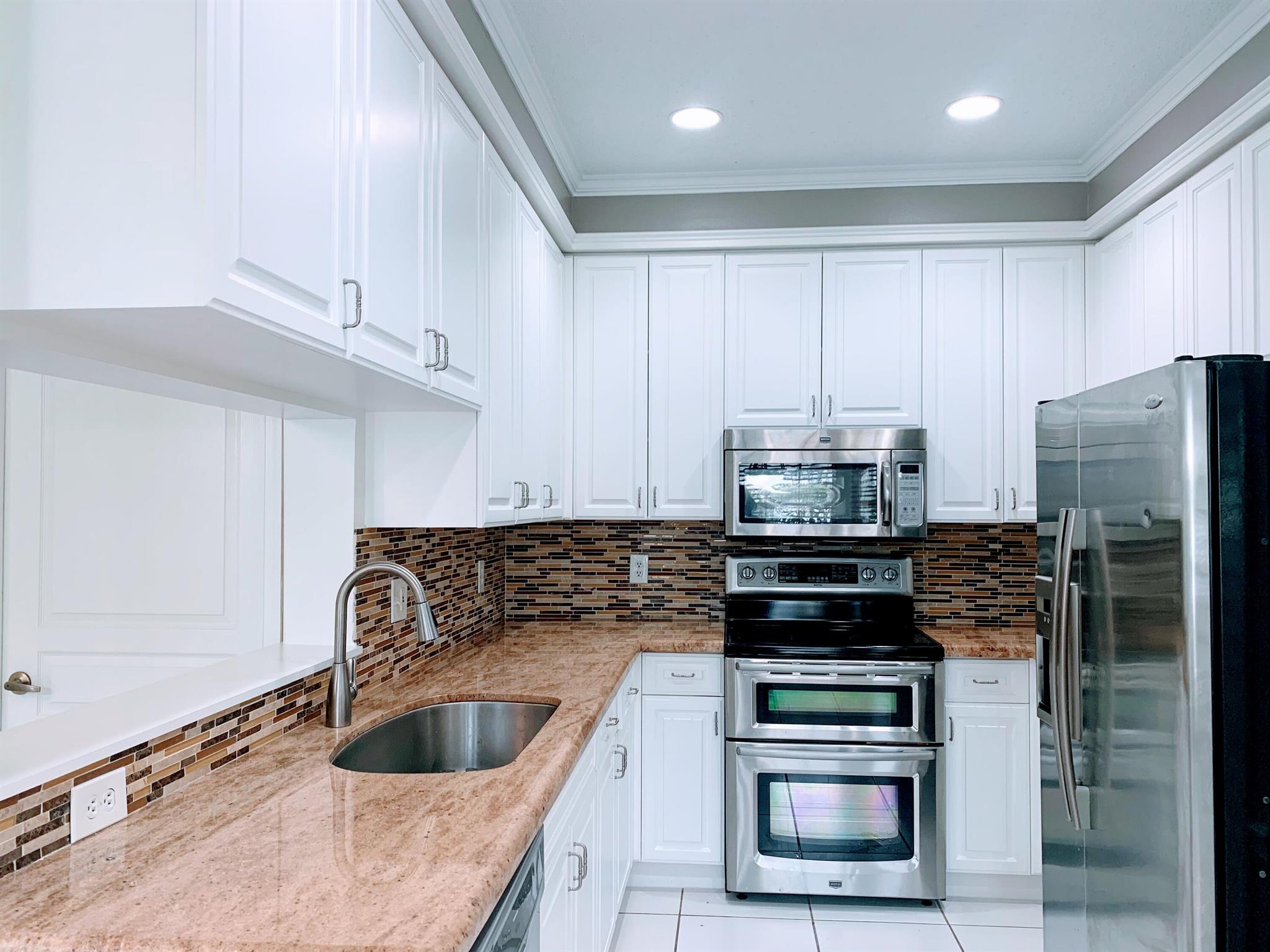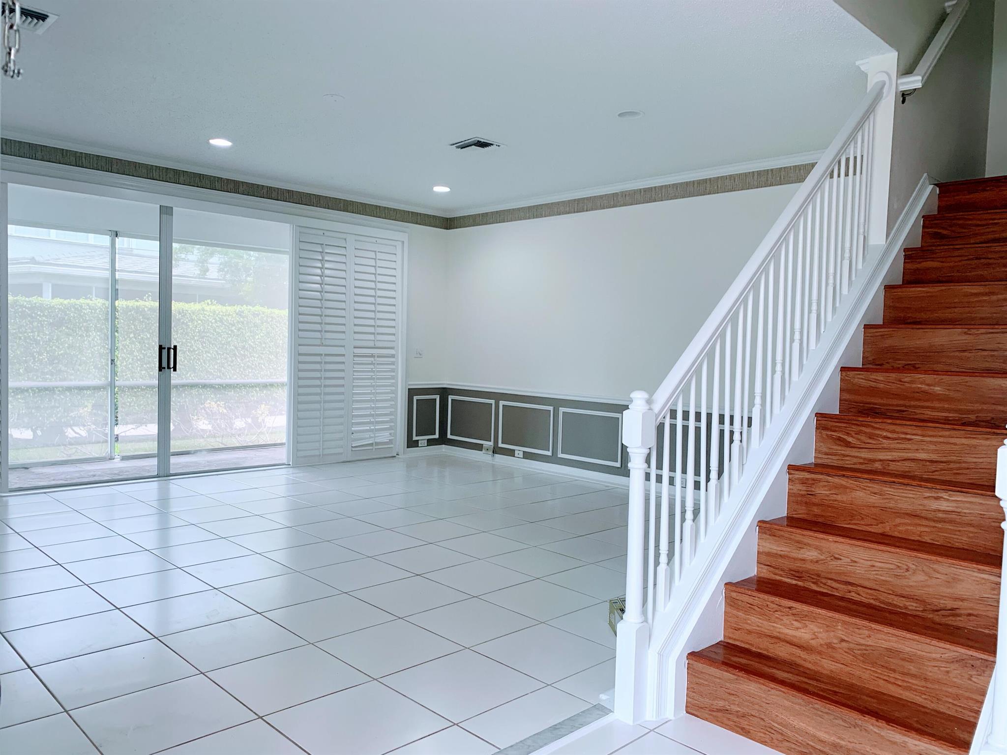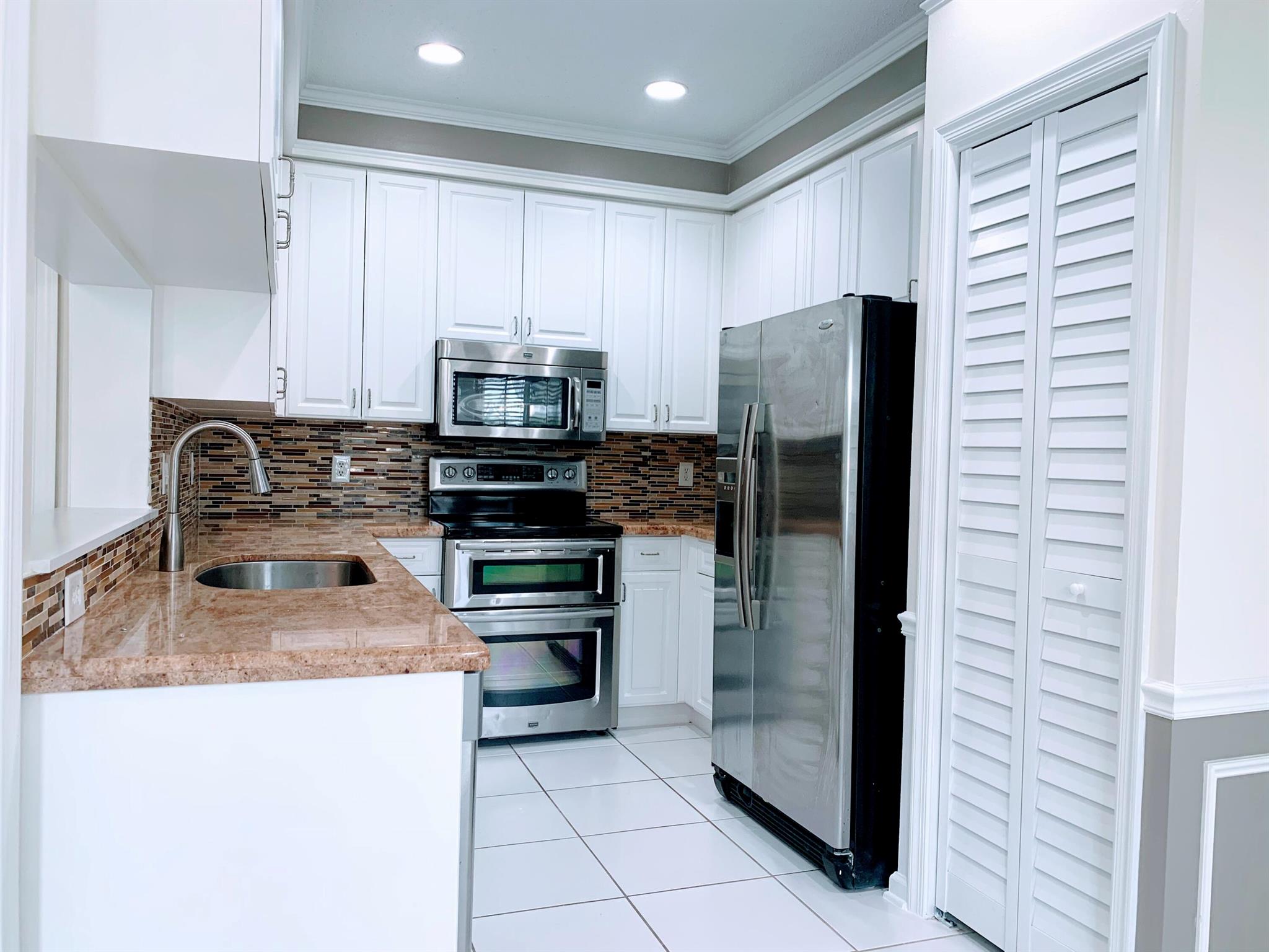 Charming, Light-Filled & Spacious Corner Townhouse in a Peaceful Gated Community. This 3-bedroom, 2.5-bathroom home is conveniently located just steps from Town Center Mall. With a 2-car garage. The home features soaring ceilings, beautiful crown molding, and a kitchen with granite counter tops and newer stainless steel appliances. The flooring combines tile and laminate for a modern touch. The generous master suite includes a substantial walk-in closet and a master bathroom with dual sinks, a separate shower, and a relaxing tub. Two additional bedrooms and a laundry room on the second floor complete this home. Fully hurricane-protected with accordion shutters, this townhouse is ideally situated close to I-95, the Turnpike, and is zoned for excellent A-rated schools.