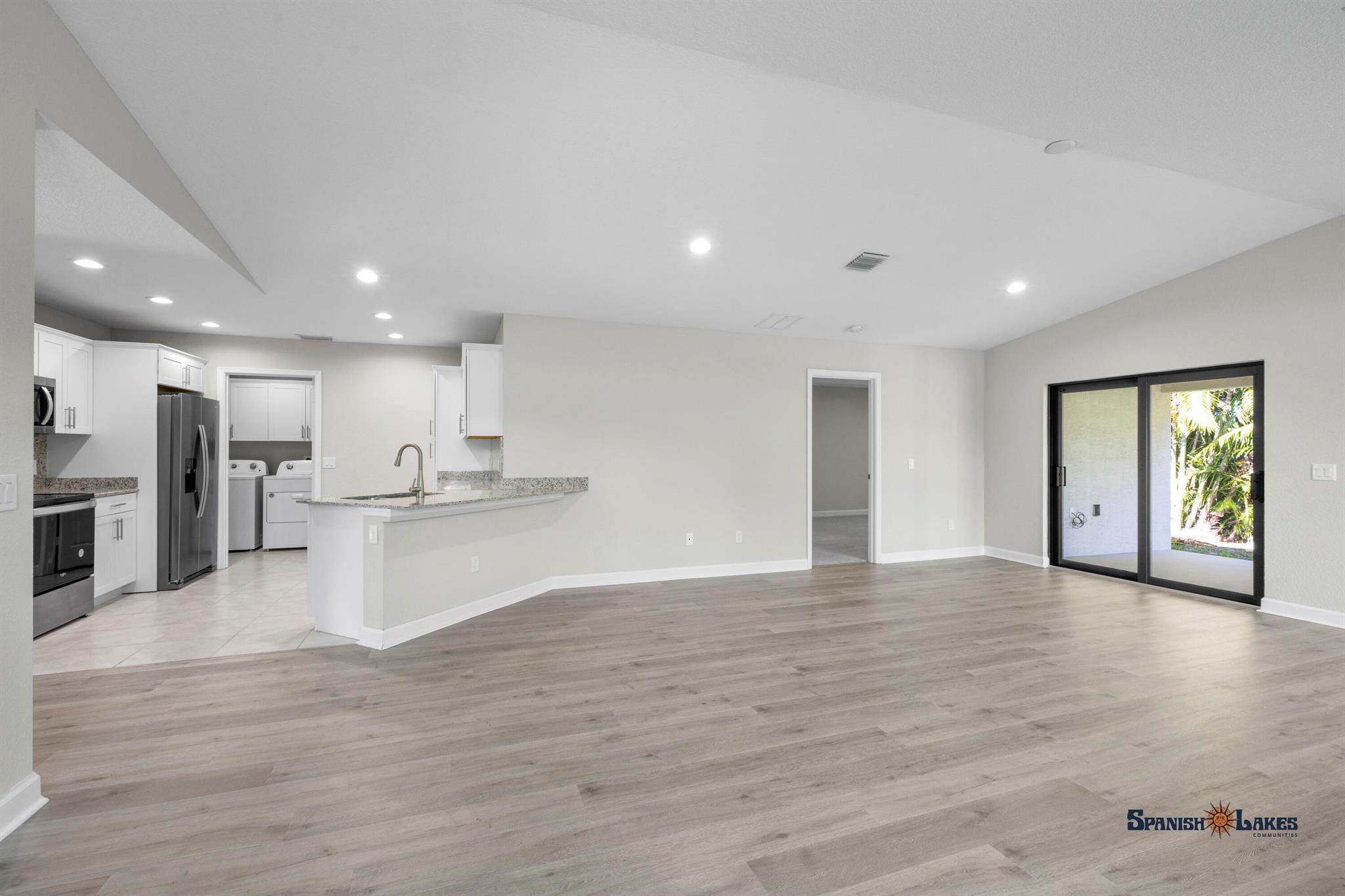 Discover true Florida living in the 2-bedroom, 2-bath Carlton model featuring a spacious layout, soaring vaulted ceilings, a covered front porch, and attached garage. Built with solid concrete block, this home boasts quartz counters, stainless steel appliances, and elegant finishes. The split-bedroom design ensures privacy while the open living area flows perfectly for entertaining. This move-in-ready home was built with 3/16th true plywood roof sheathing, hurricane tie straps, R-30 insulation, and hip roof designs ensuring big insurance premium discounts. Our homes also come equipped with energy efficient appliances, keypad door locks, a continuous quartz kitchen backsplash, plus durable and stylish 36-inch wood cabinets with a built-in pantry. Fixed Monthly Maintenance: $599/mo.