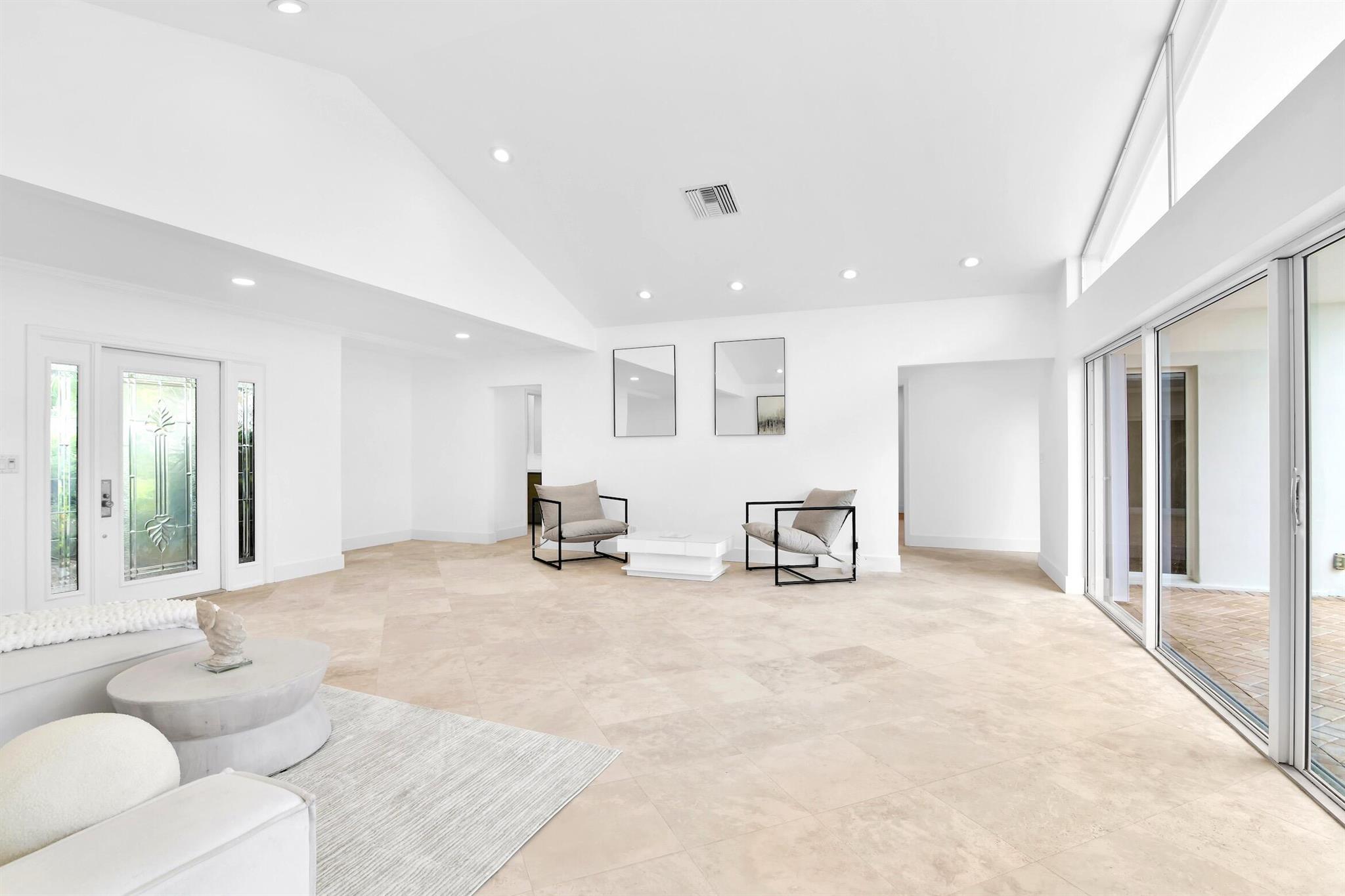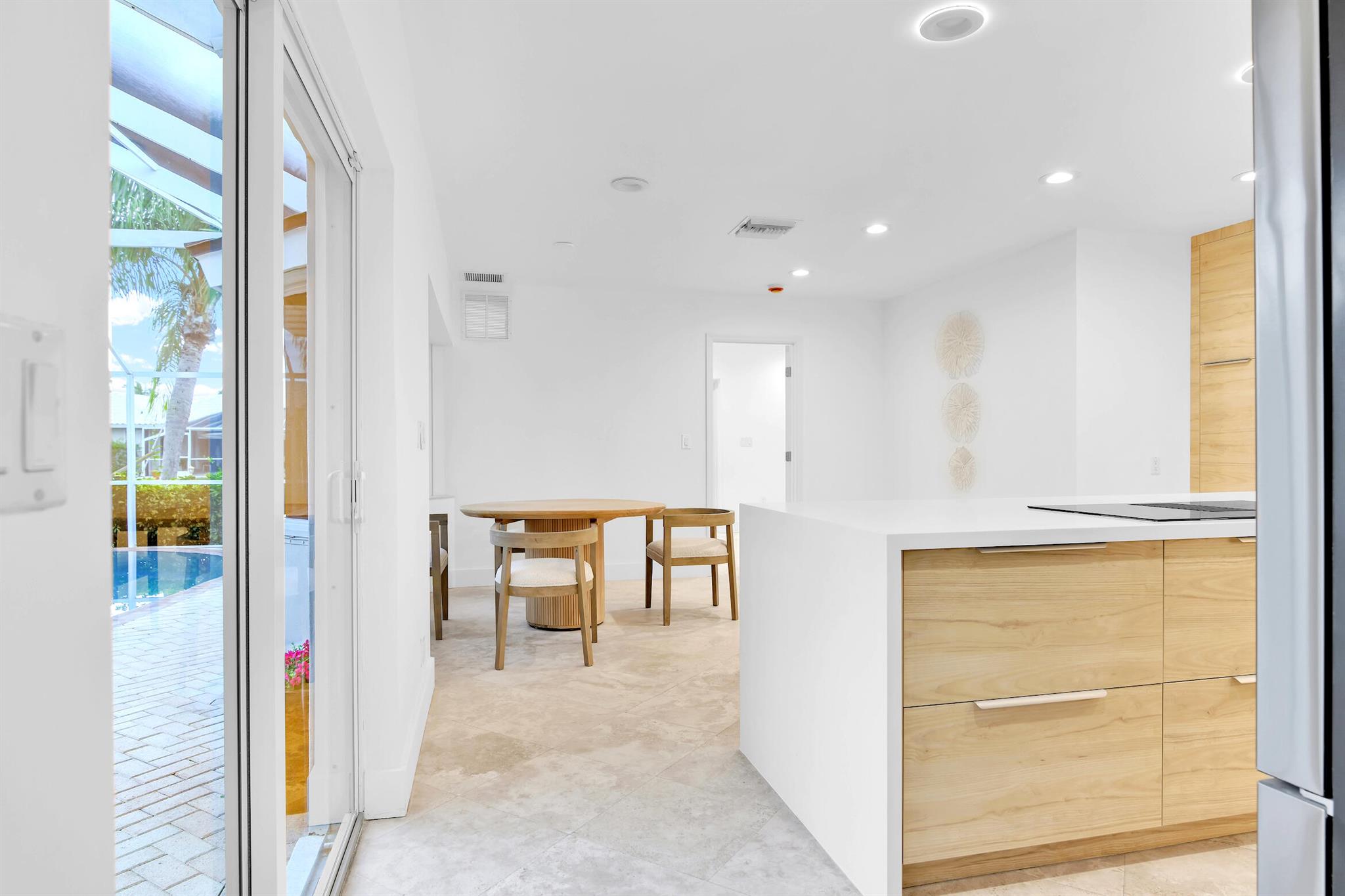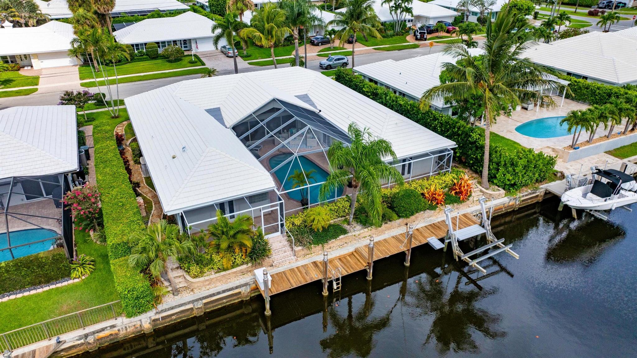 A rare, newly renovated Camino Gardens waterfront residence with 85+/- ft of frontage and ocean access. Features include a new kitchen and baths, sleek marble floors, vaulted-ceiling living room, contemporary chef's kitchen with island and casual dining, plus a versatile office/guest suite/gym. The primary suite offers pool access, a spa bath with freestanding tub, curbless shower, and custom closet. Two guest bedrooms have walk-ins. Outdoor living shines with a screened lanai, saltwater pool, and dock with lift and dual ramps. Additional perks: Wi-Fi irrigation, 2-bay garage with EV charger, new AC, new sewer pipelining, and newer roof. Ideally close to Mizner Park, dining, beaches, and A-rated schools.