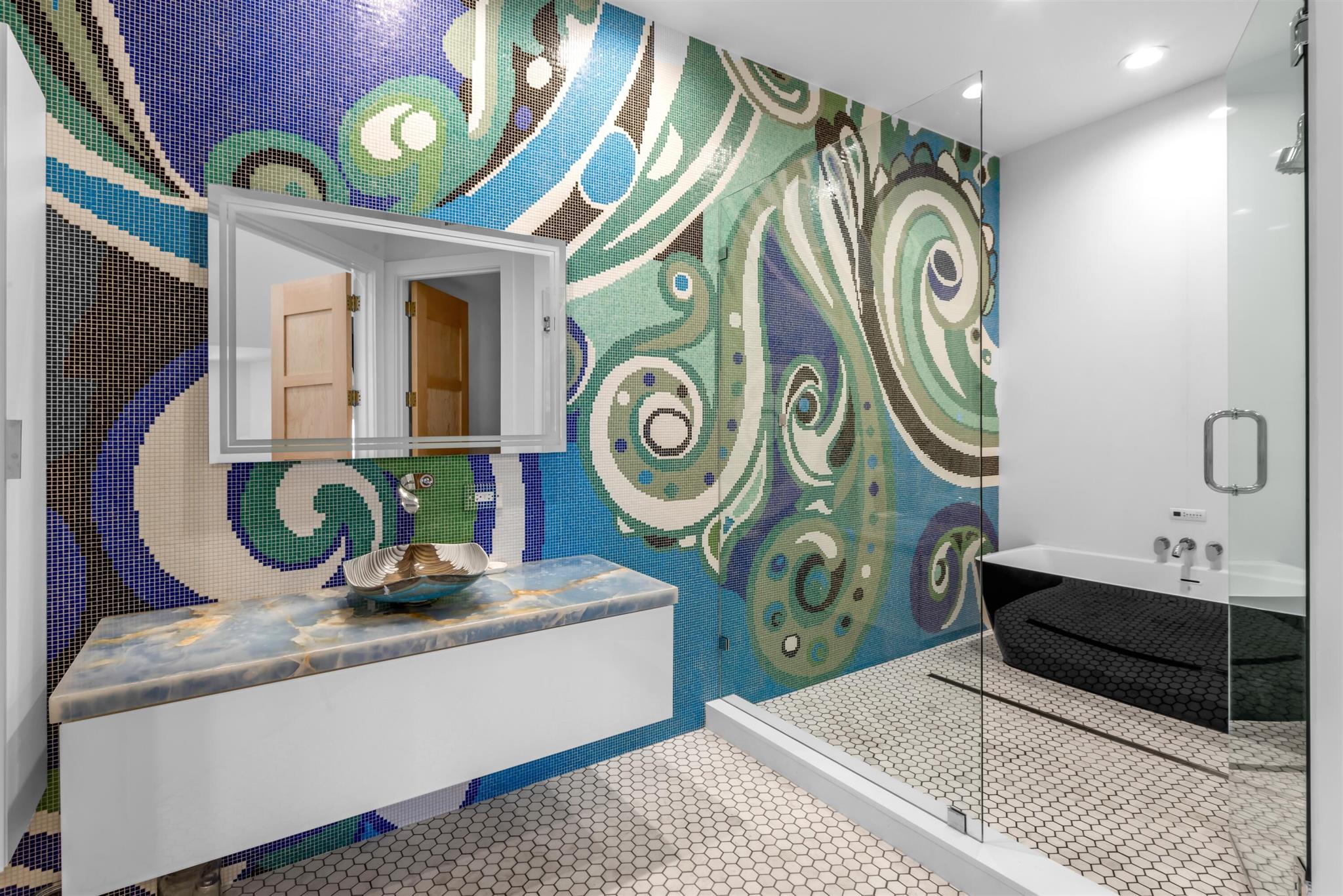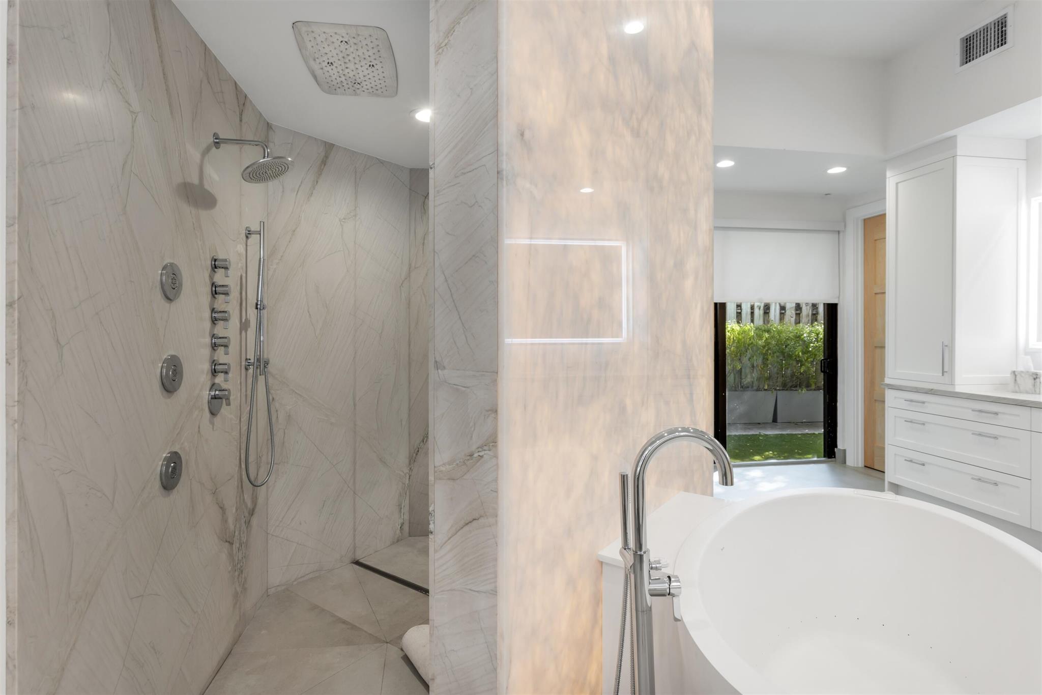 Blending contemporary architecture with lofty urban chic, this dramatic yachting estate offers a voluminous open floor plan with stunning interiors, serene water views, and direct ocean access. A massive glass grid entry with oversized custom double doors reveals a towering 30-foot foyer, which is a prelude to the voluminous expanse of this open-plan design. A skylit gallery sitting area is framed by twin suspended staircases with open cable rails and recessed stair lights. The dining area offers a floor-to-ceiling expansive grid window wall view of the sun-drenched pool and waterway. Soaring shiplap walls and bleached oak designed porcelain floors provide a modern farmhouse ambience.
