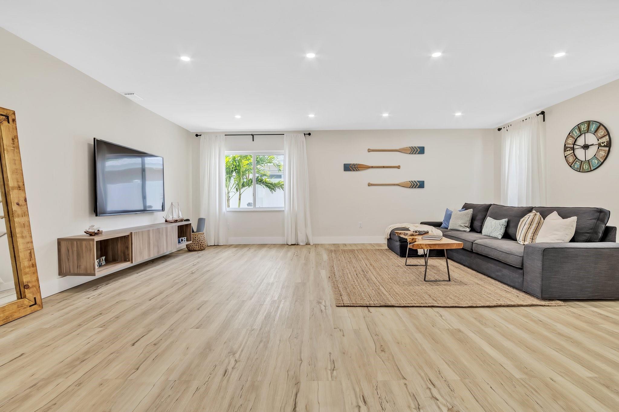 Welcome to this beautifully renovated 4-bedroom, 2-bath home in East Hollywood! Step into the oversized living room, perfect for entertaining, with flat ceilings and new flooring that add modern elegance. A versatile den works as a home office or game room. The updated kitchen boasts stainless steel appliances, an eat-in bar, and a separate dining area. Bathrooms feature a sleek black-and-white design with clean lines. Outside, enjoy a spacious backyard—large enough for a pool—already outfitted with artificial grass, seating area, fire pit, and awning. Ample parking makes hosting easy. Move-in ready and designed for comfort inside and out! Close to downtown Hollywood and the beaches.