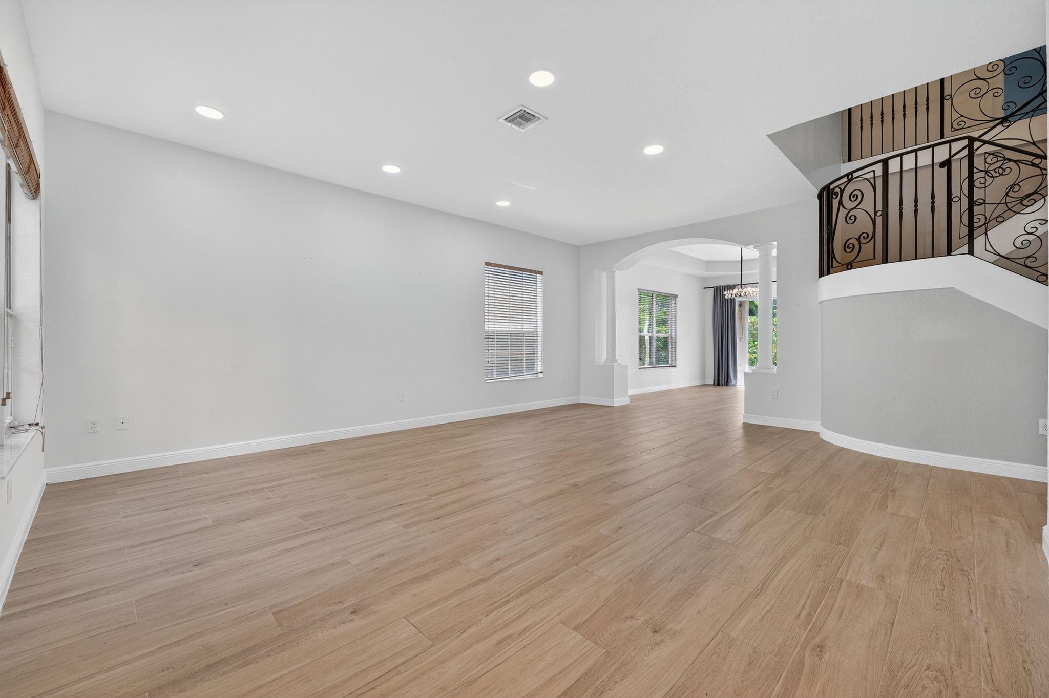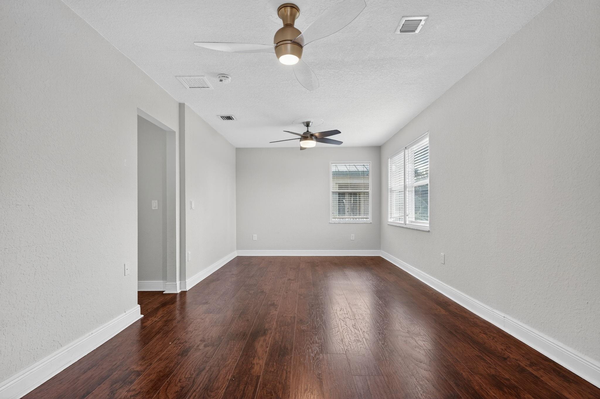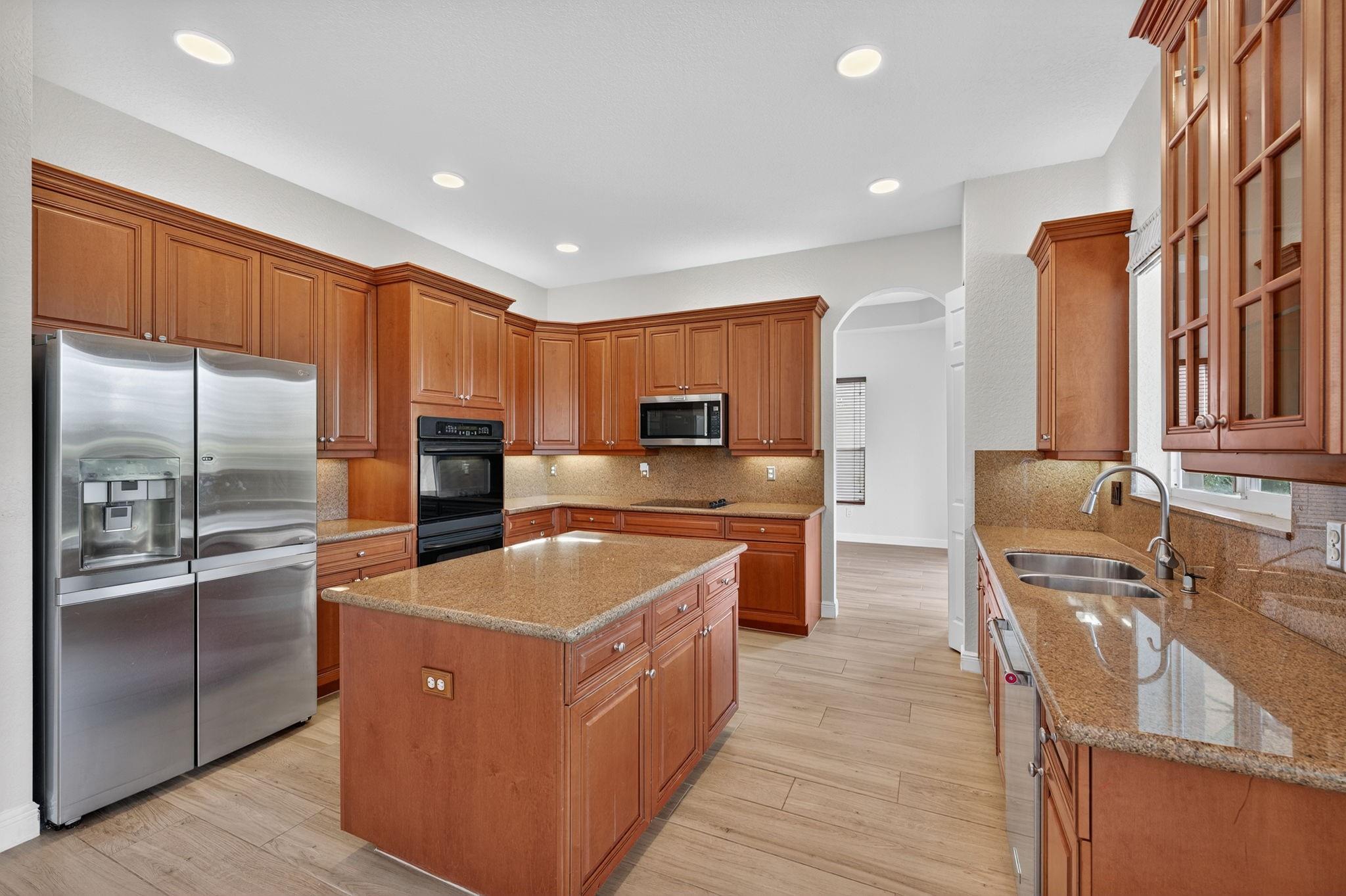 Beautiful 5 Bedroom or 6 Bedroom and 4 Bathroom home w/pool & canal views! Features double-door entry, 3-car garage & S-tile concrete roof. 1st floor offers wood-look porcelain tile, spacious living & dining rooms w/tray ceilings, gourmet kitchen w/wood cabinets, SS appliances, granite counters, pantry & breakfast area. Full bed & bath downstairs. Primary suite boasts tray ceilings, walk-in closets & luxury bath w/Jacuzzi, shower & dual vanities. Two en-suite bedrooms upstairs. Backyard oasis w/pool, child safety fence, pavered patio, fruit trees & privacy hedge. Easily convert back to 6BR. Hurricane shutters, laundry room w/sink, cabinets & W/D.