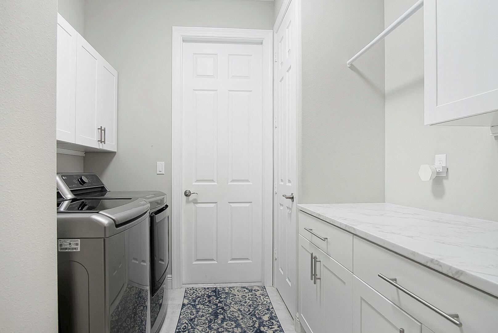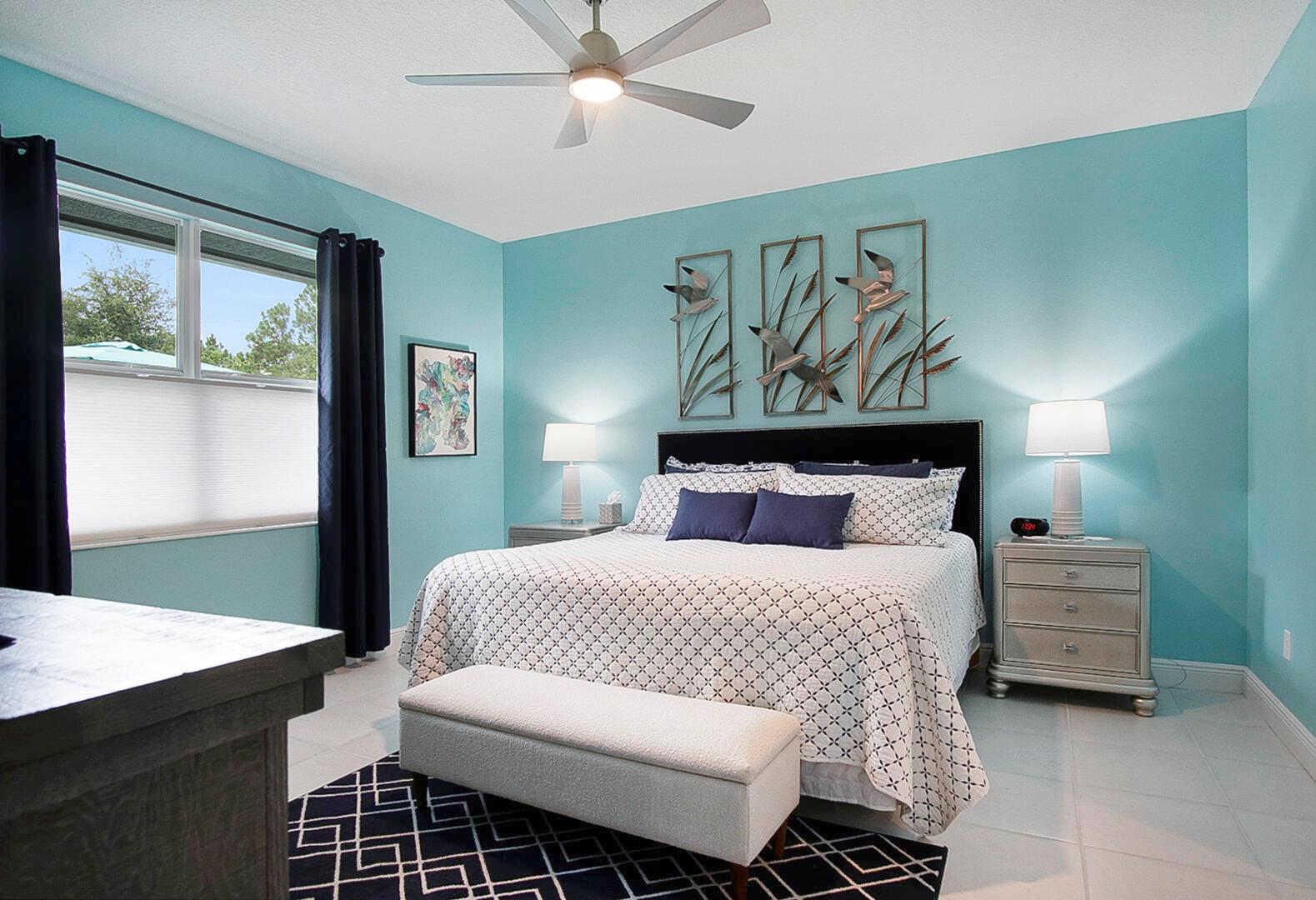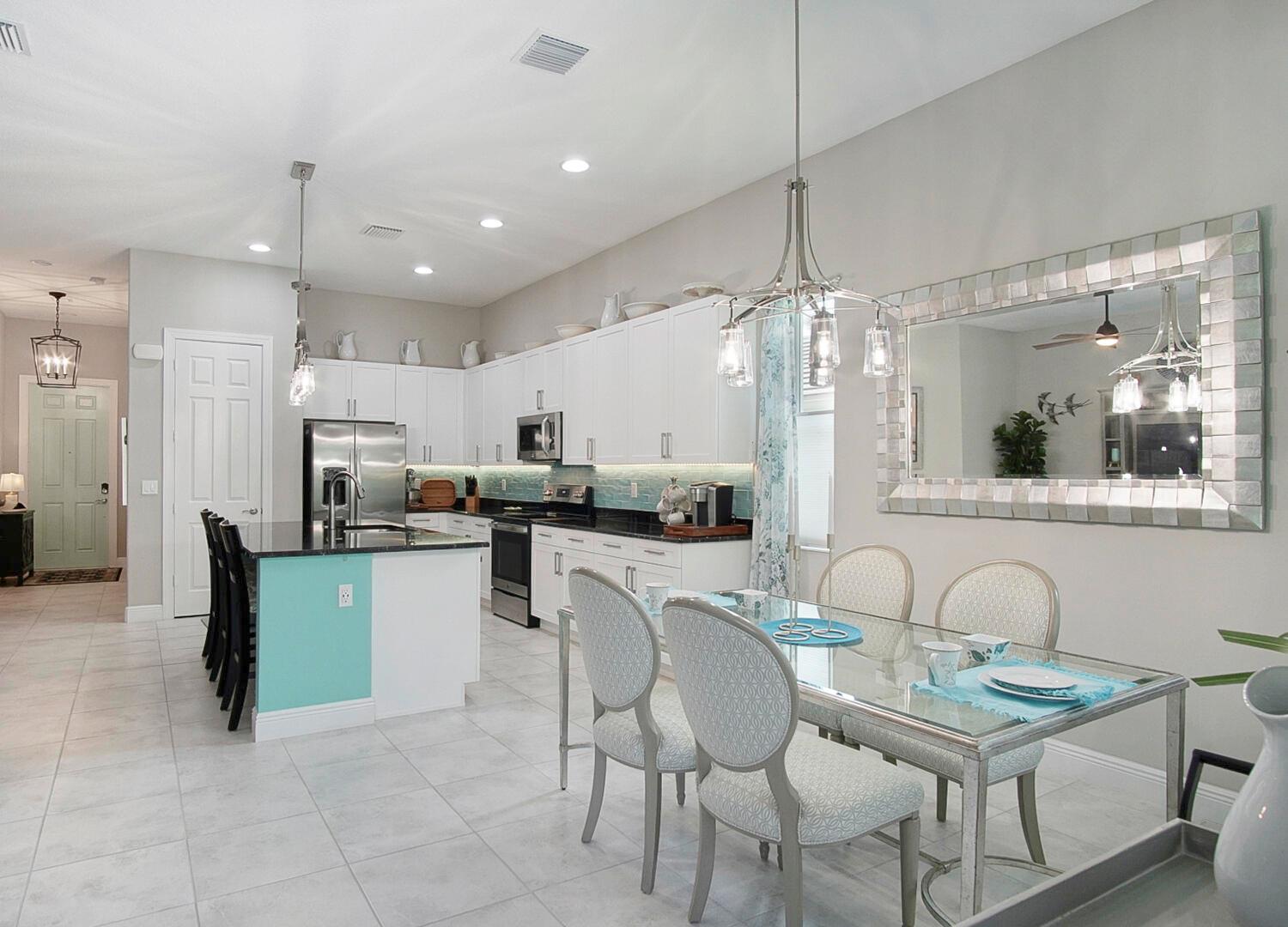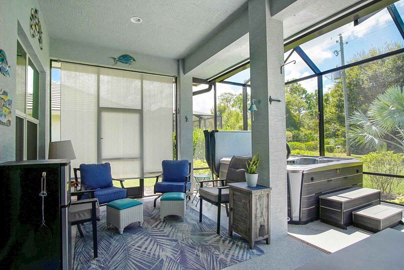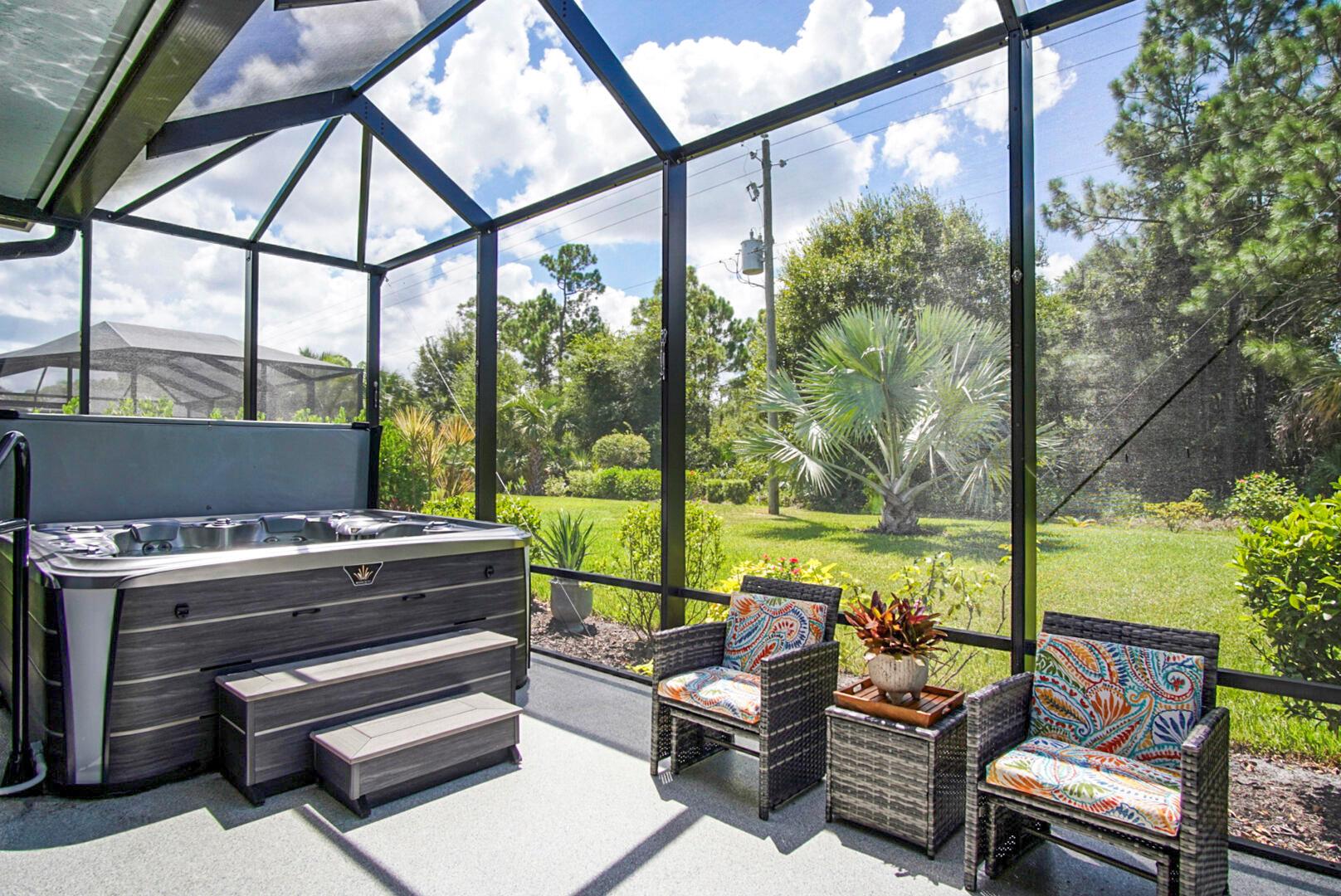 Beautifully appointed 2/2/2 home with a large den that can easily be converted into a 3rd bedroom. Pristine white kitchen cabinets, large island, granite countertops, tile backsplash and upgraded stainless steel appliances. Large welcoming master suite, two closets the walk-in closet has a California closet system. Large master bath has dual sinks, oversized shower and private toilet. Tile throughout the bright open floor plan's main living area. There is carpet in the guest bedroom and den. The living area leads out to a large extended screened Lani with a beautiful micro silk hot tub. There is an additional paved patio for enhanced outdoor living. Oversized 2 car garage with a golf cart door, epoxy floor and extra storage in the spray foam insulated attic. Feel safe with high impact