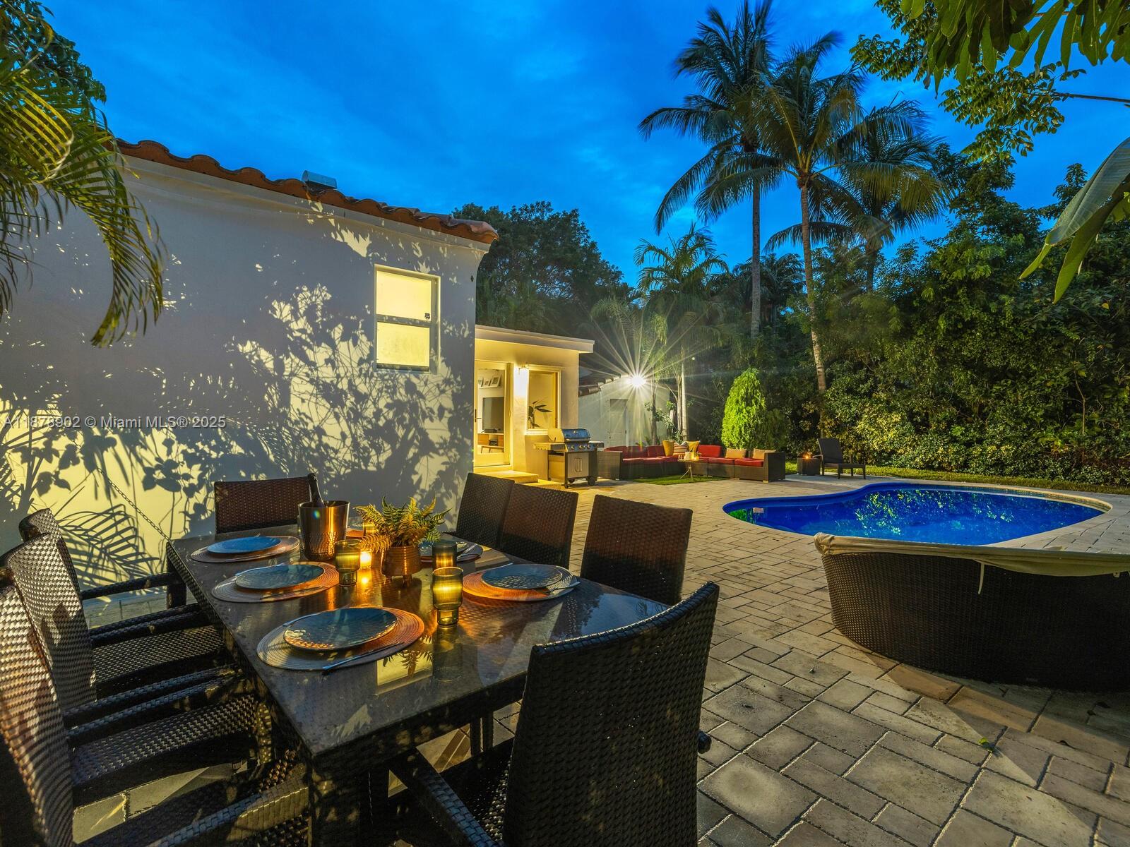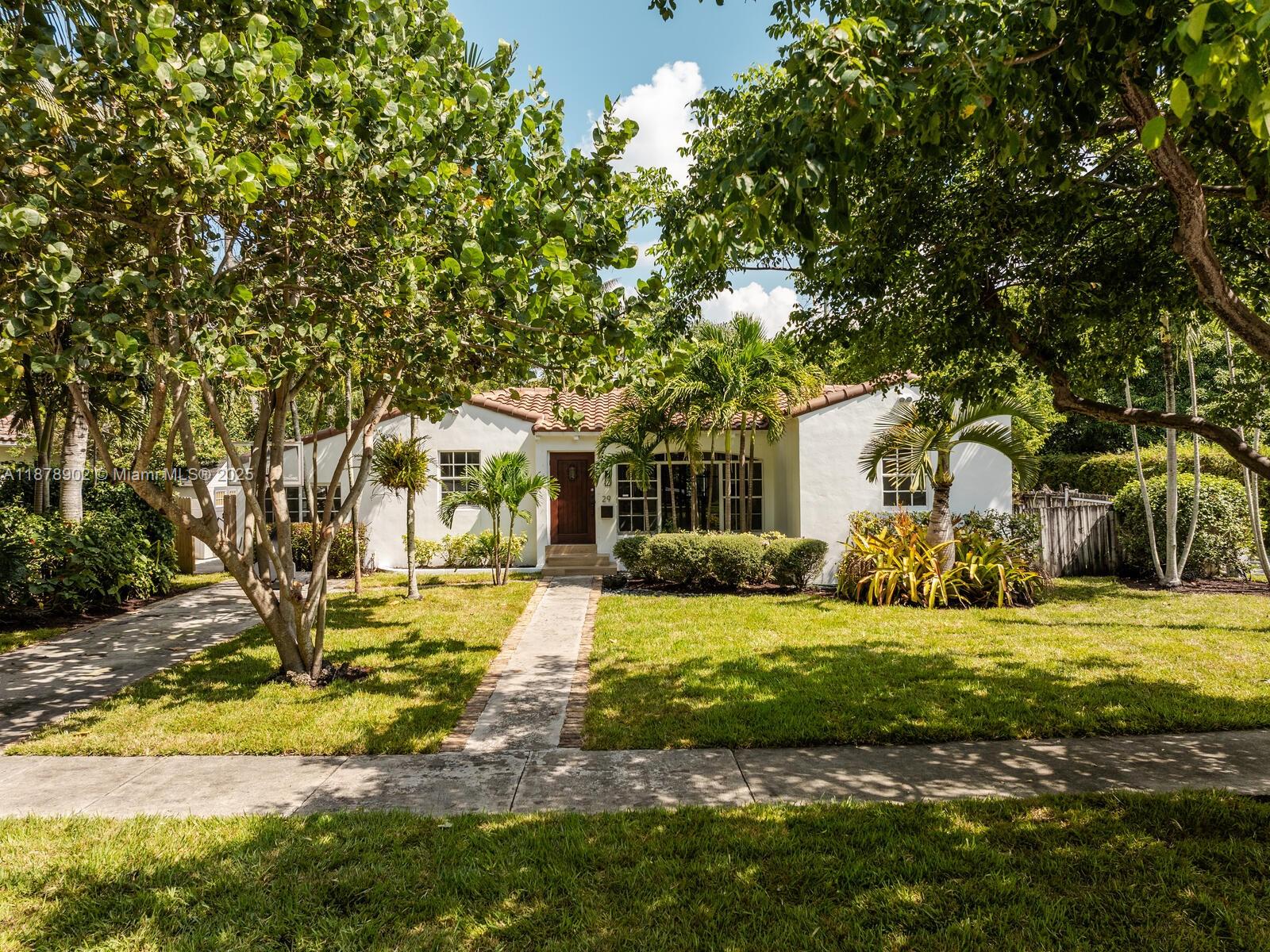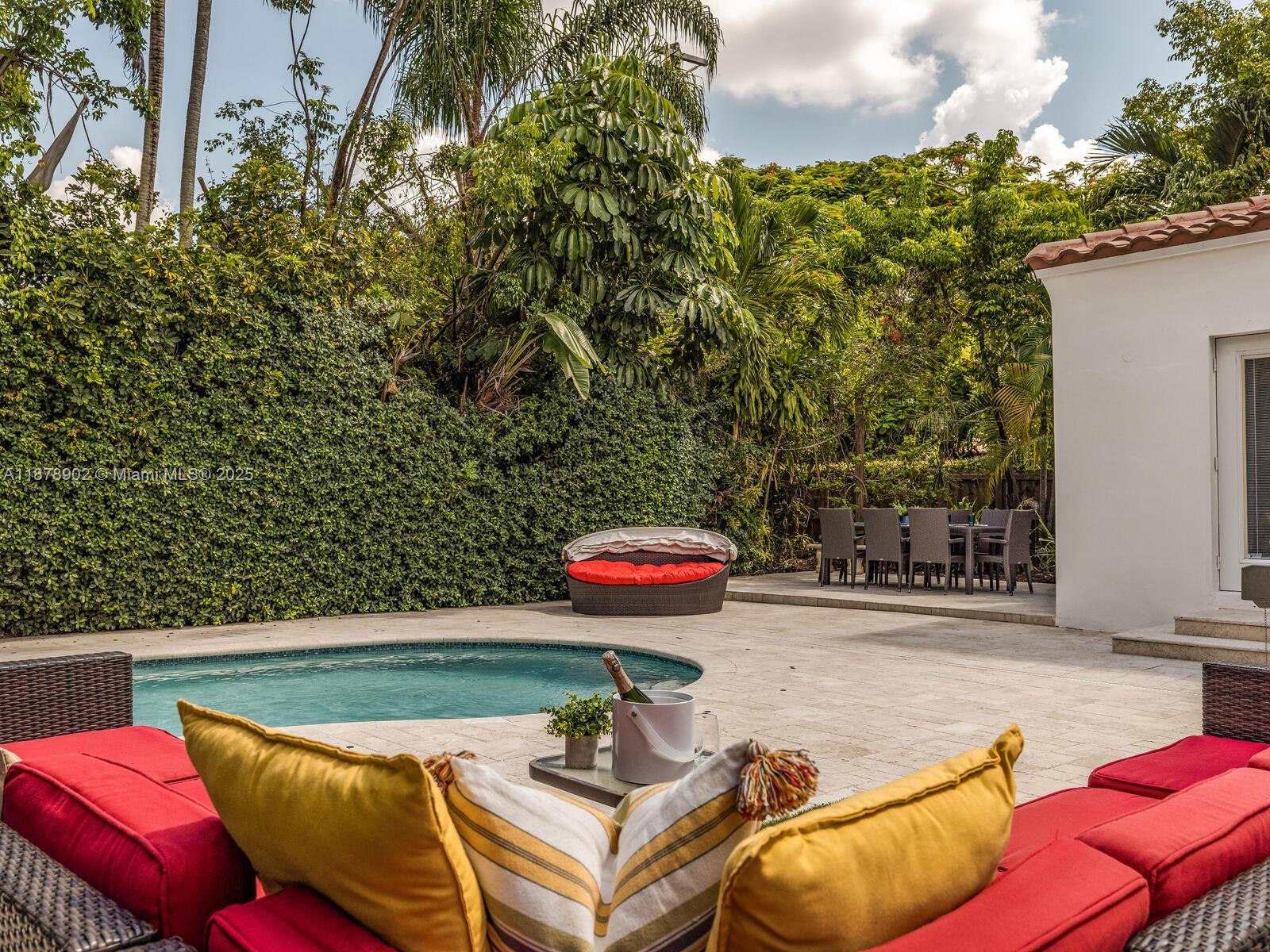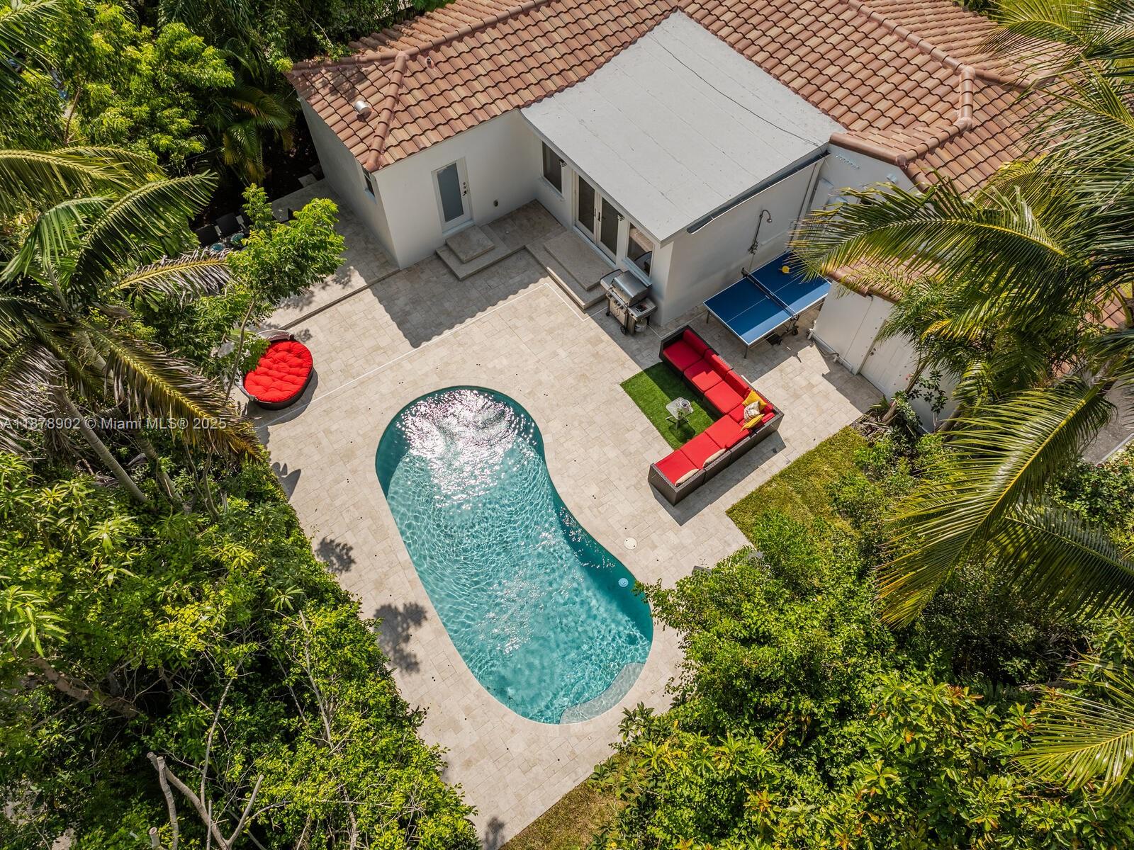 Fabulous location, updates and character await you in this 4-bedroom, 1,917 SF Miami Shores pool home. Welcome to The Seagrape Escape! Fantastic flowing interiors: entrance foyer; bright sunroom; vaulted beamed ceiling dining; newer quartz counter island kitchen with wine bar + cooler and storage galore; breakfast nook; plus rear media room opening to private gardens, sparkling “boomerang pool” and entertainment decks. Sleep easy in the rear primary ensuite with walk-in closet, spa-like bath and cabana door to pool—plus, two east wing bedrooms + bath; and a fourth “flex” west wing ensuite bedroom, perfect for guests, office, or studio/gym. A great value, with a new roof, ceramic plank and travertine floors, and the signature seagrape tree in the front, just blocks to Downtown Shores.