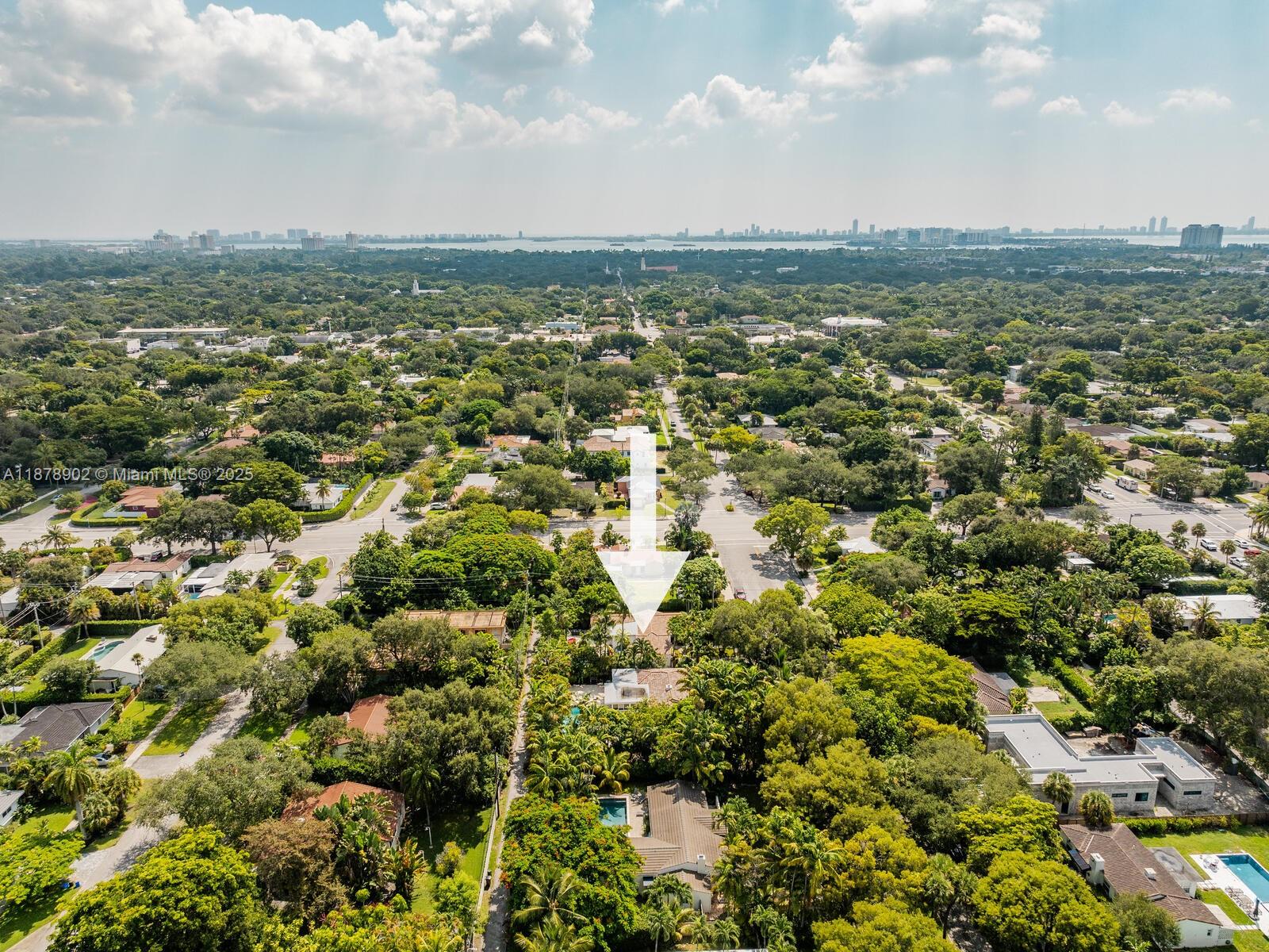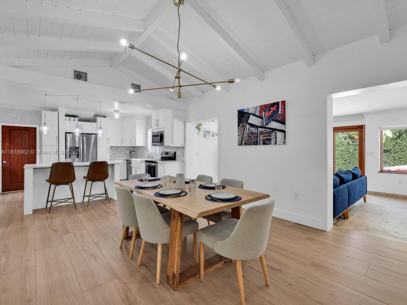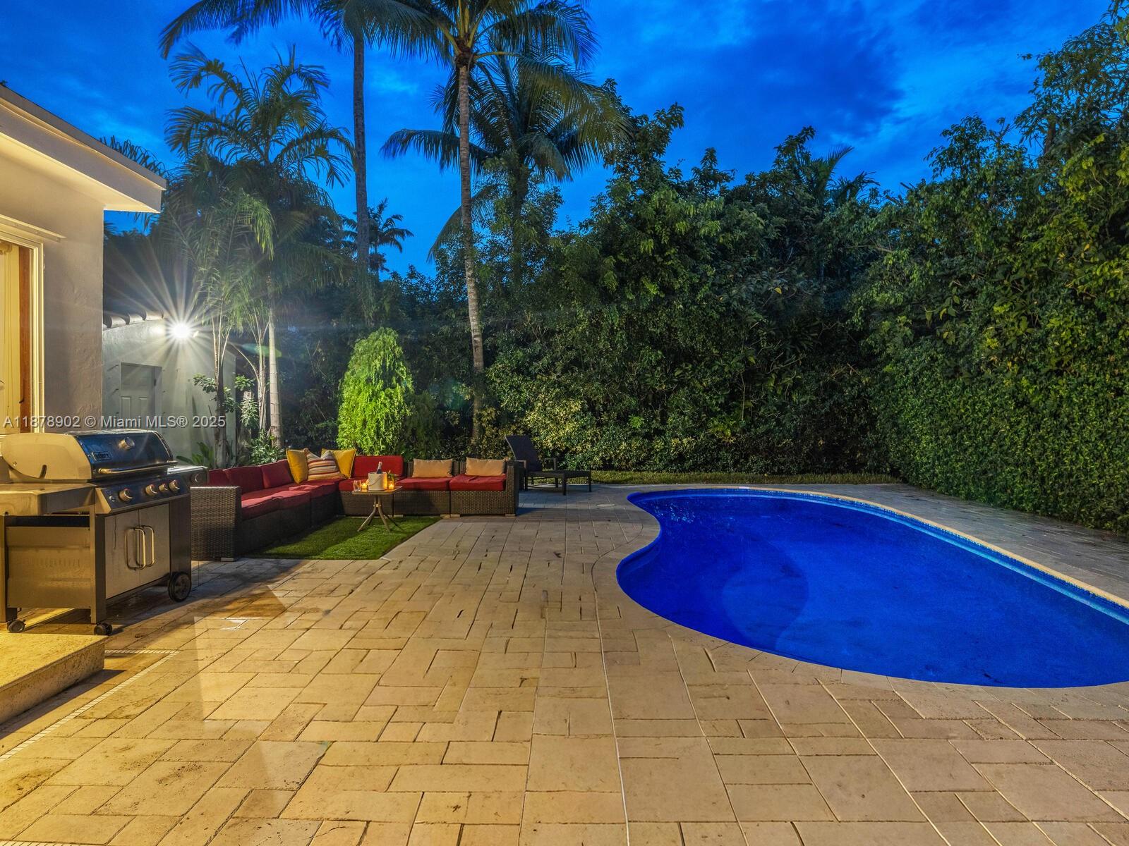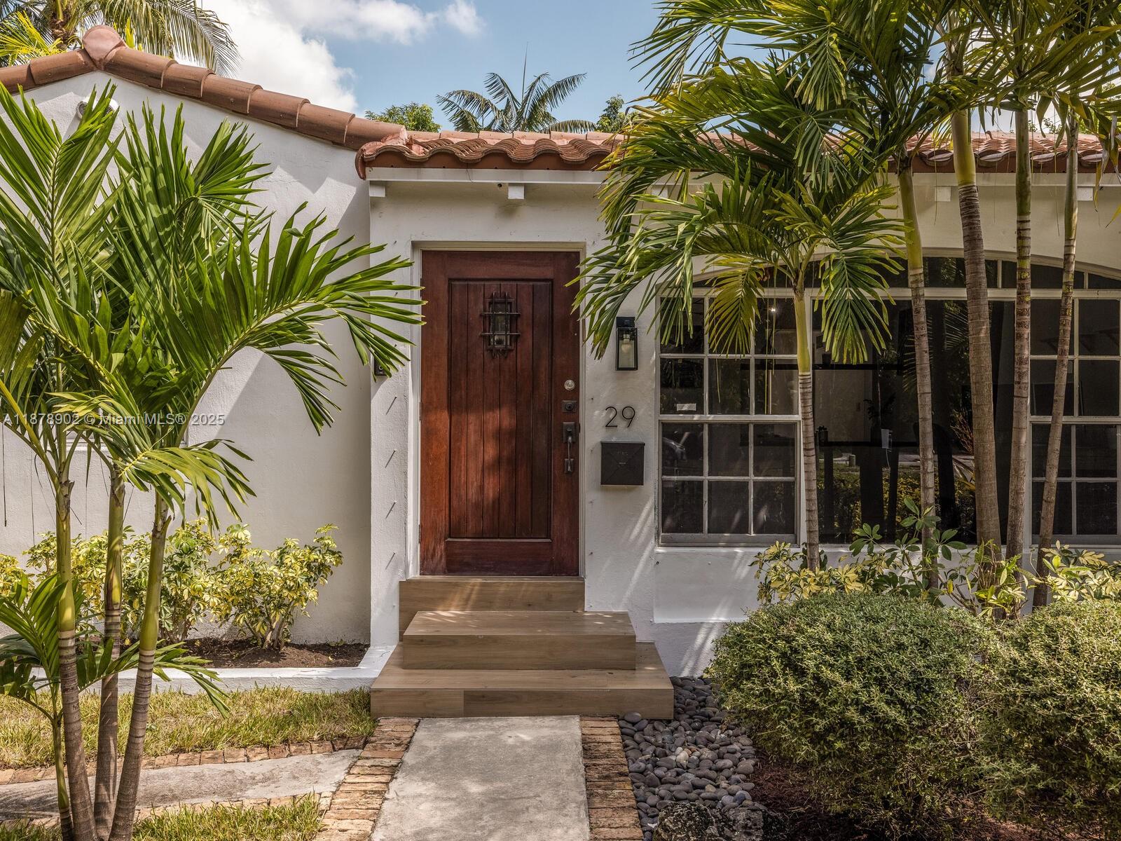 Fabulous location, updates and character await you in this 4-bedroom, 1,917 SF Miami Shores pool home. Welcome to The Seagrape Escape! Fantastic flowing interiors: entrance foyer; bright sunroom; vaulted beamed ceiling dining; newer quartz counter island kitchen with wine bar + cooler and storage galore; breakfast nook; plus rear media room opening to private gardens, sparkling “boomerang pool” and entertainment decks. Sleep easy in the rear primary ensuite with walk-in closet, spa-like bath and cabana door to pool—plus, two east wing bedrooms + bath; and a fourth “flex” west wing ensuite bedroom, perfect for guests, office, or studio/gym. A great value, with a new roof, ceramic plank and travertine floors, and the signature seagrape tree in the front, just blocks to Downtown Shores.
