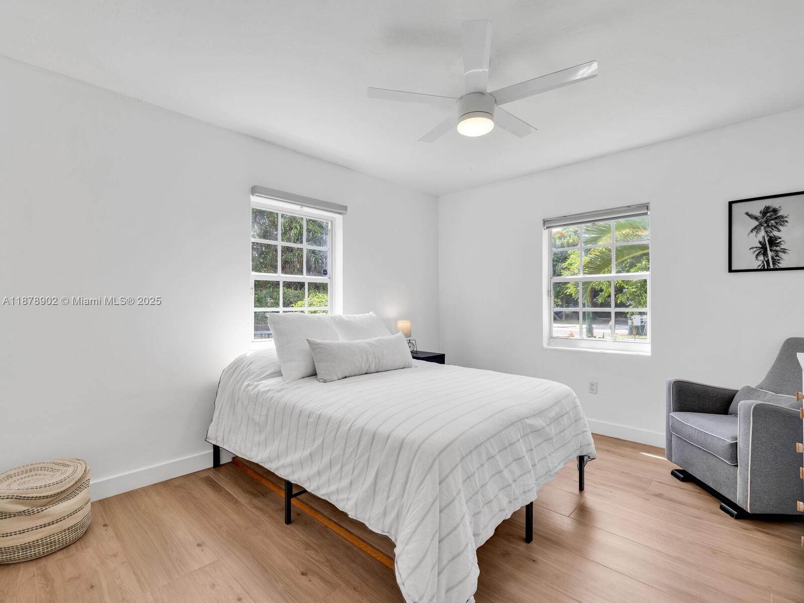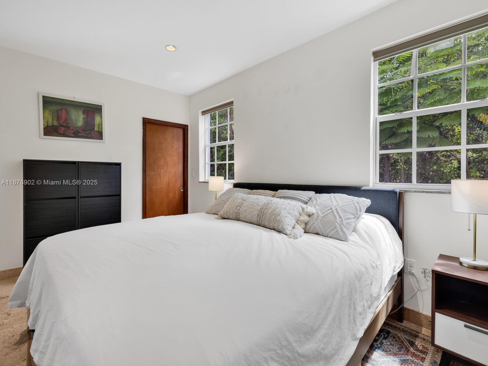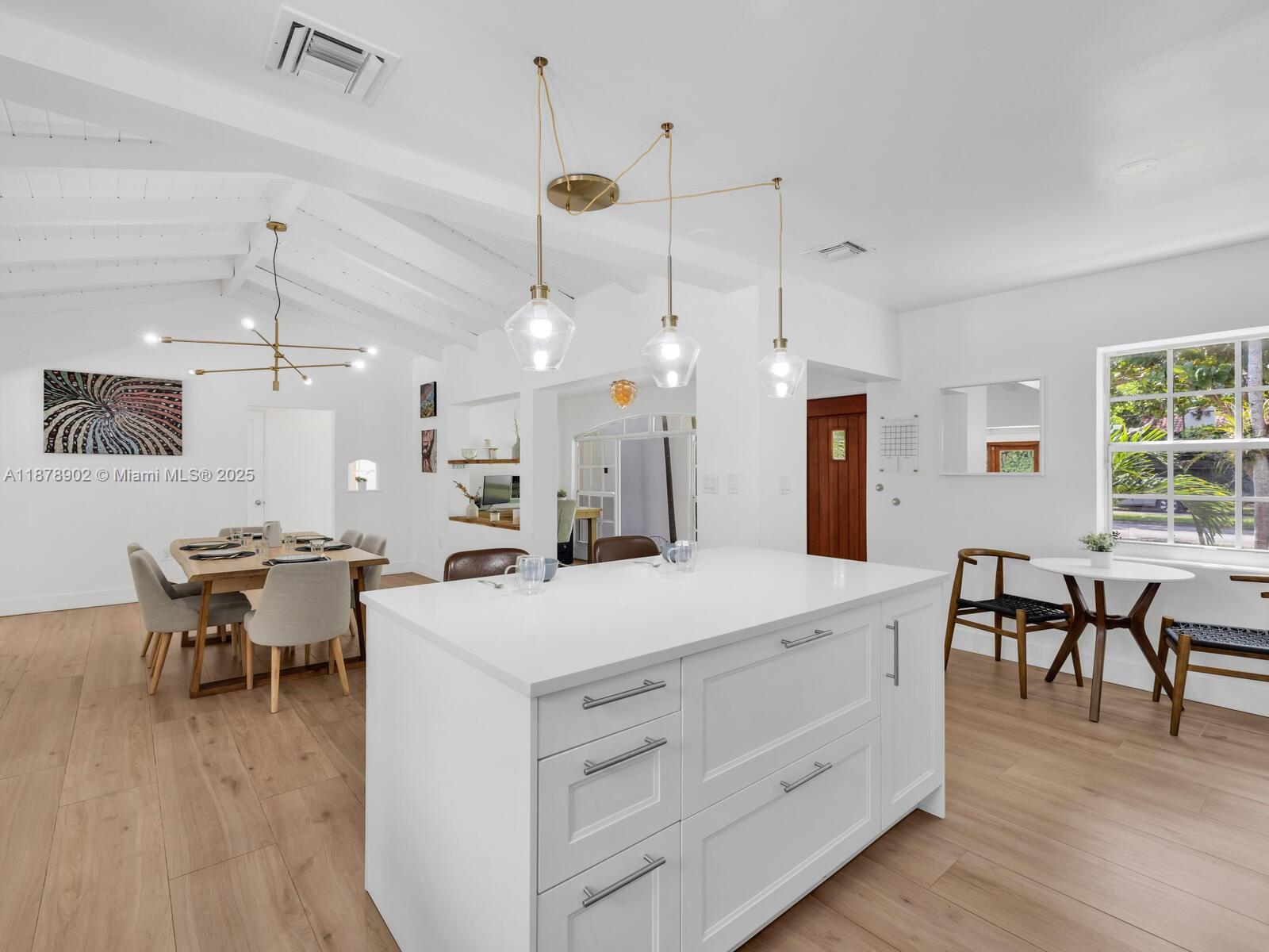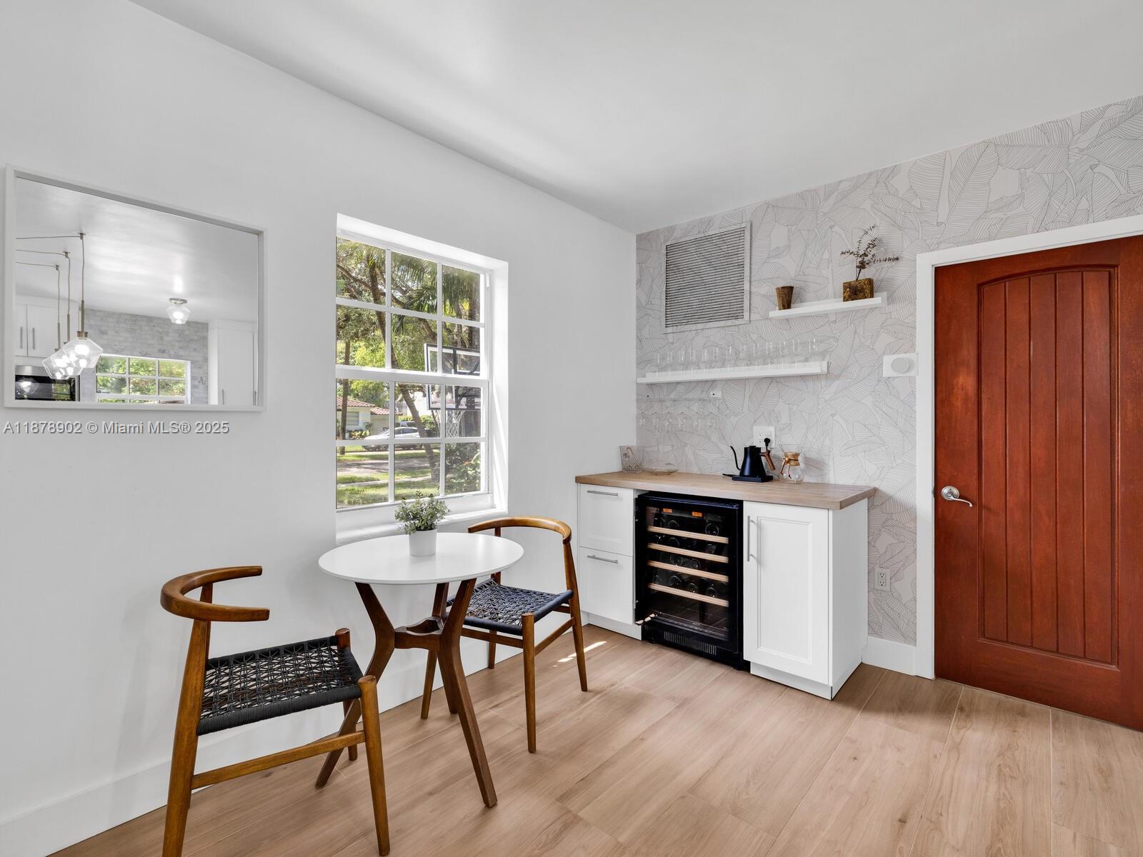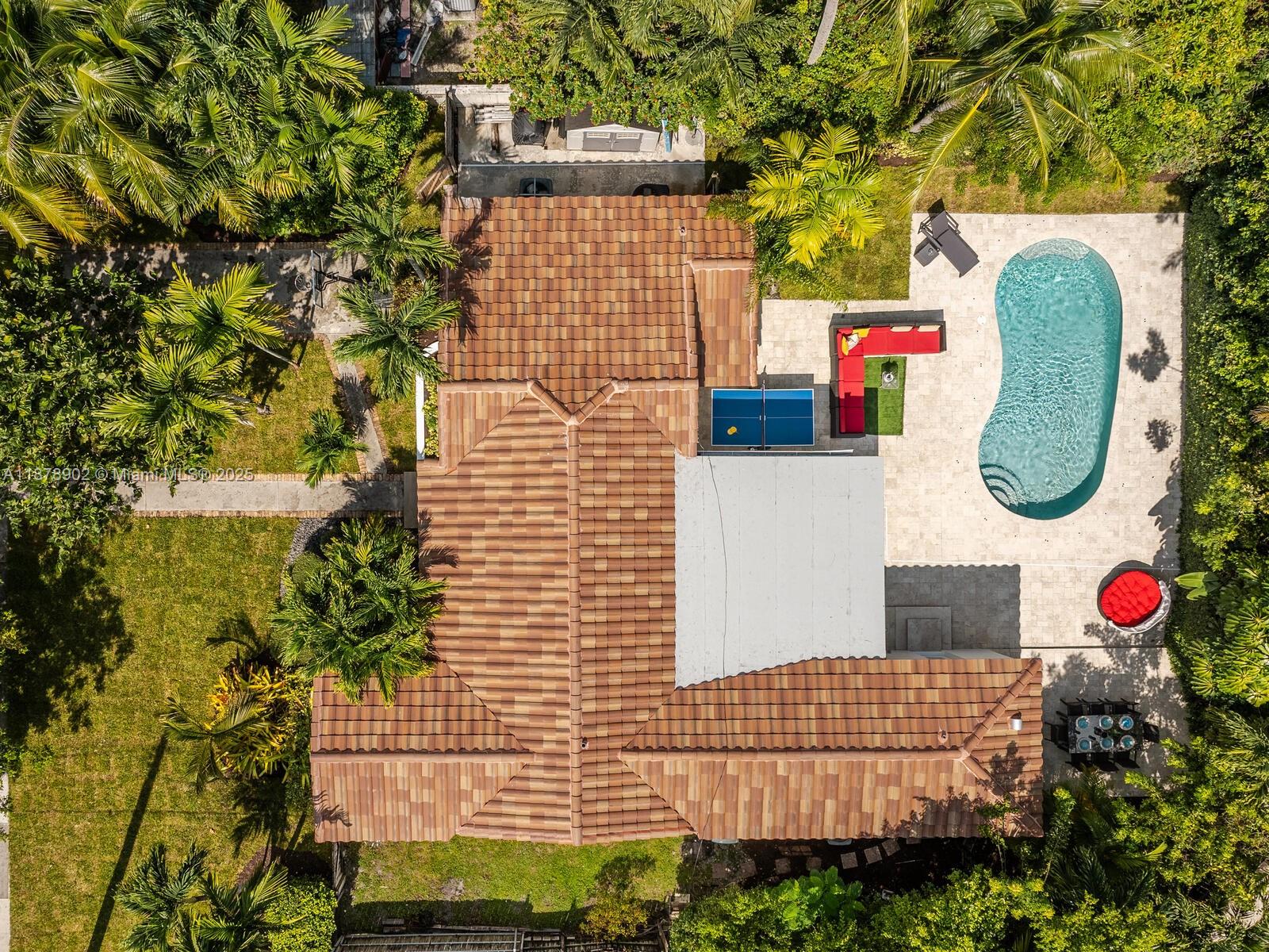 Fabulous location, updates and character await you in this 4-bedroom, 1,917 SF Miami Shores pool home. Welcome to The Seagrape Escape! Fantastic flowing interiors: entrance foyer; bright sunroom; vaulted beamed ceiling dining; newer quartz counter island kitchen with wine bar + cooler and storage galore; breakfast nook; plus rear media room opening to private gardens, sparkling “boomerang pool” and entertainment decks. Sleep easy in the rear primary ensuite with walk-in closet, spa-like bath and cabana door to pool—plus, two east wing bedrooms + bath; and a fourth “flex” west wing ensuite bedroom, perfect for guests, office, or studio/gym. A great value, with a new roof, ceramic plank and travertine floors, and the signature seagrape tree in the front, just blocks to Downtown Shores.