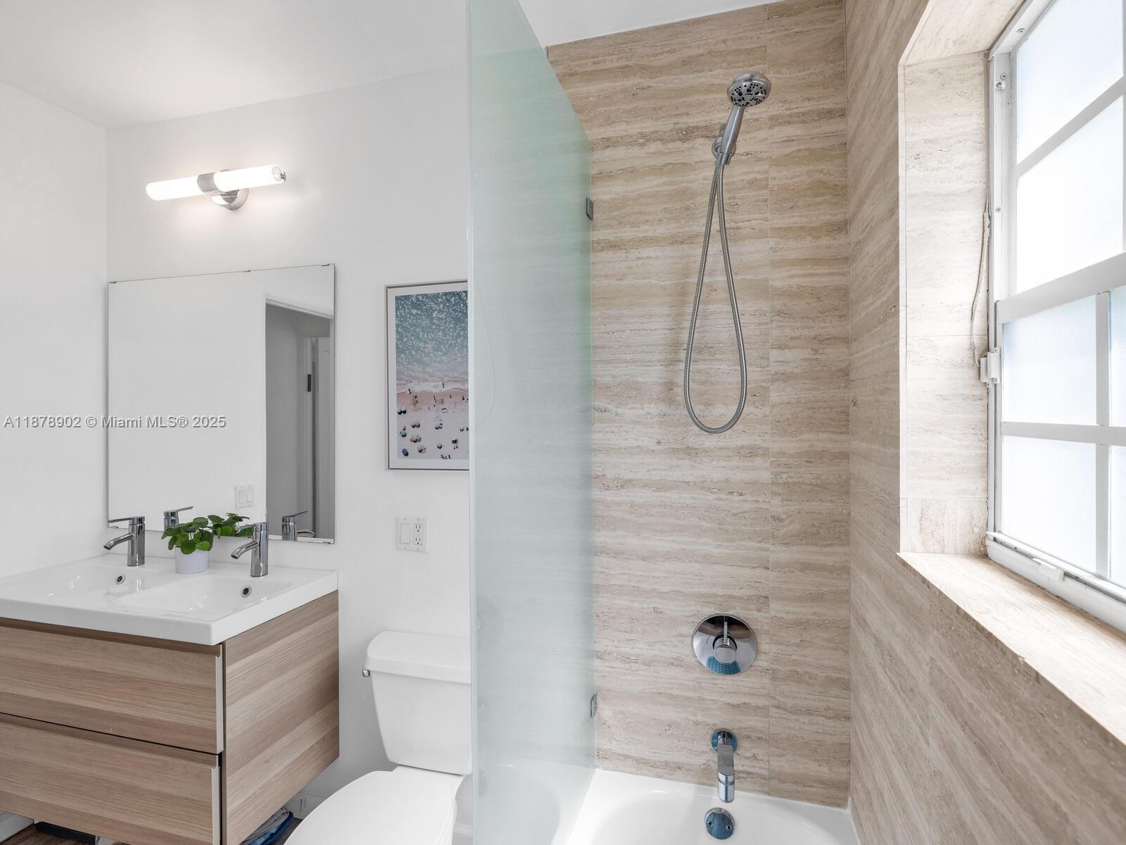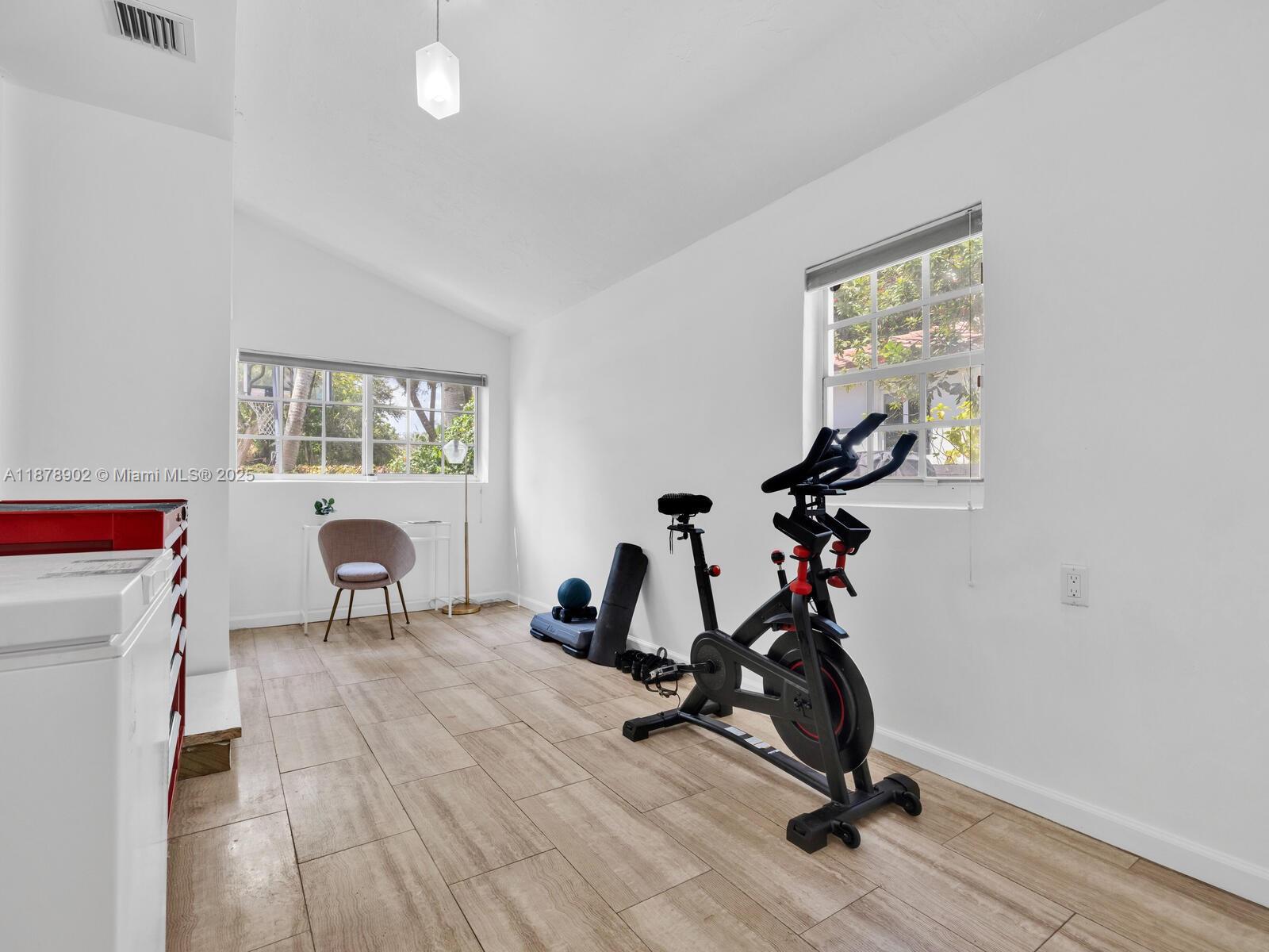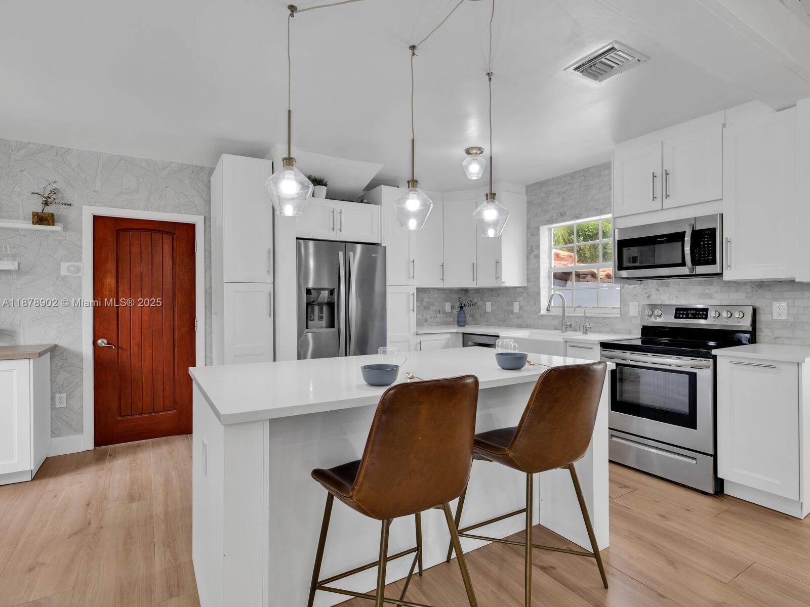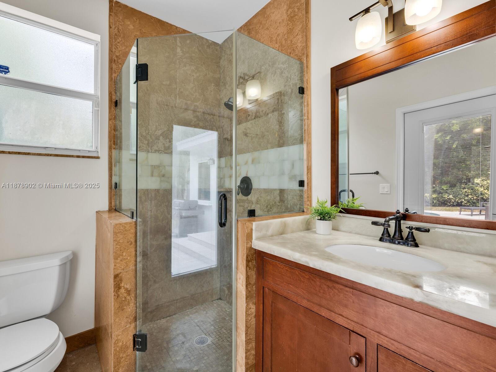 Fabulous location, updates and character await you in this 4-bedroom, 1,917 SF Miami Shores pool home. Welcome to The Seagrape Escape! Fantastic flowing interiors: entrance foyer; bright sunroom; vaulted beamed ceiling dining; newer quartz counter island kitchen with wine bar + cooler and storage galore; breakfast nook; plus rear media room opening to private gardens, sparkling “boomerang pool” and entertainment decks. Sleep easy in the rear primary ensuite with walk-in closet, spa-like bath and cabana door to pool—plus, two east wing bedrooms + bath; and a fourth “flex” west wing ensuite bedroom, perfect for guests, office, or studio/gym. A great value, with a new roof, ceramic plank and travertine floors, and the signature seagrape tree in the front, just blocks to Downtown Shores.